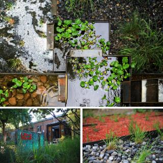 在硬景方面,運用生態(tài)石籠、鋼板、水泥等與園區(qū)氛圍相契合的材料;在軟景方面,保留現(xiàn)場兩棵白蠟樹,配植耐水濕和耐干旱的低維護地被。在雨水花園初建成的8個月里,沒有主動澆灌,經(jīng)歷北京7、8月份的暴雨期,園中地下貯水池只收集到少量雨水,驗證了在大多數(shù)情況下,具有高滲透率的下墊面可實現(xiàn)花園內(nèi)雨水的自然滲透和零排放。