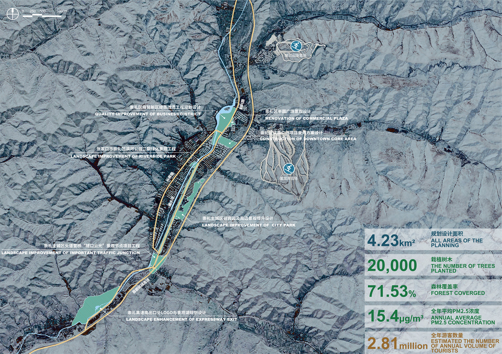 項(xiàng)目建成后為崇禮增設(shè)公園廣場(chǎng)12公頃,更新開放空間15公頃,覆綠裸露山體20公頃,栽植樹木20000余棵,整體打造出十景、一河、兩路、多點(diǎn)的城市風(fēng)貌空間結(jié)構(gòu),呈現(xiàn)出生態(tài)友好的人居環(huán)境和城景交融的小鎮(zhèn)風(fēng)貌。城市面貌的變化與更新,帶動(dòng)崇禮全域經(jīng)濟(jì)復(fù)蘇,從舊城轉(zhuǎn)變?yōu)樾腋;盍π℃?zhèn),給崇禮留下綠色可持續(xù)的冬奧遺產(chǎn),向世界展現(xiàn)崇禮的地域魅力和時(shí)代風(fēng)采。