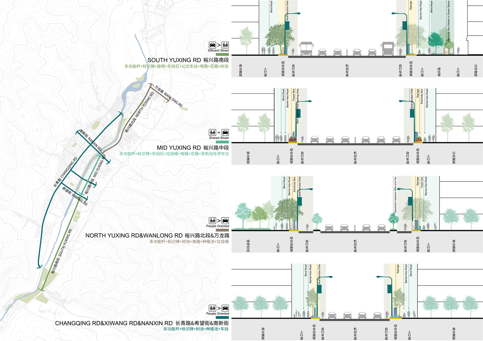 根據(jù)當(dāng)?shù)氐缆方煌l件,因地制宜提出設(shè)置綜合設(shè)施帶的設(shè)計(jì)理念,提升整體街道風(fēng)貌,為行人提供良好的慢行空間。分設(shè)無障礙、綠化及設(shè)施專用道,減少互相干擾,為未來設(shè)施增設(shè)預(yù)留空間。整體把控設(shè)施小品風(fēng)格,契合小鎮(zhèn)風(fēng)貌,展現(xiàn)崇禮特色。