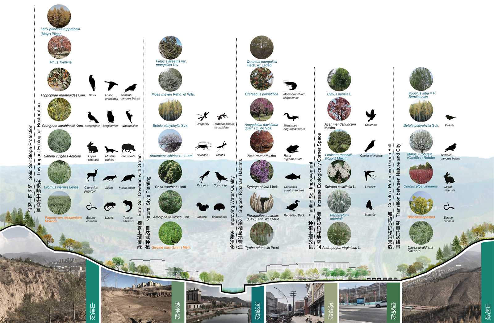 了解全域自然基底,明確生態(tài)修復(fù)需求,建立適合當(dāng)?shù)貥O寒氣候和地理?xiàng)l件的植物庫(kù),大量種植經(jīng)濟(jì)作物,降低維護(hù)成本,為動(dòng)物提供棲息地。種植20000多棵耐寒抗風(fēng)的本土植物品種,修復(fù)被城市建設(shè)破壞的自然山體。在城區(qū)中增加遮蔭覆蓋率,為市民營(yíng)造良好的生活環(huán)境。采用鄉(xiāng)土植物為主的自然式喬灌草復(fù)合型種植,通過針葉林與闊葉林的搭配保證四季景觀效果,營(yíng)造良好的河岸生境。