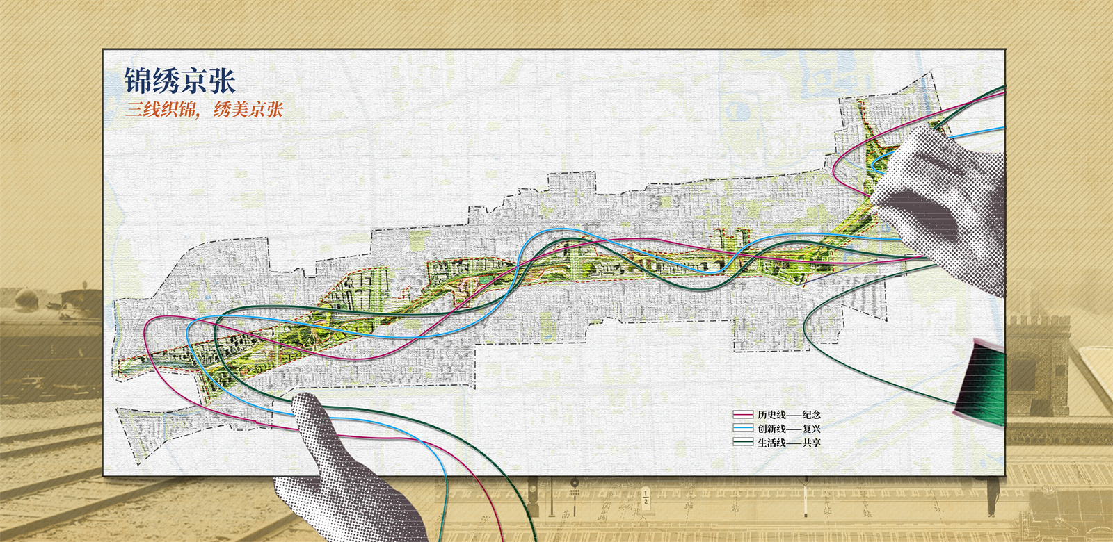 以三線織錦塑造繡美京張,提出三條主線——歷史線、生活線、創(chuàng)新線貫穿全園。