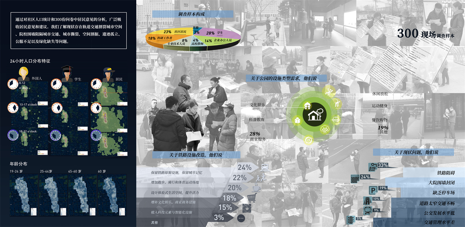 團隊走向街頭,經過300余次現(xiàn)場訪談和大量問卷調查,針對真實的社區(qū)生活需求進行規(guī)劃設計。秉承全民公園和全時公園的理念,體現(xiàn)慢行系統(tǒng)編織、實現(xiàn)城市邊界的滲透,設置無障礙設施、塑造四季景觀、提供24小時活動功能等內容。