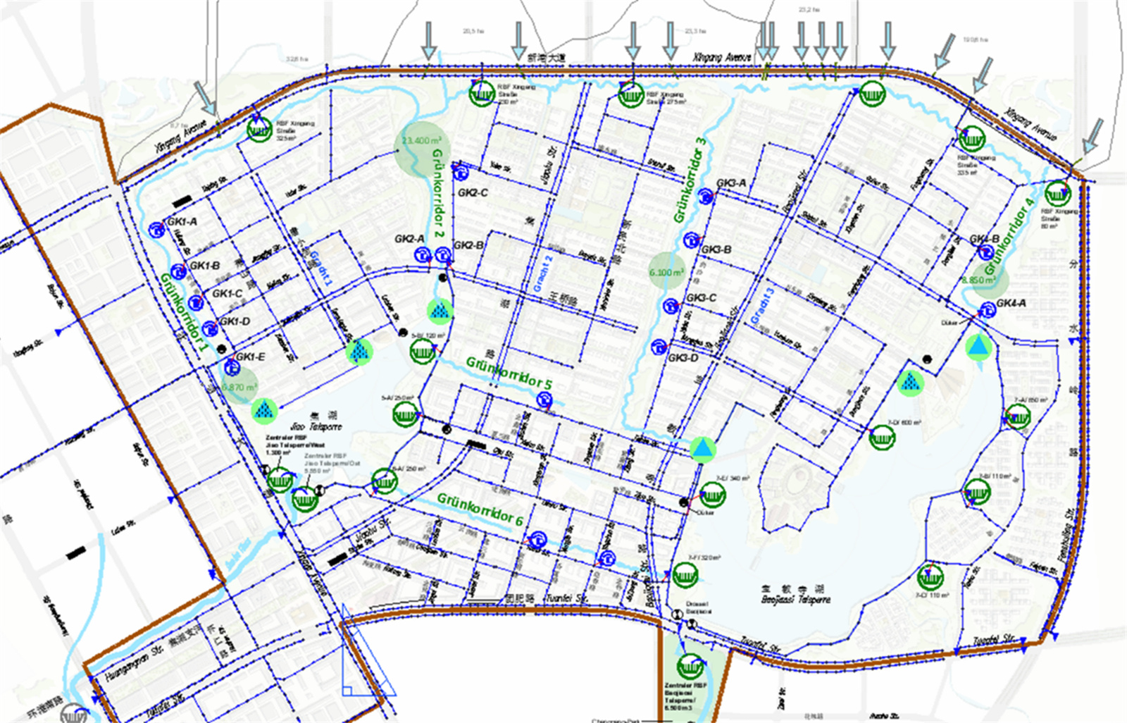 1. 全新、全流域生態(tài)水系統(tǒng)構(gòu)建及水力聯(lián)系。將雨水、地下水、河湖水系統(tǒng)整合,同步規(guī)劃大、中、小多級(jí)海綿體系,強(qiáng)化下滲、凈化、滯蓄,實(shí)現(xiàn)從小區(qū)到全流域的雨水綜合控制。