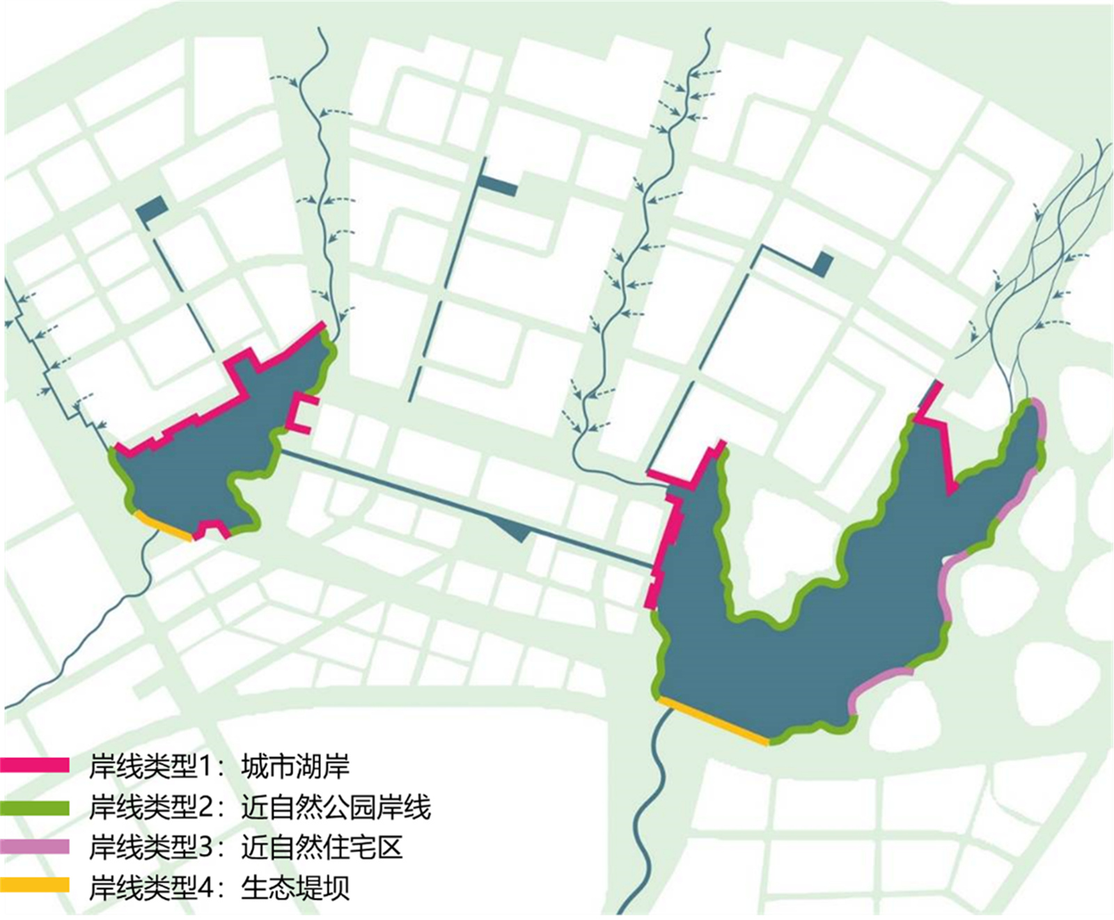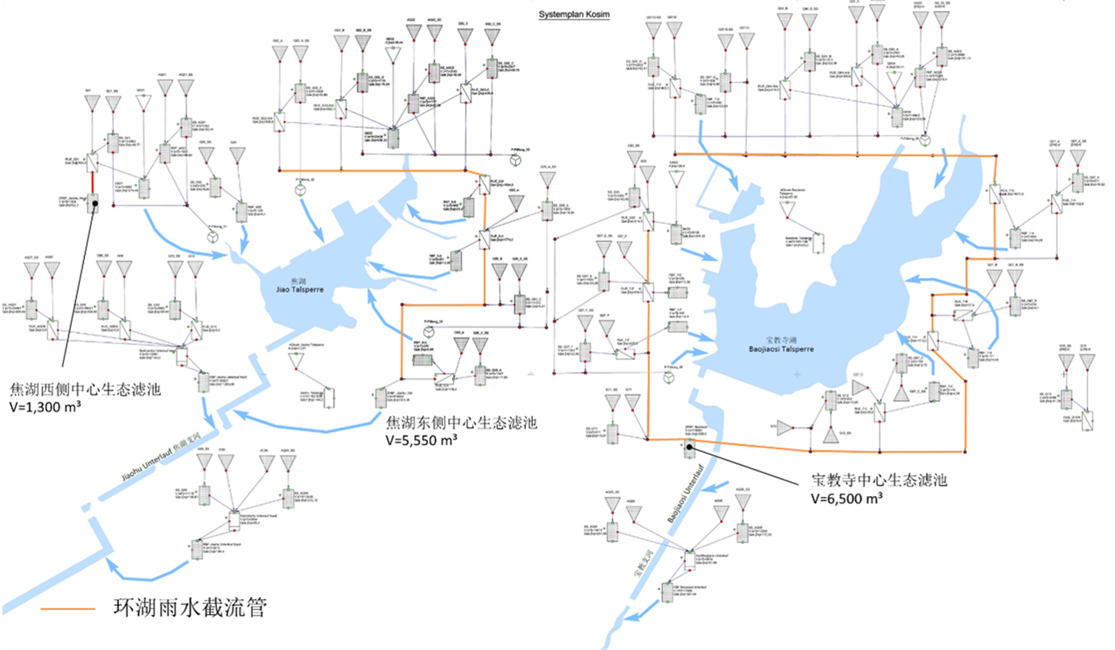 2. 創(chuàng)新清潔雨水系統(tǒng)。全流域內(nèi)實(shí)現(xiàn)初期雨水蓄留和滲透凈化,通過獨(dú)立的清潔雨水管網(wǎng)系統(tǒng)回補(bǔ)湖泊。排水管網(wǎng)系統(tǒng)主要承擔(dān)對(duì)非清潔雨水的收集,并轉(zhuǎn)輸至下游生態(tài)濾池凈化。除清潔雨水外,湖泊僅接受經(jīng)凈化后的特大暴雨溢流。