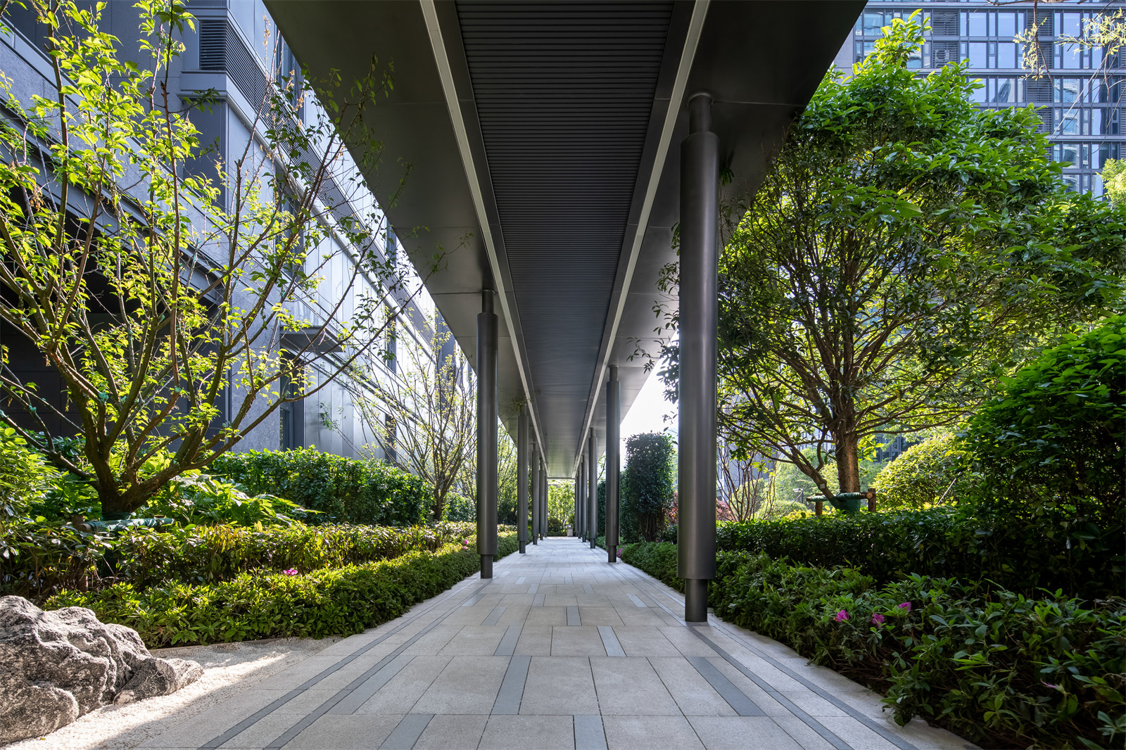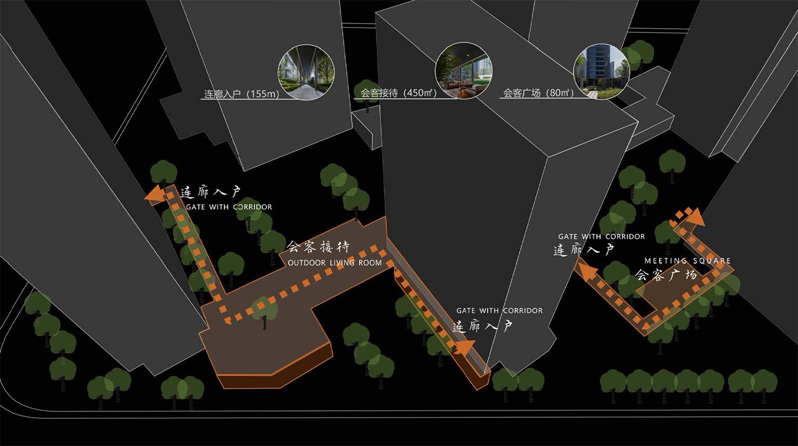 1. 風(fēng)雨連廊成為景觀結(jié)構(gòu)的主線,以“廊”這一特定形式進行人行動線的視覺引導(dǎo)和氛圍營造,削減近百米的高層建筑帶給人們的壓迫與緊張,強化傳統(tǒng)江南院落帶給人們的最美好的感知。