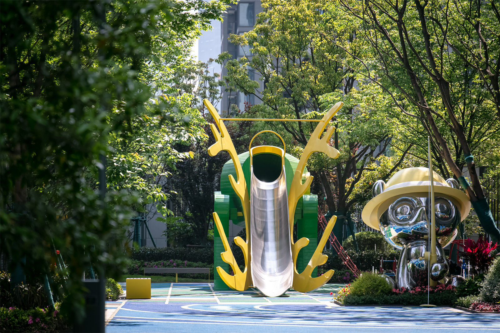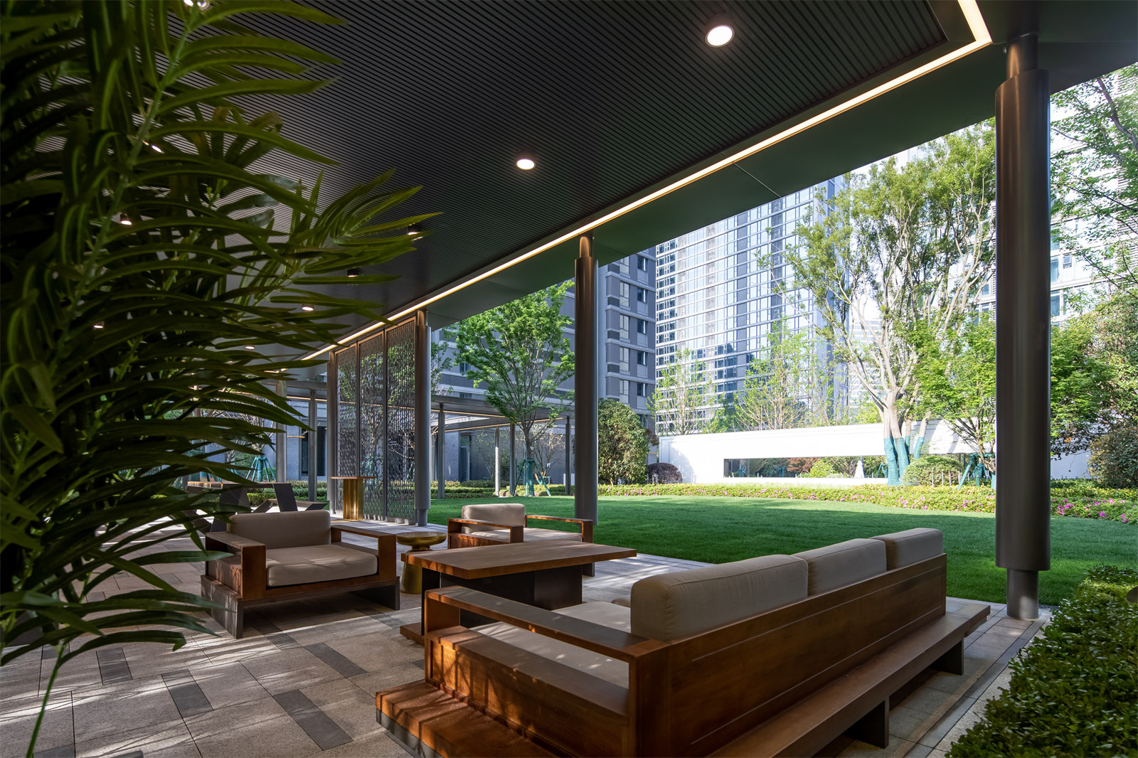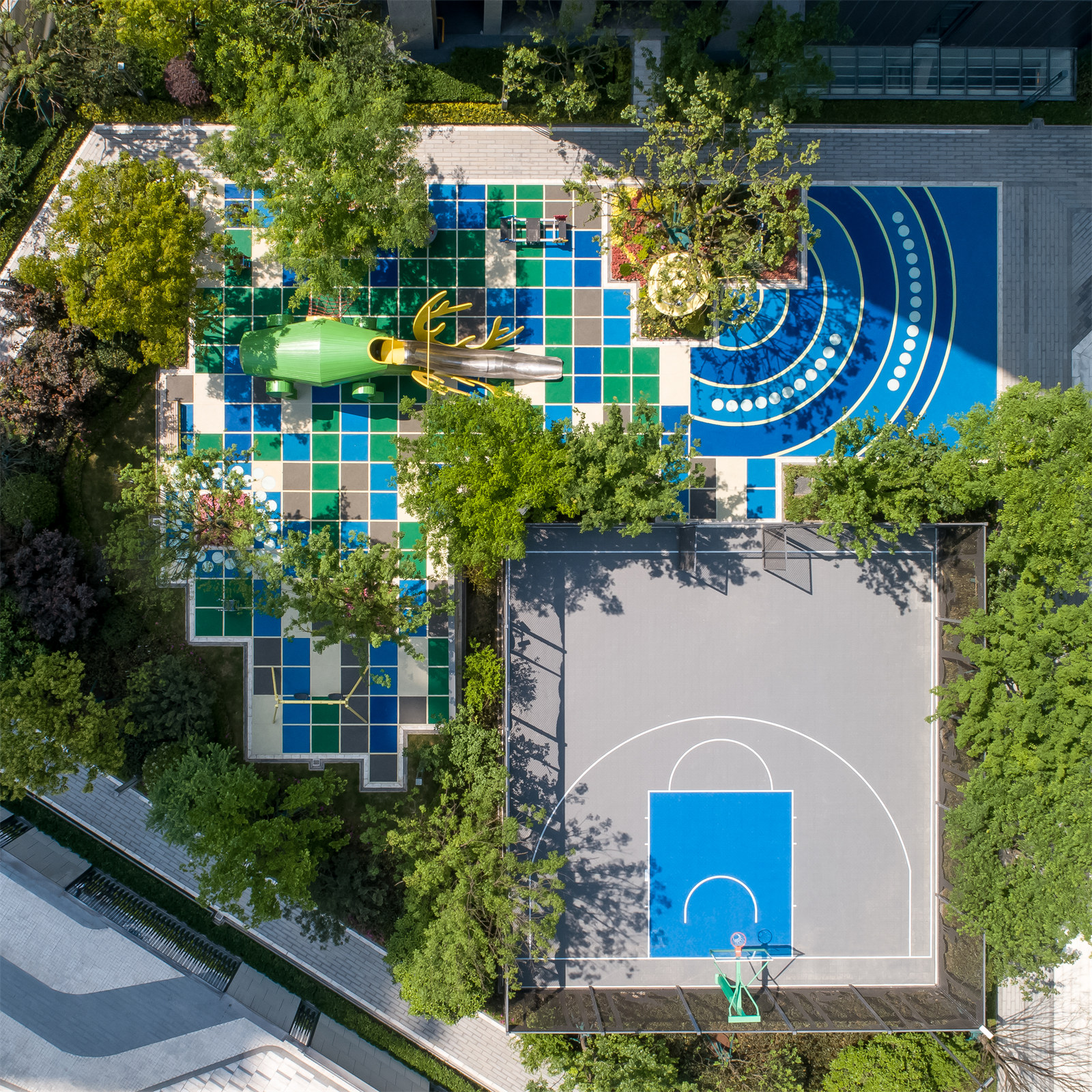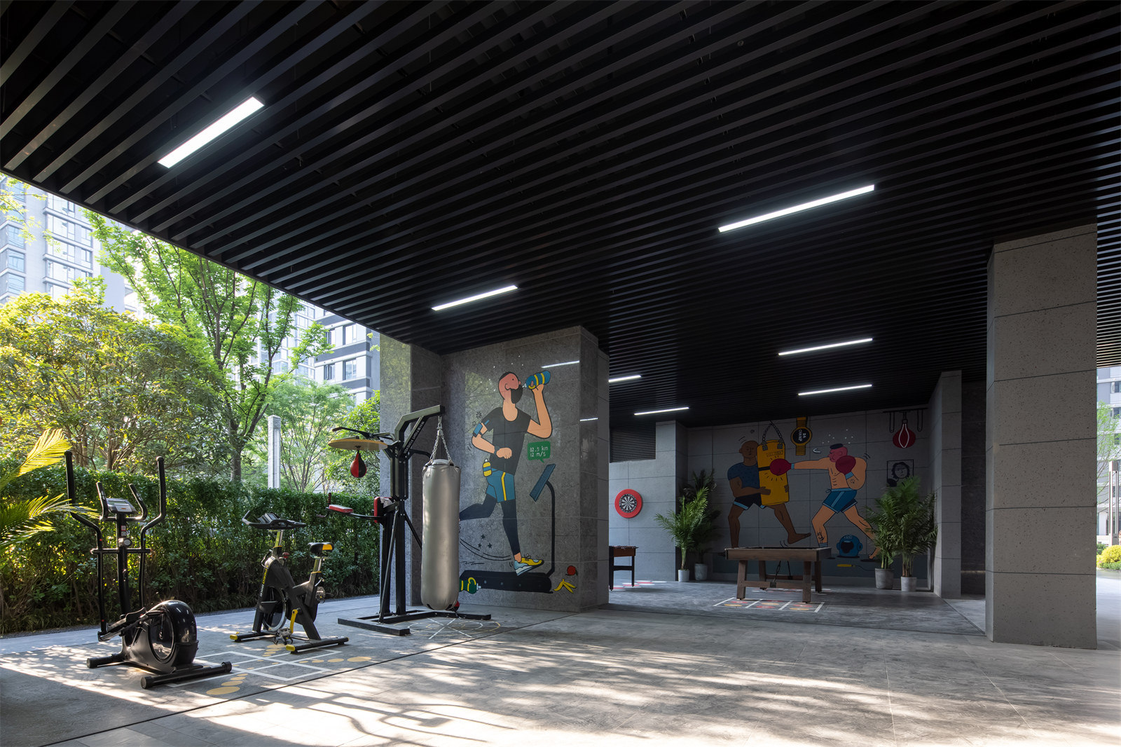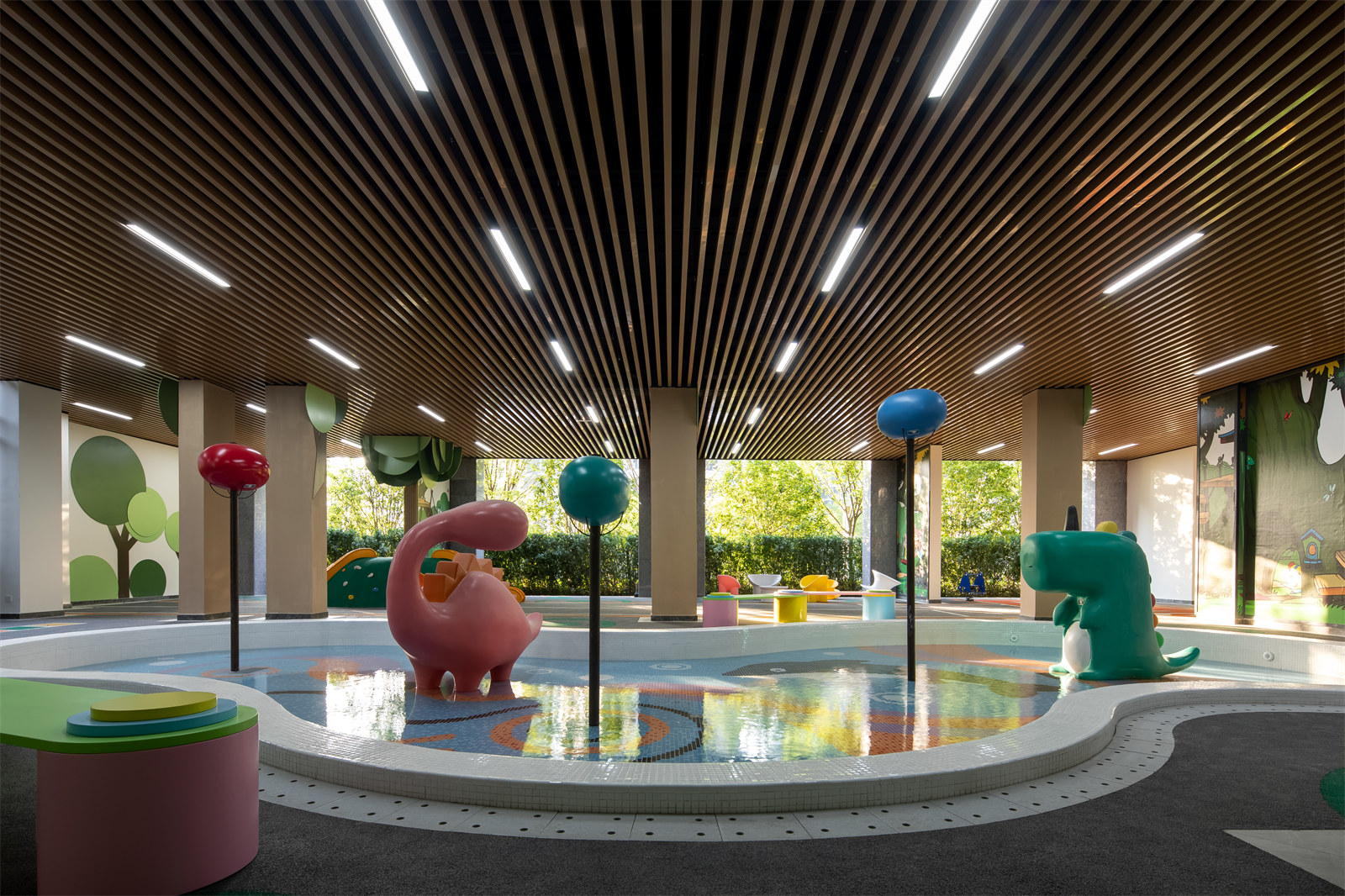 3.景觀方案向室內(nèi)適當(dāng)滲透,將2000平米的架空層納入景觀體系一并進行設(shè)計。利用架空層空間結(jié)合相鄰戶外空間的使用特性,分別植入友鄰交往、兒童戲水、娛樂健身等復(fù)合功能。整個小區(qū)底部空間完全貫通,也更加便于業(yè)主使用,成為架空層設(shè)計的典范。