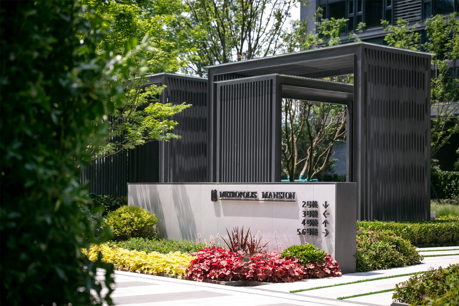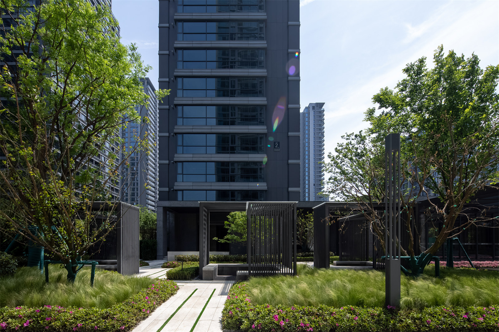 本項目位于杭州錢塘江畔,G20峰會主場旁,蕭山奧體博覽城中心。整個地塊的景觀面積約兩萬平方米,而社區(qū)內(nèi)部主要空間則不足一萬平方米,由三棟公寓和三棟高層板樓圍合而成。在寸土寸金的城市核心區(qū),如何營造利用有限的景觀空間,通過設(shè)計體現(xiàn)杭州溫婉清秀的歷史底蘊而又不失錢塘江畔的時尚活力,滿足當(dāng)下年輕人對生活品質(zhì)的訴求,是本案最重要的設(shè)計目標(biāo)。