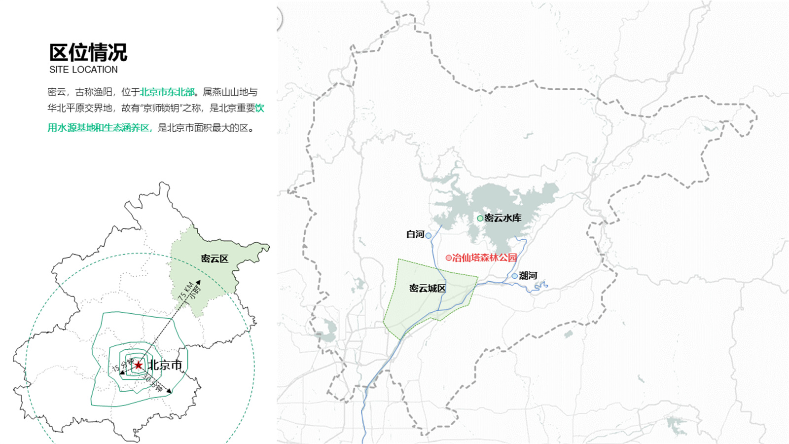 密云區(qū)位于北京市東北部,冶仙塔城市森林公園設計場地位于北京市密云區(qū)西南側,距北京市中心75km,地處首都1h經(jīng)濟圈以內(nèi),交通便捷。公園建設面積達45.8公頃,公園北依冶仙塔風景區(qū),南面密云新城,東臨白河,處于山城交接的區(qū)域。冶仙塔城市森林公園北接白石嶺路南靠京承鐵路,西側距離密關路約1公里。
