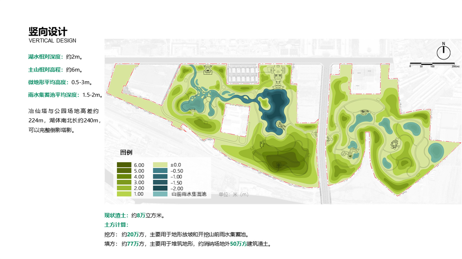 在豎向設計過程中,本方案在現(xiàn)狀地形的基礎上,針對土方平衡進行系統(tǒng)梳理,并根據(jù)不同區(qū)域景觀功能特點進行豎向設計,設計若干微地形,一方面可以引導公園排水,形成匯水分區(qū),為場地整體雨洪管理系統(tǒng)提供基礎。另一方面,形成一系列微地形,豐富景觀體驗的同時,也可以為種植設計營造地形基底。