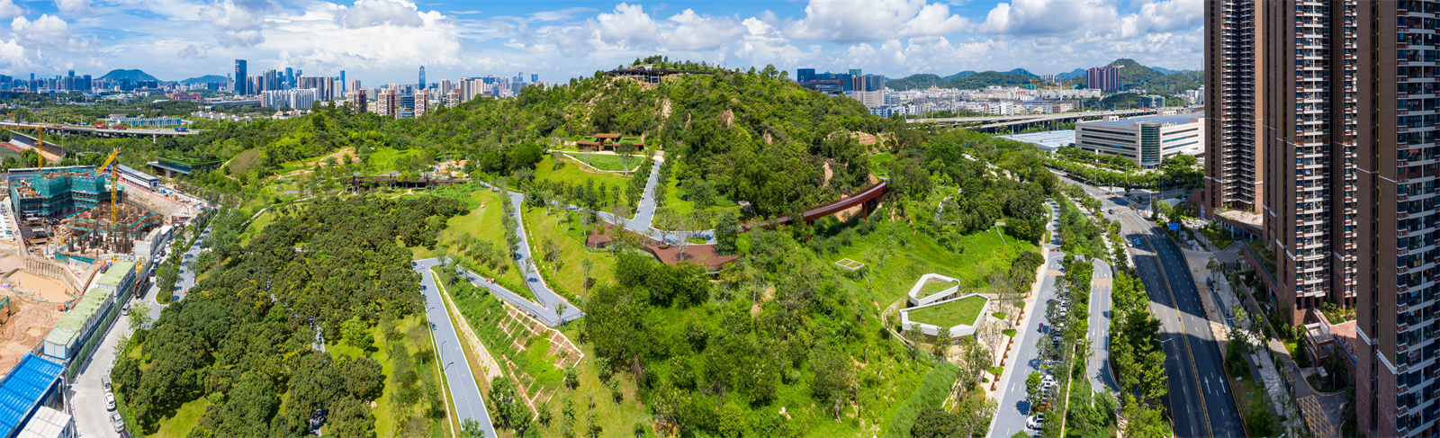 西麗生態(tài)公園位于南山區(qū)南光高速東側(cè),打石一路西側(cè),東西長約420m ,南北長約720m,場地內(nèi)最大高差約為80m,公園總面積約20公頃。場地山地形態(tài)單一,缺乏有特色的自然山水資源,大部分場地空間高差陡峭難以通達(dá),解決場地通達(dá)性、功能場地的布置與周邊融合協(xié)調(diào)是本次設(shè)計(jì)的重中之重。