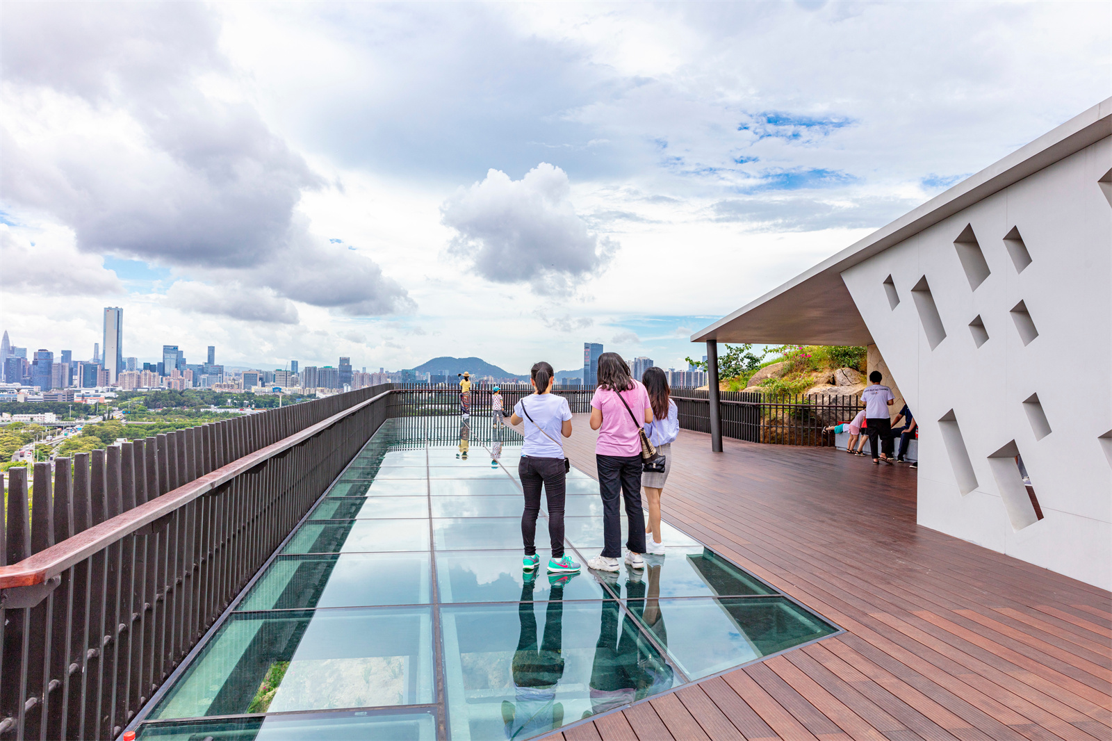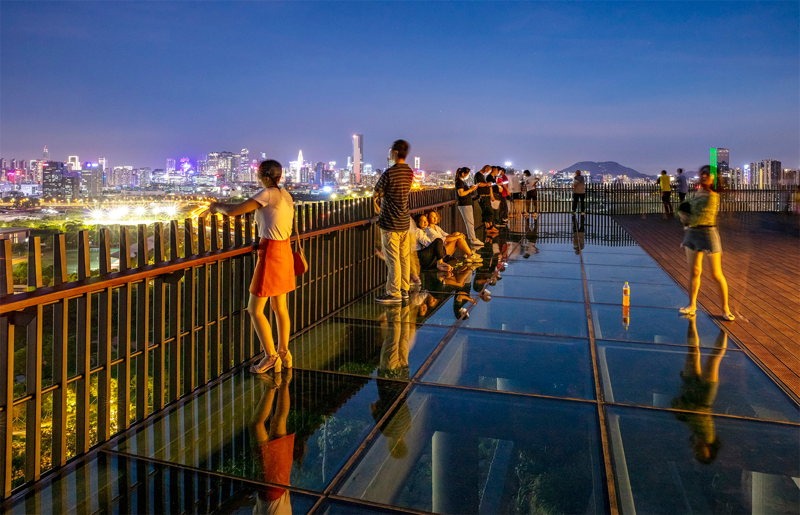 結(jié)合場地的條件與景觀視野,設(shè)計(jì)師在不同的角度與位置安置了景觀亭,滿足人們休憩的需求,并通過景亭的設(shè)計(jì)引導(dǎo)人們的視野,將城市的美好的天際線畫卷展現(xiàn)在眼前。玻璃觀景平臺(tái)可以透過玻璃看到陡峭山下的自然石塊,更是增加了驚險(xiǎn)刺激的游園趣味