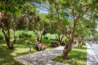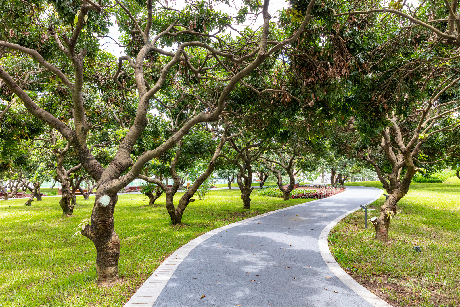 公園所在的南山西麗區(qū)域的荔枝是深圳有名的特產(chǎn),而項(xiàng)目場地中是一片長勢良好的荔枝林。在設(shè)計(jì)的初期,就明確了整體荔枝林的保留。圍繞荔枝林的主題,滿足公園散步的功能,林下采用透水材質(zhì),讓人可以在盛夏中依然感受密林下的習(xí)習(xí)涼風(fēng)。同時(shí),在荔枝林外,利用場地的高差,設(shè)置了觀景休閑平臺(tái),可以觀賞荔枝林頂部濃密的綠色,場地中利用地形起伏,采用了系統(tǒng)的雨洪管理策略,落入公園中的雨水, 經(jīng)過地形引導(dǎo)的匯水面,注入耕地以及自然地被區(qū)域,局部營造了系列的下沉式綠地,可以實(shí)現(xiàn)季節(jié)性的雨水花園,人們可以走在雨水花園的一側(cè)近距離觀賞,也可以站在觀景平臺(tái)上俯視。歷史悠久的荔枝林被打造成為公園一個(gè)主要的特色主題空間。
