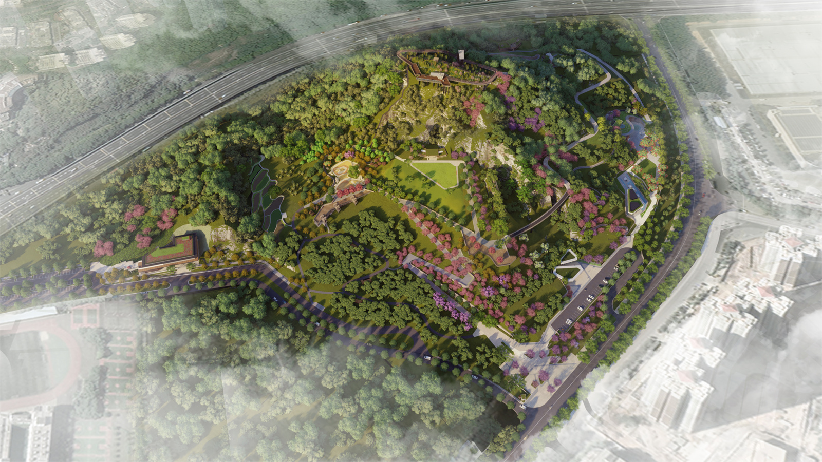 我們認(rèn)為首先需要有效的生態(tài)修復(fù),確定公園城市綠肺的功能定位,提升地塊內(nèi)的生態(tài)條件,落實(shí)海綿城市策略,并通過展覽及公園活動(dòng),向公眾傳達(dá)生態(tài)保護(hù)的理念,讓公眾在自然輕松環(huán)境中感受到生態(tài)理念的美好與珍貴。其次是利用場地內(nèi)的 80 米高差,打造層次豐富的公園體驗(yàn),作為公眾的休閑空間。最后是計(jì)需要滿足當(dāng)下以及未來市民的生活、學(xué)習(xí)、社交需求,滿足自然地塊與都市空間的融合與發(fā)展。