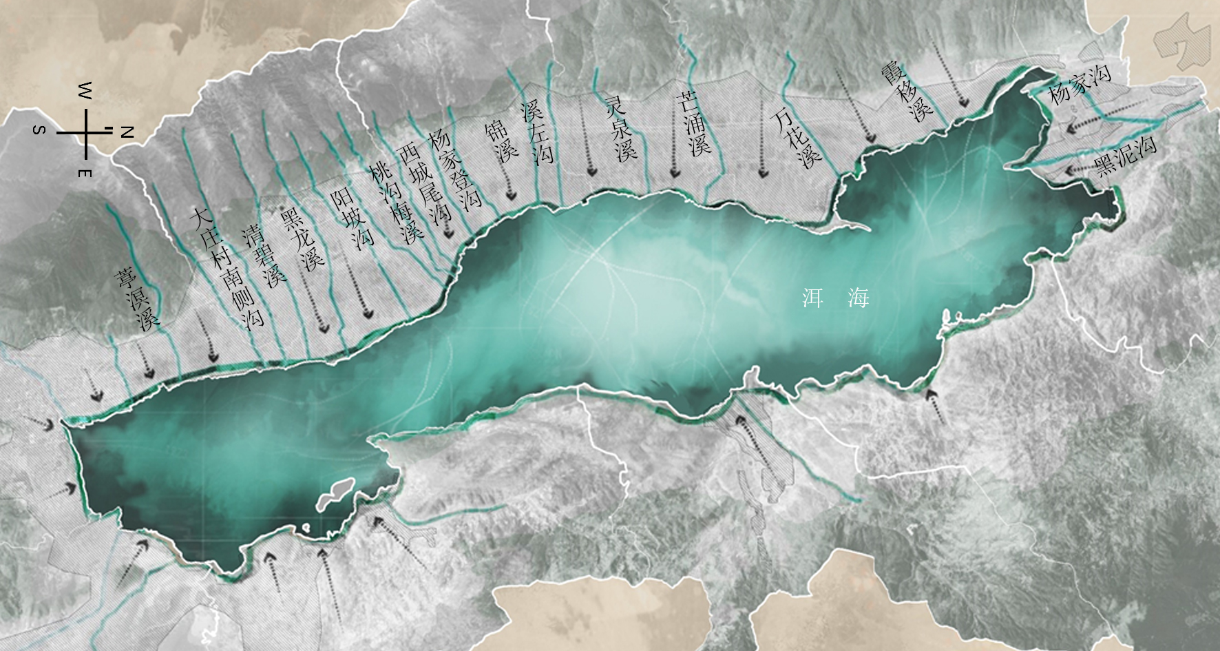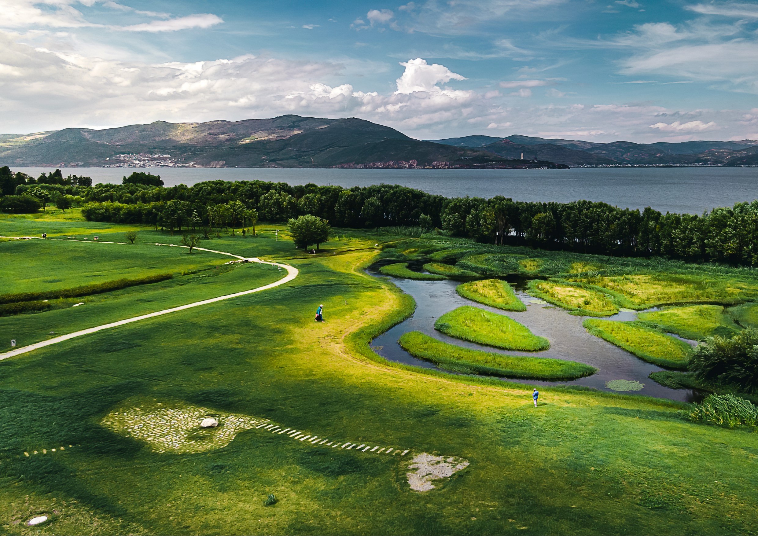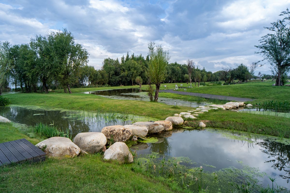 第三,強調(diào)通過自然的方式(NbS)實現(xiàn)凈化,打造低投入、 低干擾、低維護、高生態(tài)價值的生態(tài)緩沖帶。模擬自然景觀風貌,形成符合自然規(guī)律的人工干預。例如,考慮大理蒸發(fā)量高等自然氣候條件,部分人工濕地選擇以草坪形式為主的表流濕地,局部以深塘來保證其濕地的運行。旱季,疏林草坪展現(xiàn)了本土的自然景觀風貌,局部的坑塘進行濕地凈化;雨季,草坪表流濕地攔截初期雨水攜帶的大量農(nóng)田面源污染,使生態(tài)廊道成為洱海的最后一道防線。對河口濕地實行修復,通過模擬自然的河口打開形式, 以自然做功的方式,幫大自然恢復,讓大自然自己去設計。