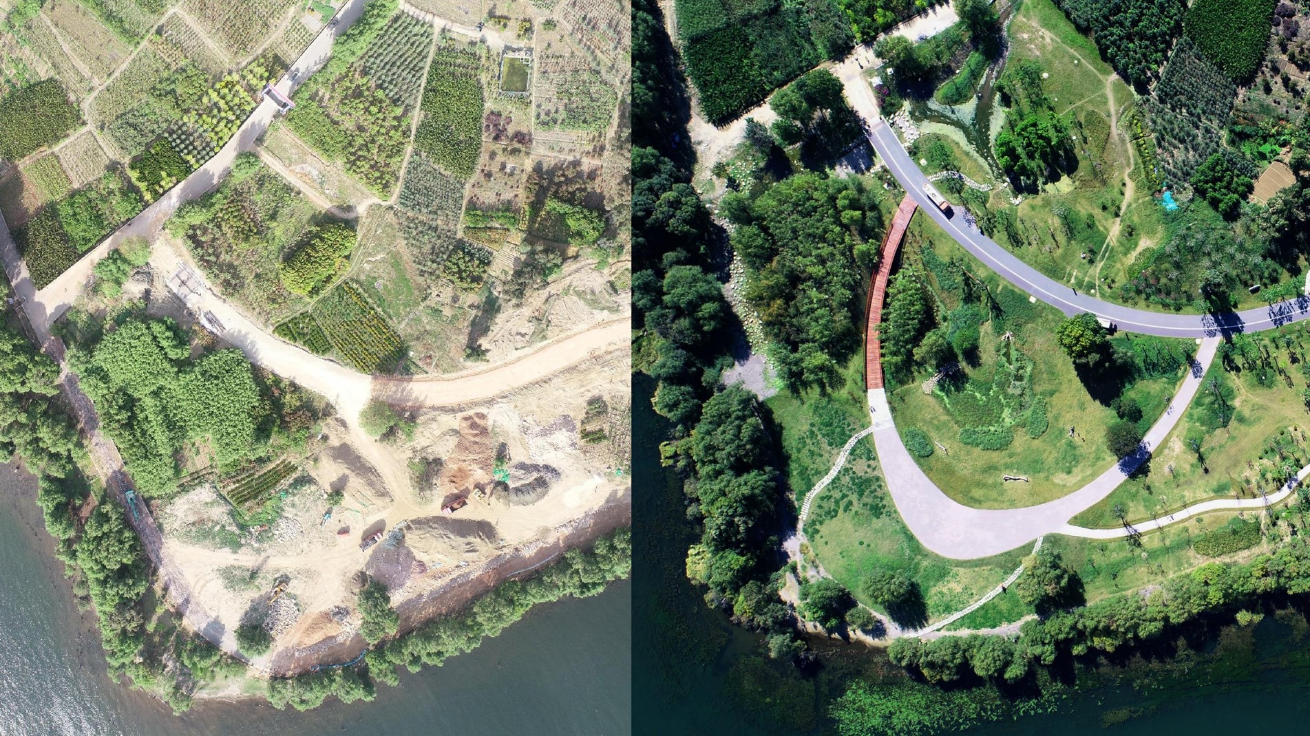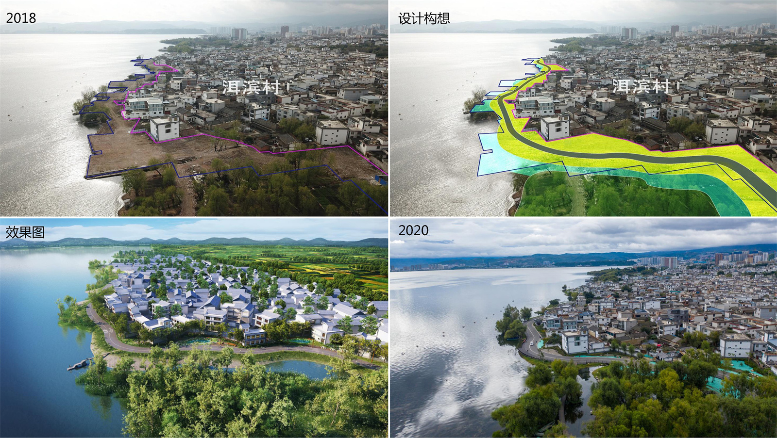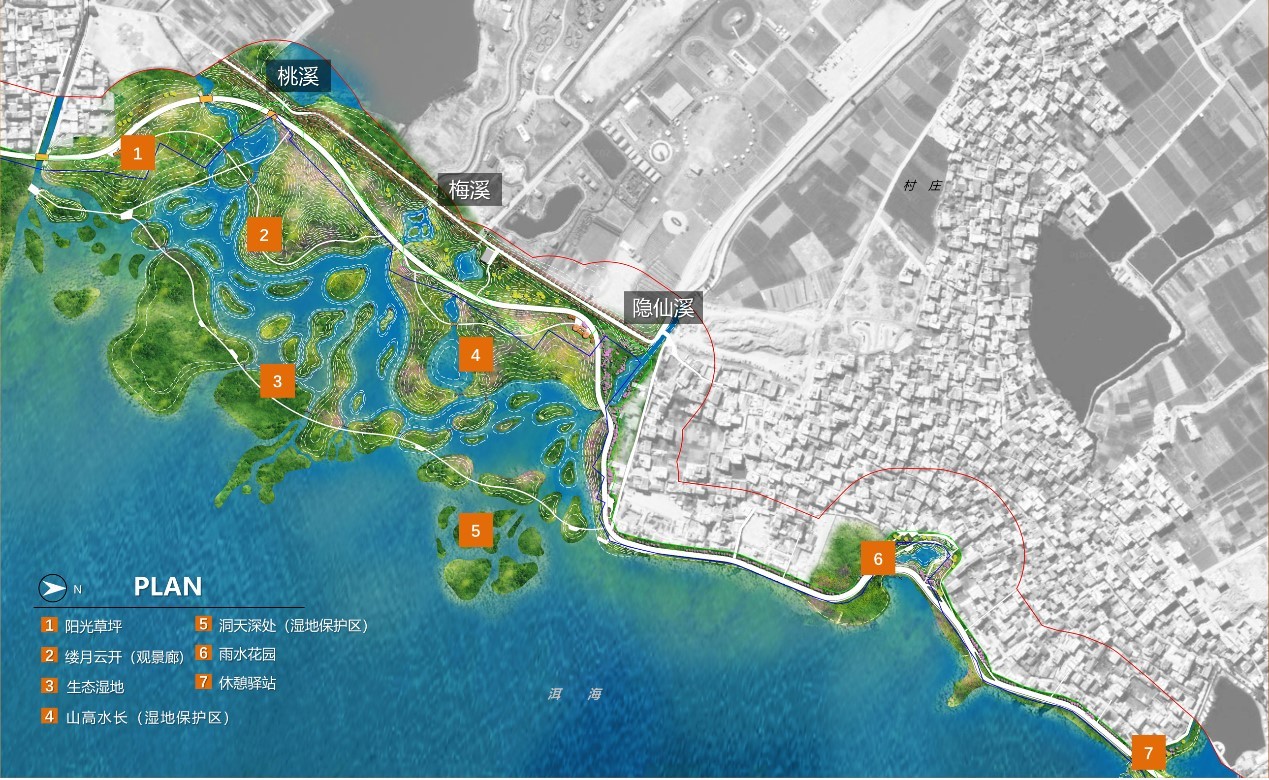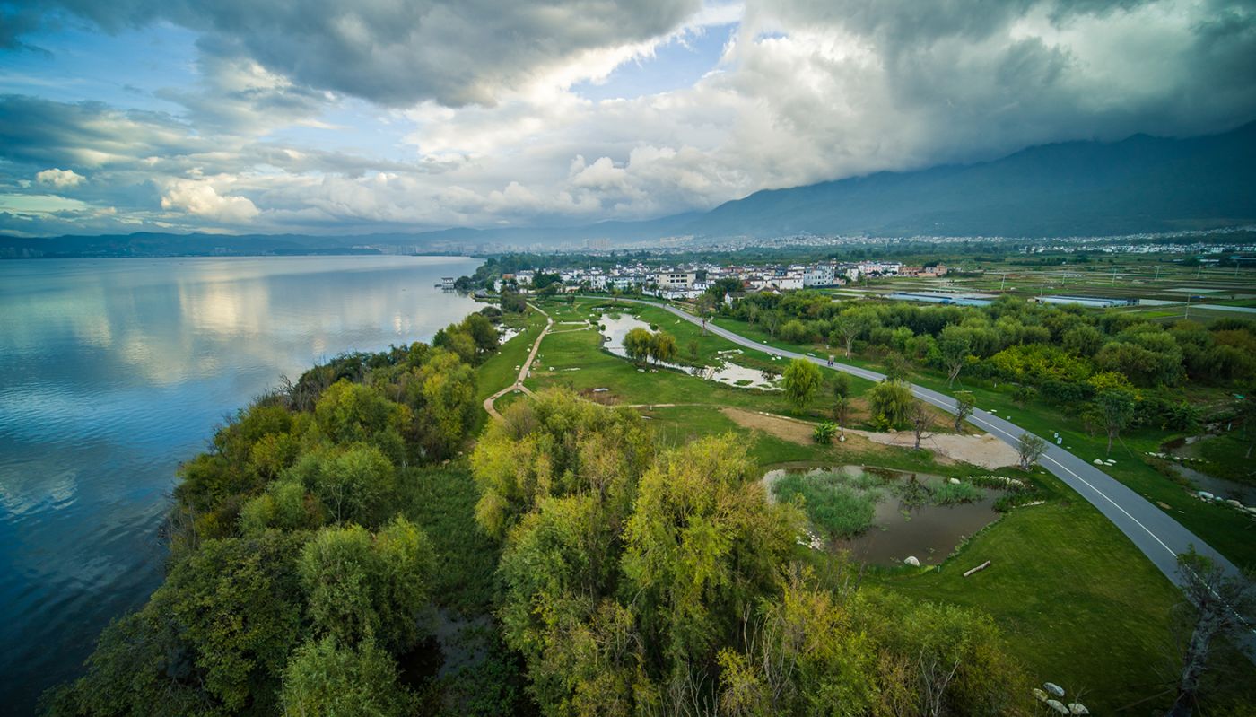環(huán)洱海湖濱緩沖帶建設主要研究、實踐整個洱海湖濱緩沖帶生態(tài)恢復的技術(shù)模式。以水質(zhì)凈化技術(shù)為切入點,依靠自然的力量實施前瞻性生態(tài)治理,提高生態(tài)系統(tǒng)與社會經(jīng)濟系統(tǒng)的適應能力,是一項基于“保護 +”的濱水景觀生態(tài)實踐。設計團隊以基于自然的解決方案(NbS)為最重要的指導方針,采用了包括核心保護、自然恢復、生態(tài)重建、輔助再生等方式,將原本被農(nóng)田、客棧等侵占的海岸線修復到一個具有良好恢復力的可持續(xù)的緩沖區(qū)。