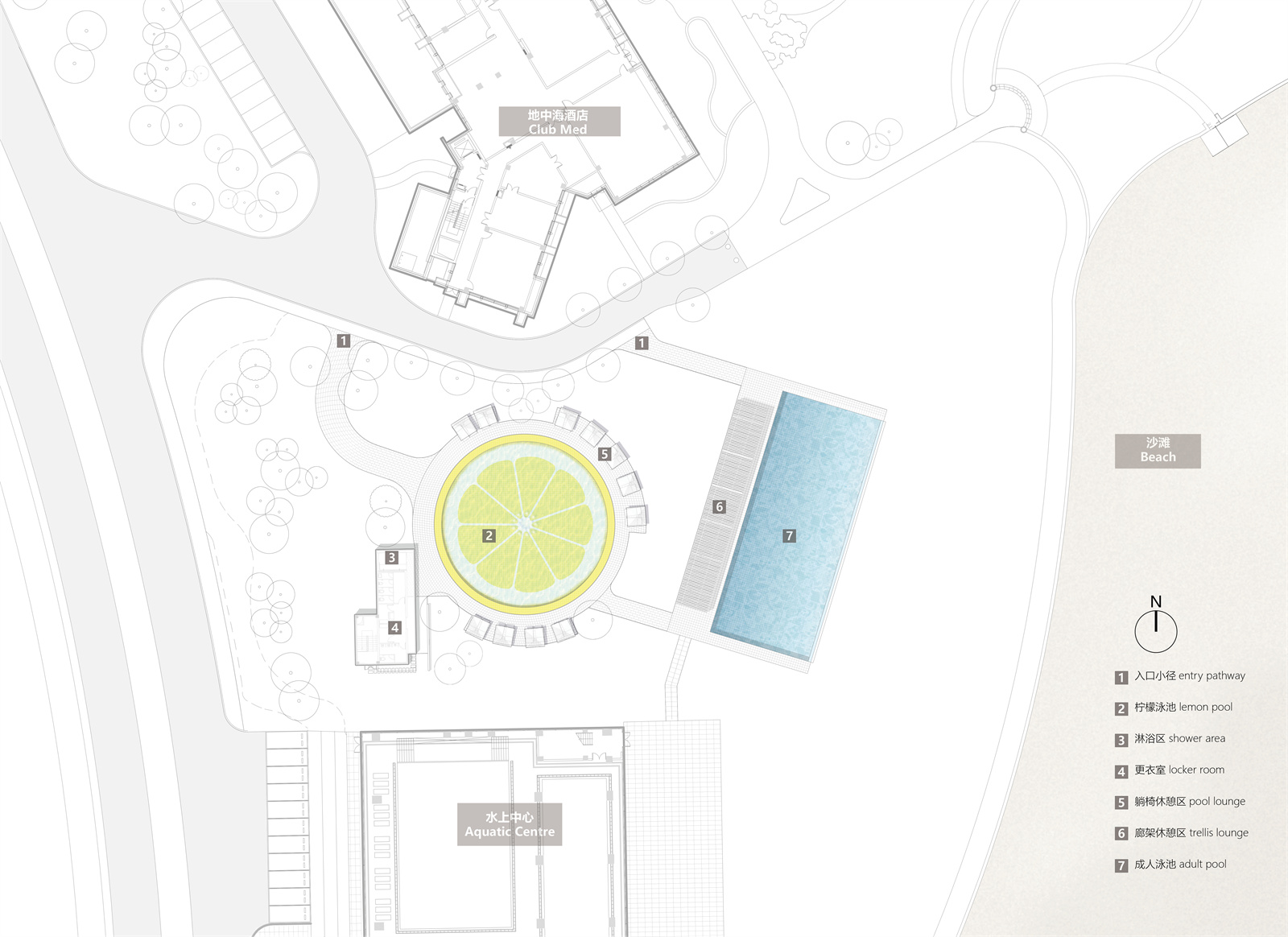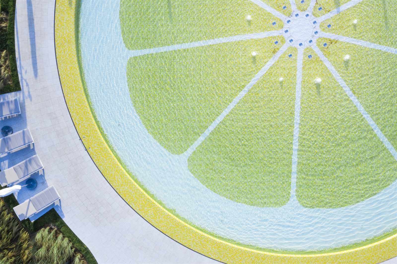 檸檬泳池的設(shè)計(jì)過程是從一片鮮艷的“檸檬片”開始,設(shè)計(jì)想要使用者感受到放松和童趣,仿佛懶洋洋的躺在沙灘上喝著檸檬汁。