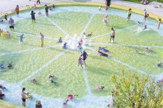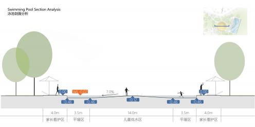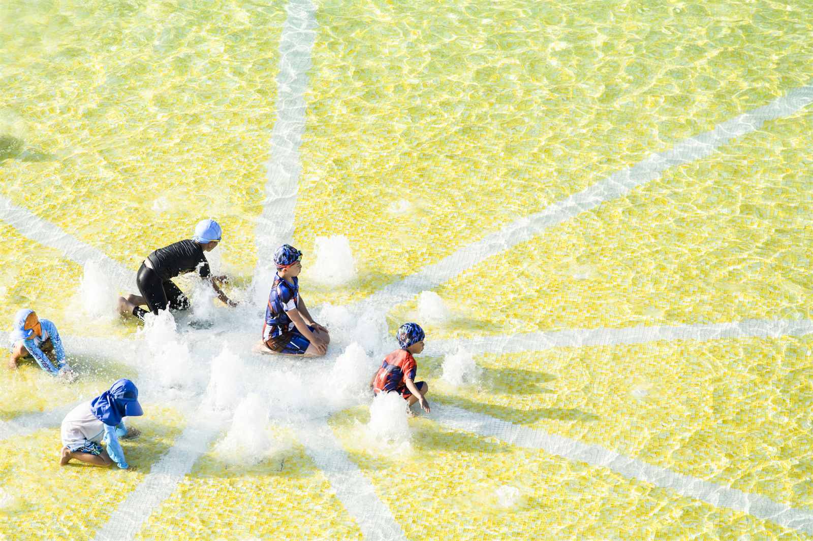 池底呈現(xiàn)中心高邊緣低的形態(tài),中央淺水區(qū)結(jié)合涌泉設(shè)置,高低涌動(dòng)的泉水與變化的池底水深使游泳池對(duì)不同年齡段的孩子更具娛樂性、互動(dòng)性和友好性。