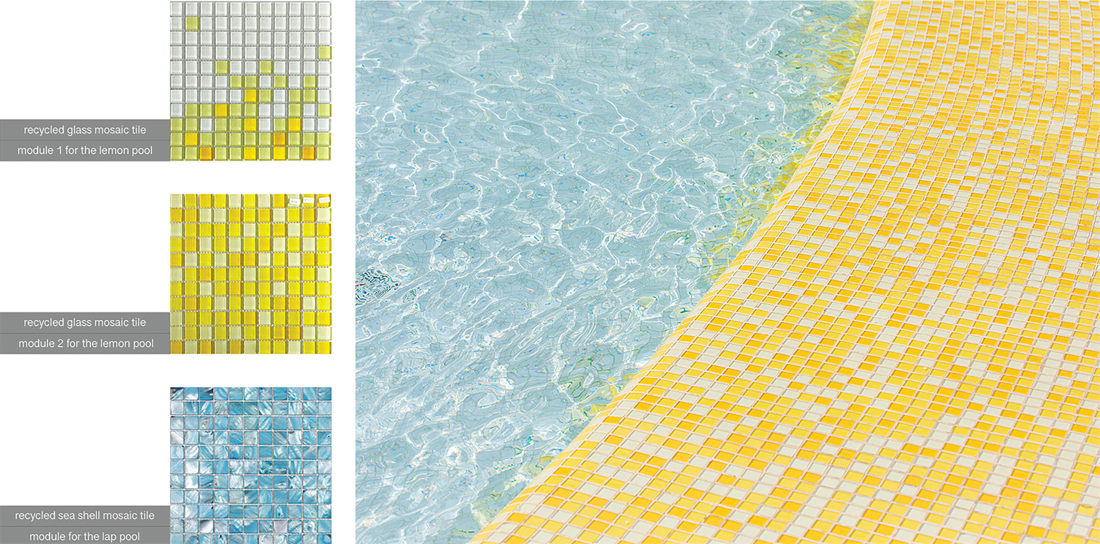 設(shè)計(jì)為了保持“檸檬片”的通透純凈感,選用了白色、淺黃色和黃色三種水晶馬賽克做池底,分別呈現(xiàn)檸檬肉,檸檬皮及檸檬瓤三部分。三色水晶馬賽克的拼貼鋪設(shè)使泳池在遠(yuǎn)處成為一幅完整的檸檬圖案,豐富了細(xì)節(jié)。