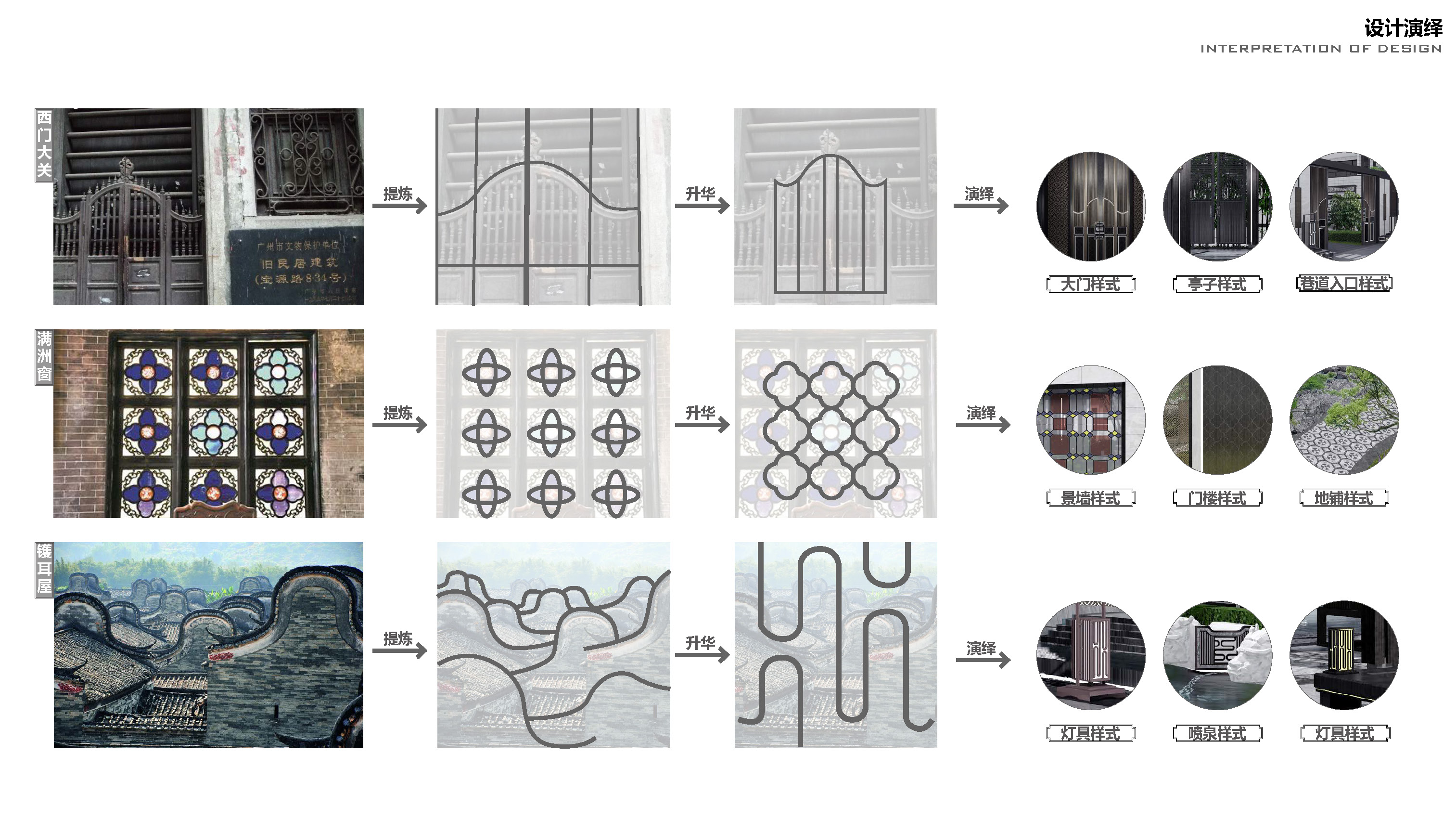 設(shè)計(jì)在體會嶺南文化生活的時,去找尋具有嶺南特色的具象事物、形態(tài)和元素作為載體。門樓的整體是中式,但簡化了一些裝飾以適應(yīng)現(xiàn)代人的審美。二扇大門首先是借鑒了西關(guān)大屋門戶的風(fēng)格,大門上曲線以下是模仿西關(guān)大屋的推門,是傳統(tǒng)建筑生活細(xì)節(jié)的一個反應(yīng)。