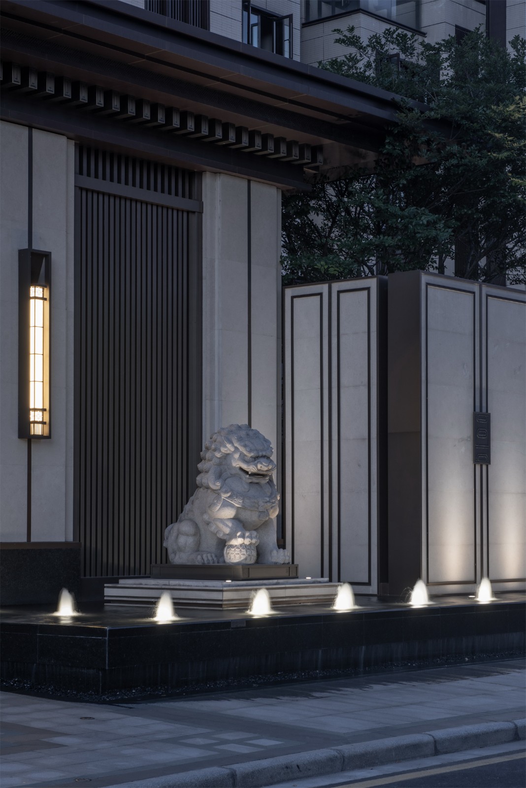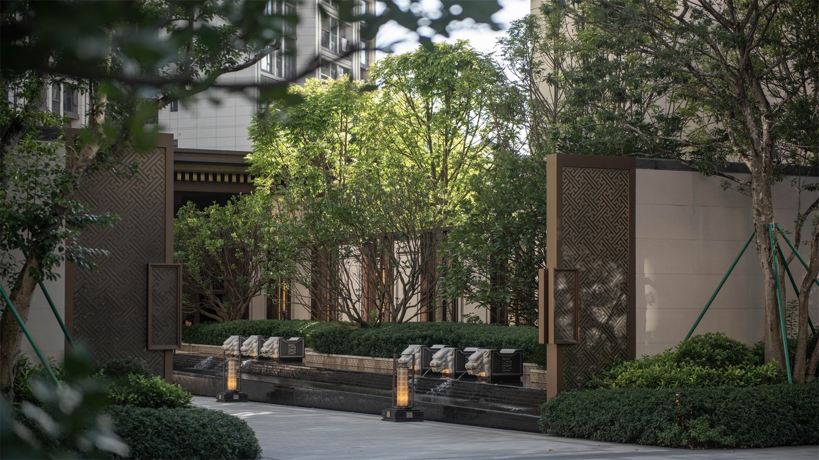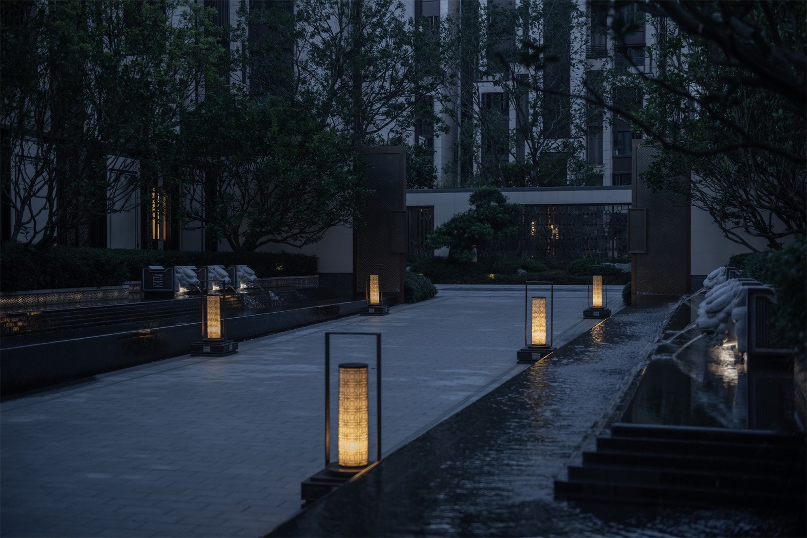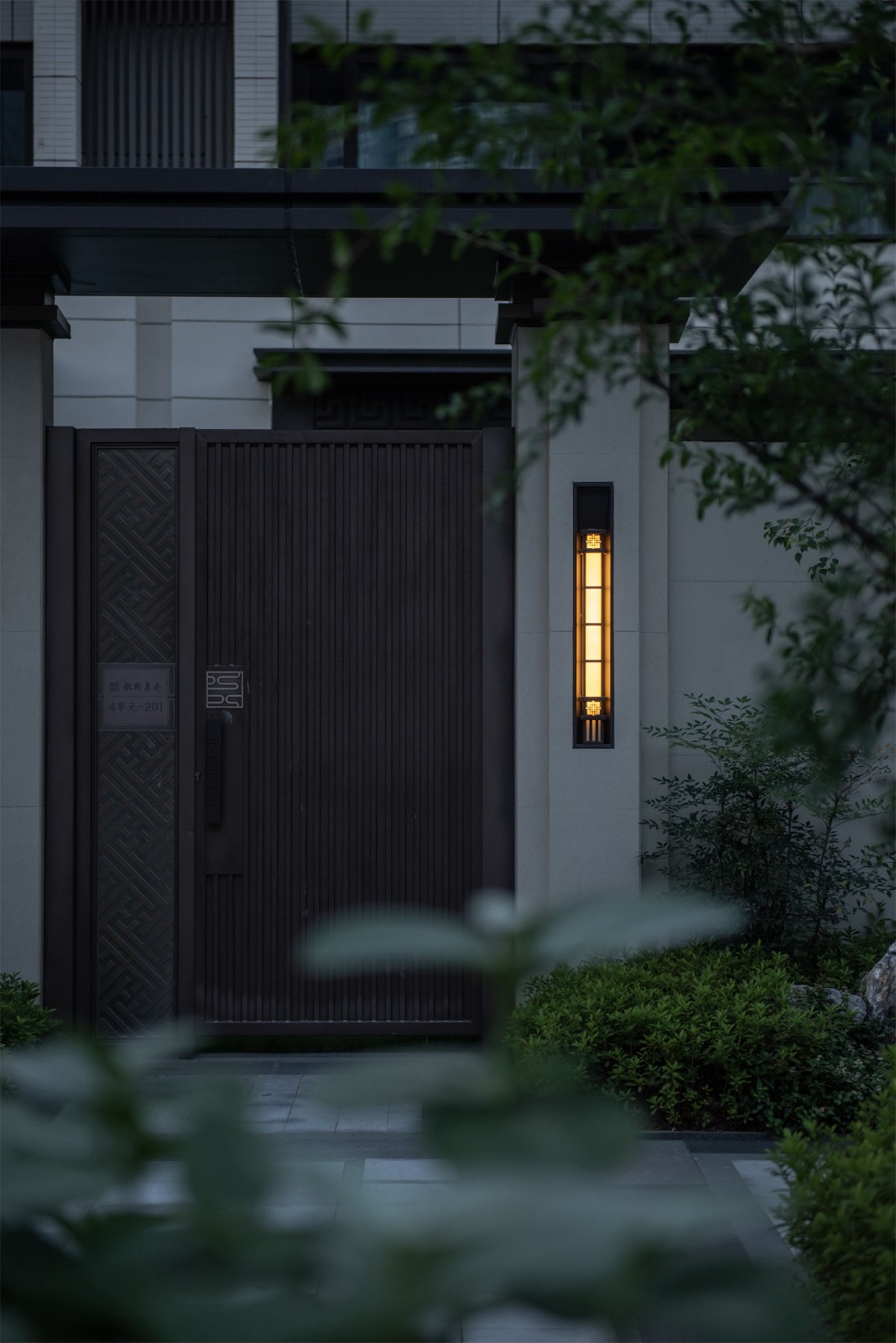 歸家的尊貴和儀式感在中軸進(jìn)一步延伸。最外兩側(cè)的綠化和通透景墻,既有分隔公共空間和私密宅間的作用,又通過節(jié)奏上的等比變化,將燈具裝飾于其中,同時順著縱深方向的對稱序列,圍合成儀式中軸空間。