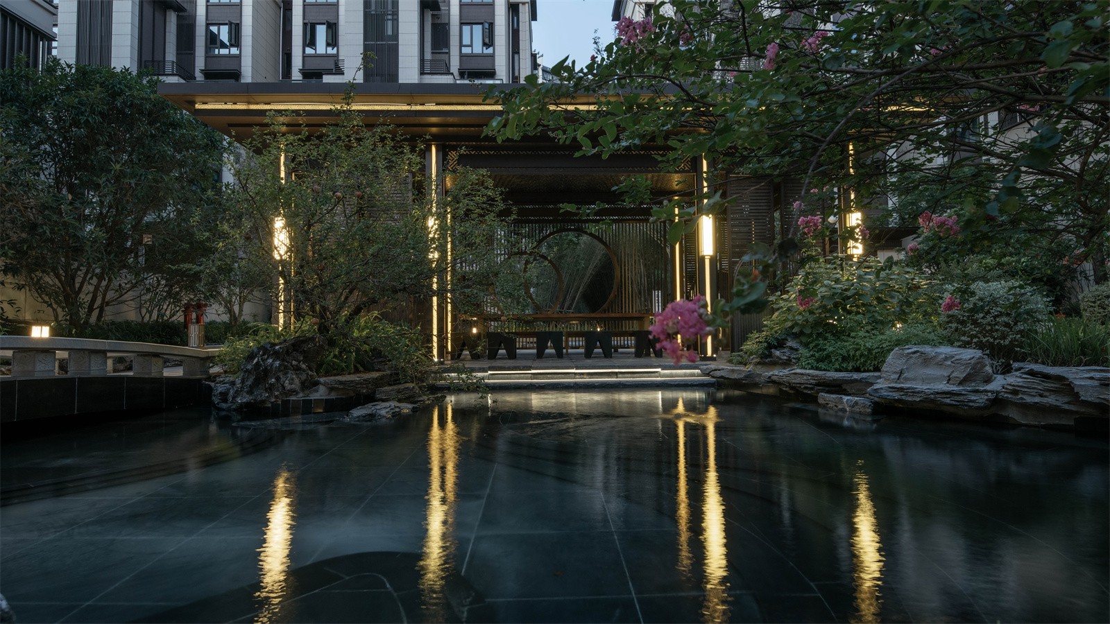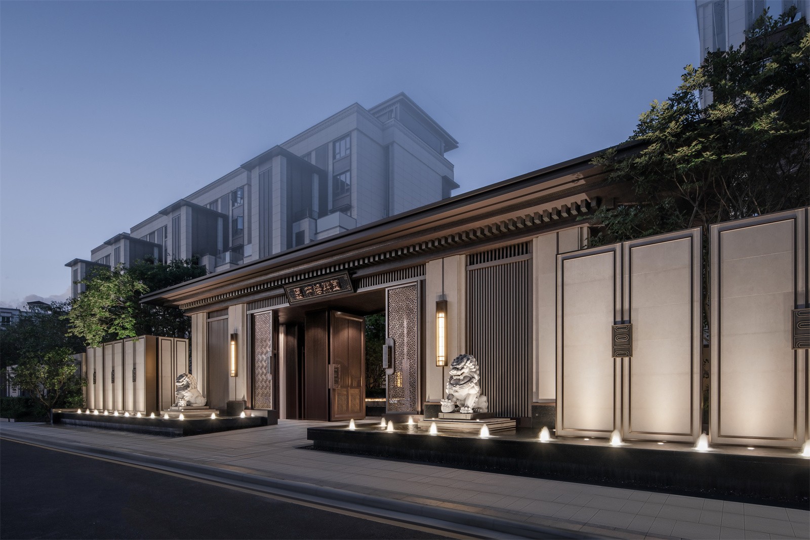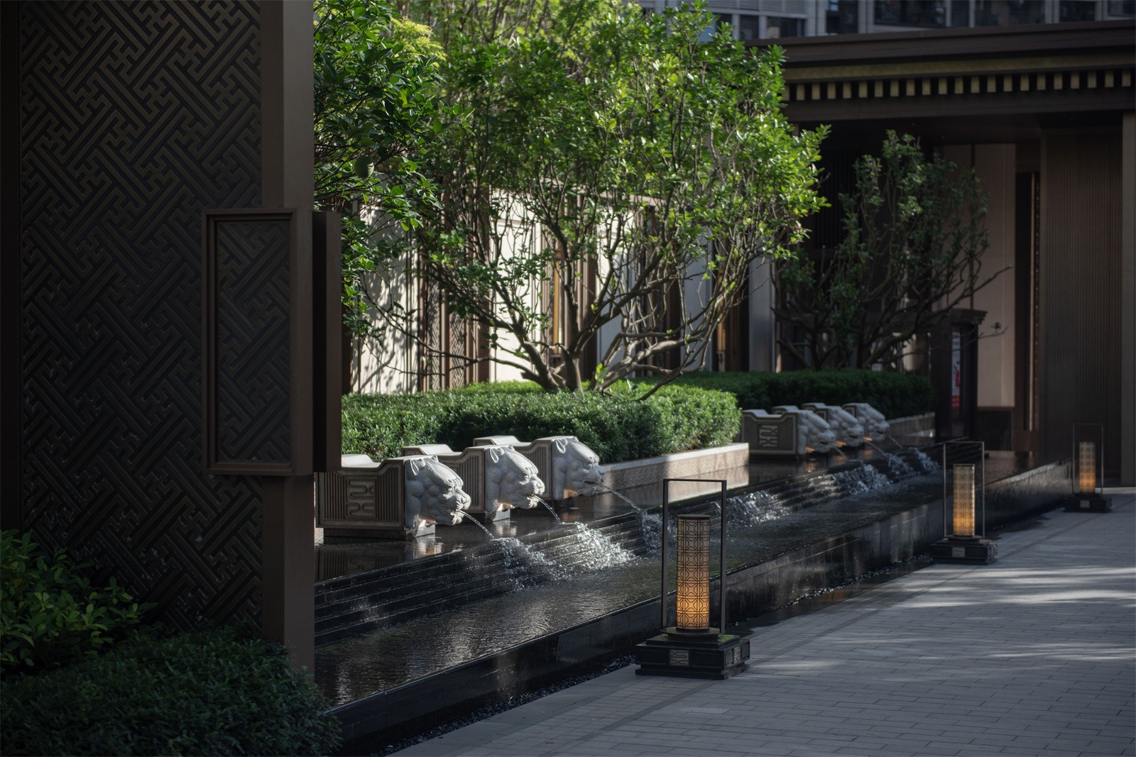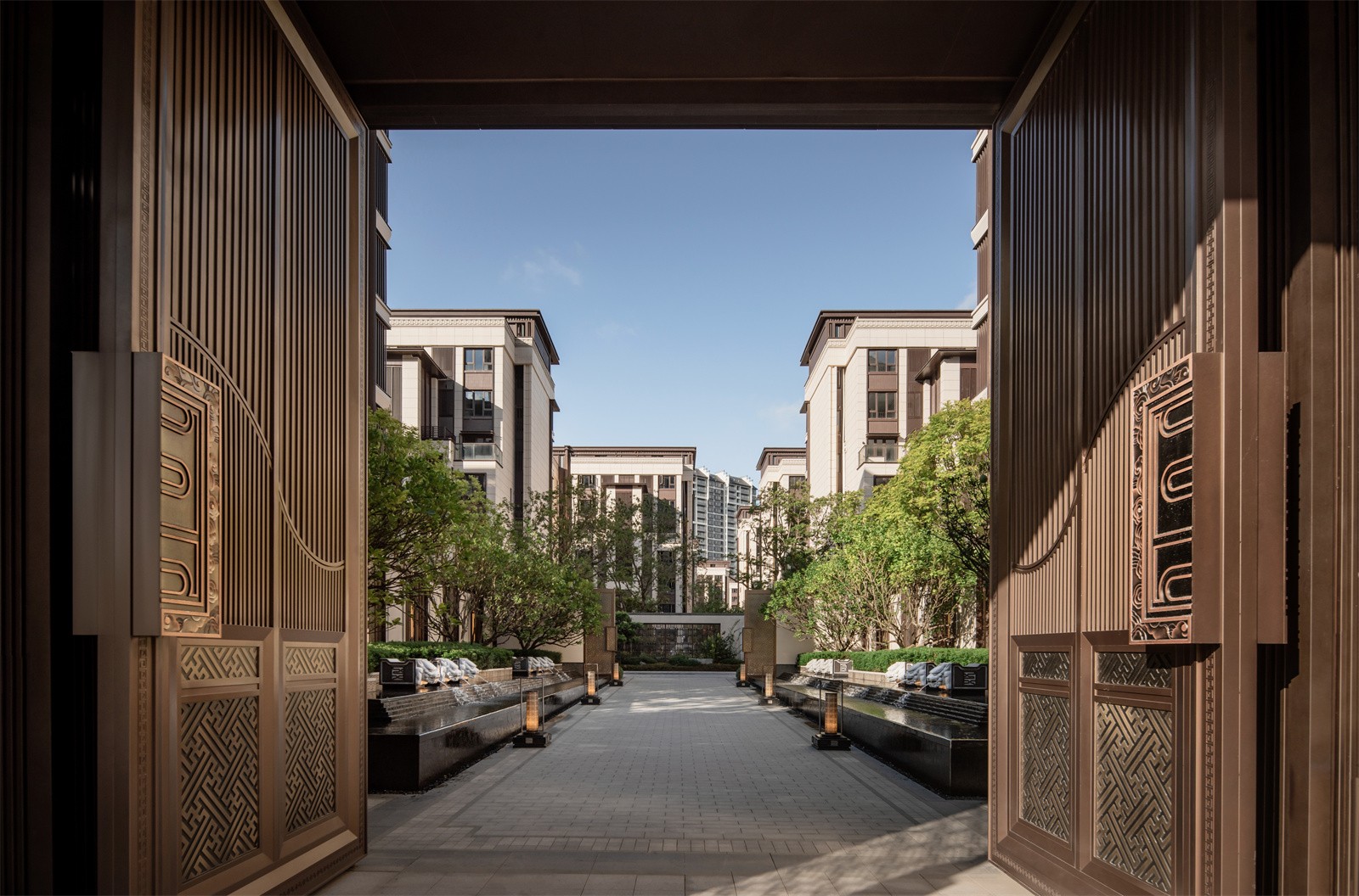 歸家的尊貴和儀式感在中軸進(jìn)一步延伸。最外兩側(cè)的綠化和通透景墻,既有分隔公共空間和私密宅間的作用,又通過節(jié)奏上的等比變化,將燈具裝飾于其中,同時順著縱深方向的對稱序列,圍合成儀式中軸空間。