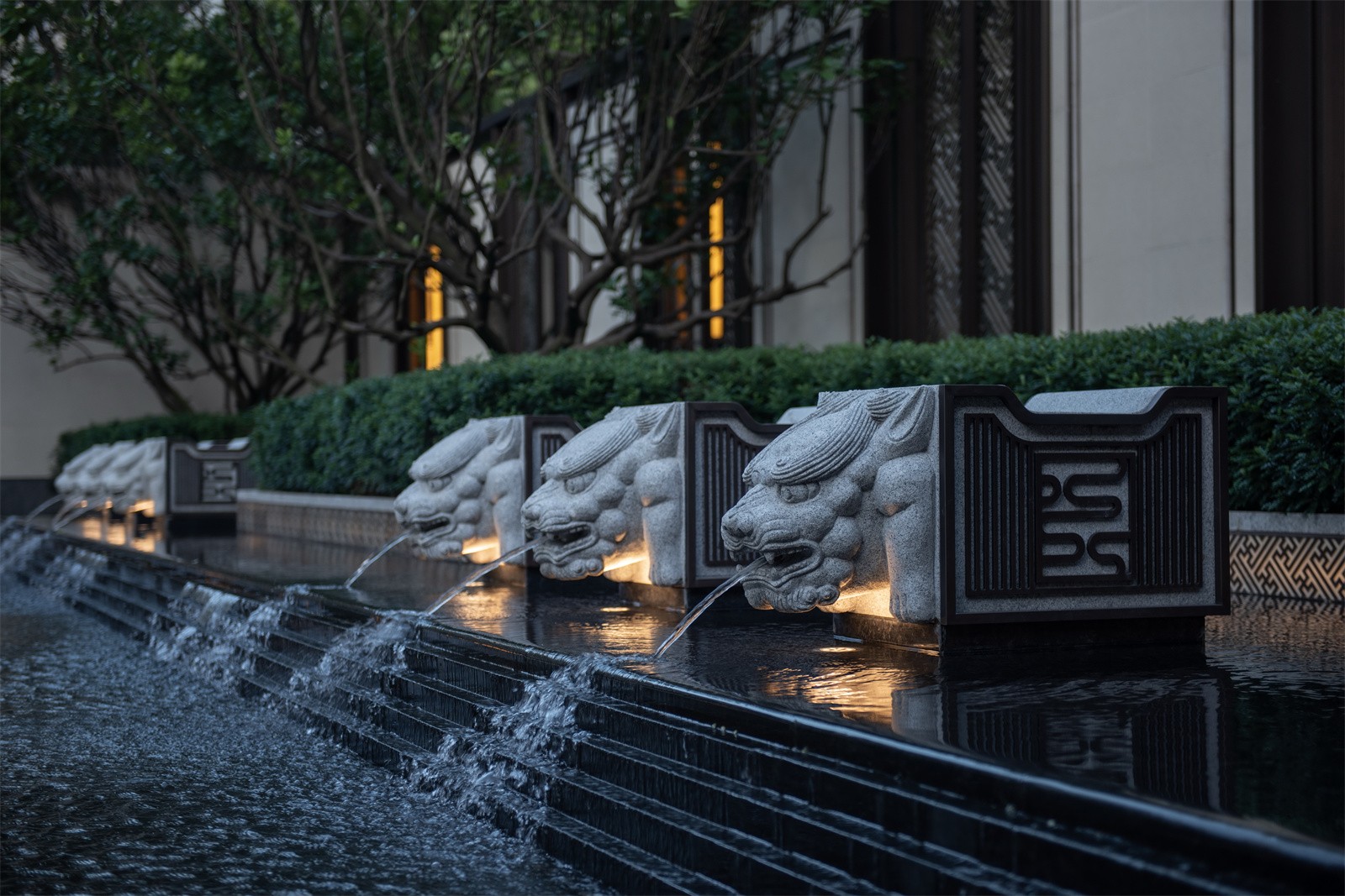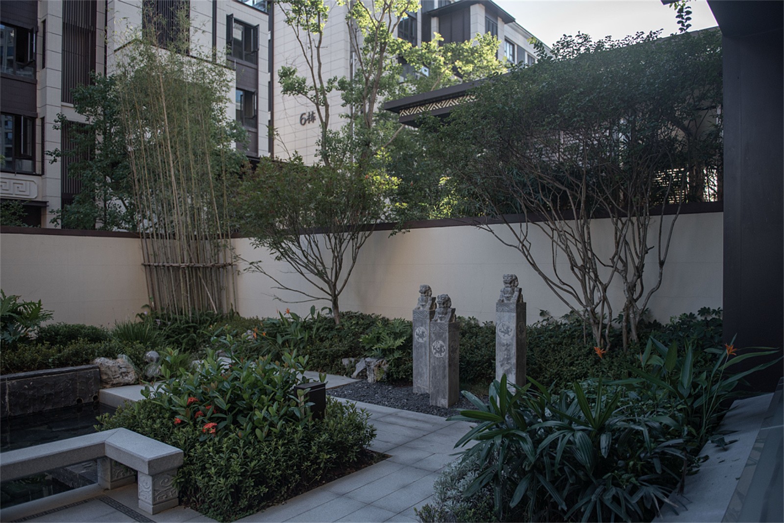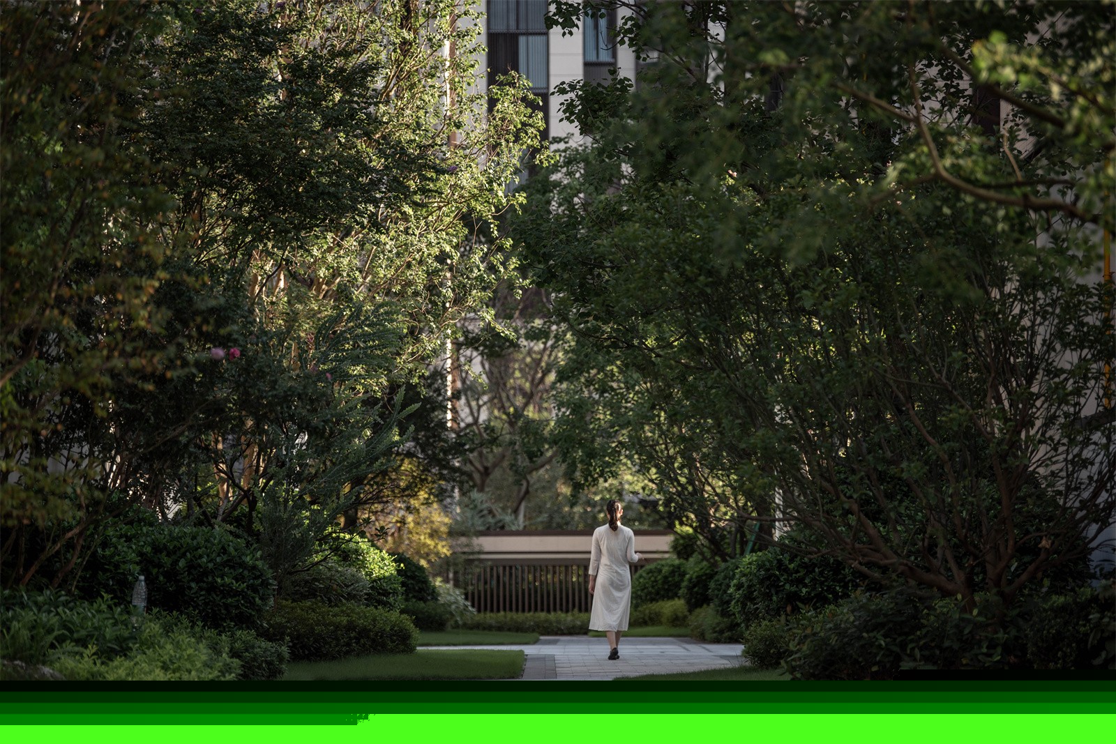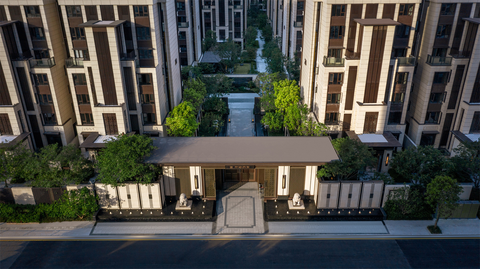 歸家的尊貴和儀式感在中軸進(jìn)一步延伸。最外兩側(cè)的綠化和通透景墻,既有分隔公共空間和私密宅間的作用,又通過節(jié)奏上的等比變化,將燈具裝飾于其中,同時順著縱深方向的對稱序列,圍合成儀式中軸空間。
