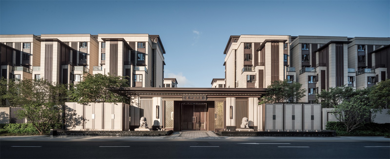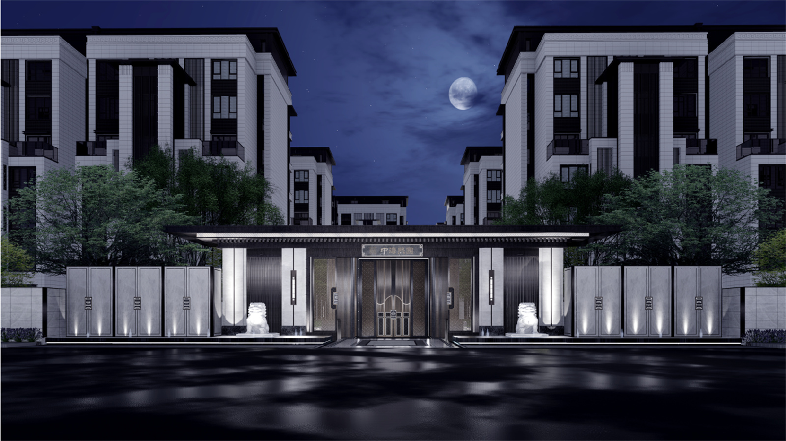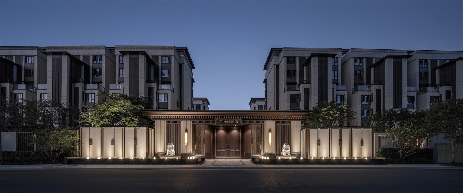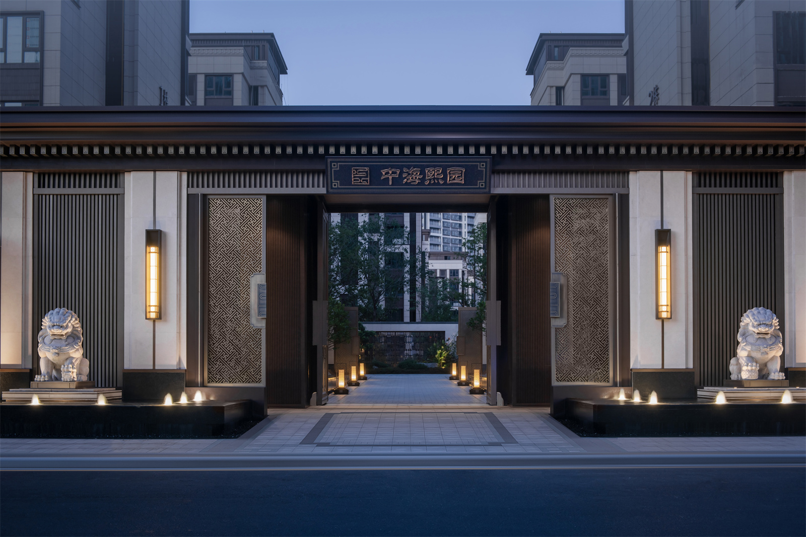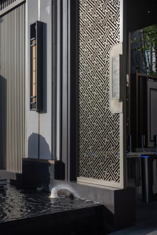 萬字紋是中國傳統(tǒng)紋樣,具有吉祥、萬福、萬壽之意,設(shè)計(jì)反旋并連續(xù)成圖案,讓有美好寓意的祝福,伴隨著歸家入門的一剎那。這一圖案也在圍墻,基座,燈飾等小區(qū)內(nèi)多處體現(xiàn),形成統(tǒng)一的元素特征。二側(cè)的圍墻也做了推手的裝飾,以區(qū)別于別的項(xiàng)目一般化的圍墻設(shè)計(jì)。