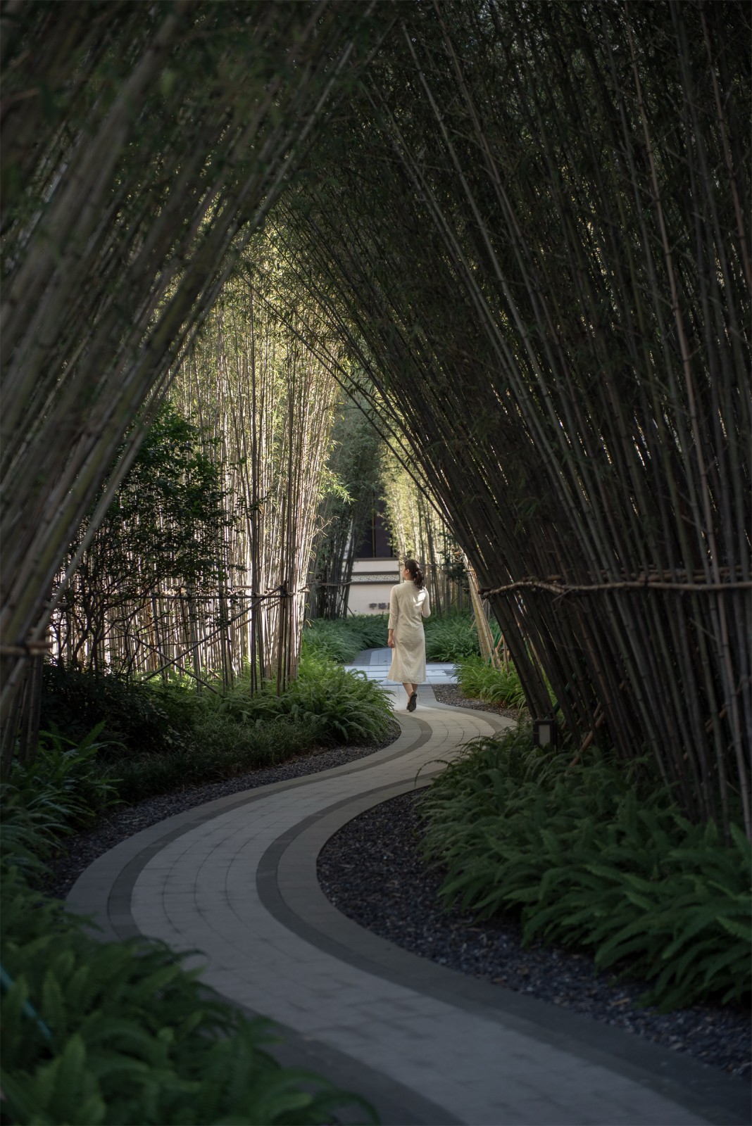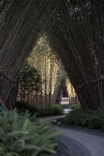 竹子在視覺上呈現(xiàn)垂直向上的狀態(tài),同時有“虛心有節(jié)”的文化內(nèi)涵,而且能夠起到一定的遮擋、掩飾、引導(dǎo)作用,或形成相對獨(dú)立的空間,竹林夾道短且營造出相對私密的空間,營造獨(dú)處、靜心的場所。