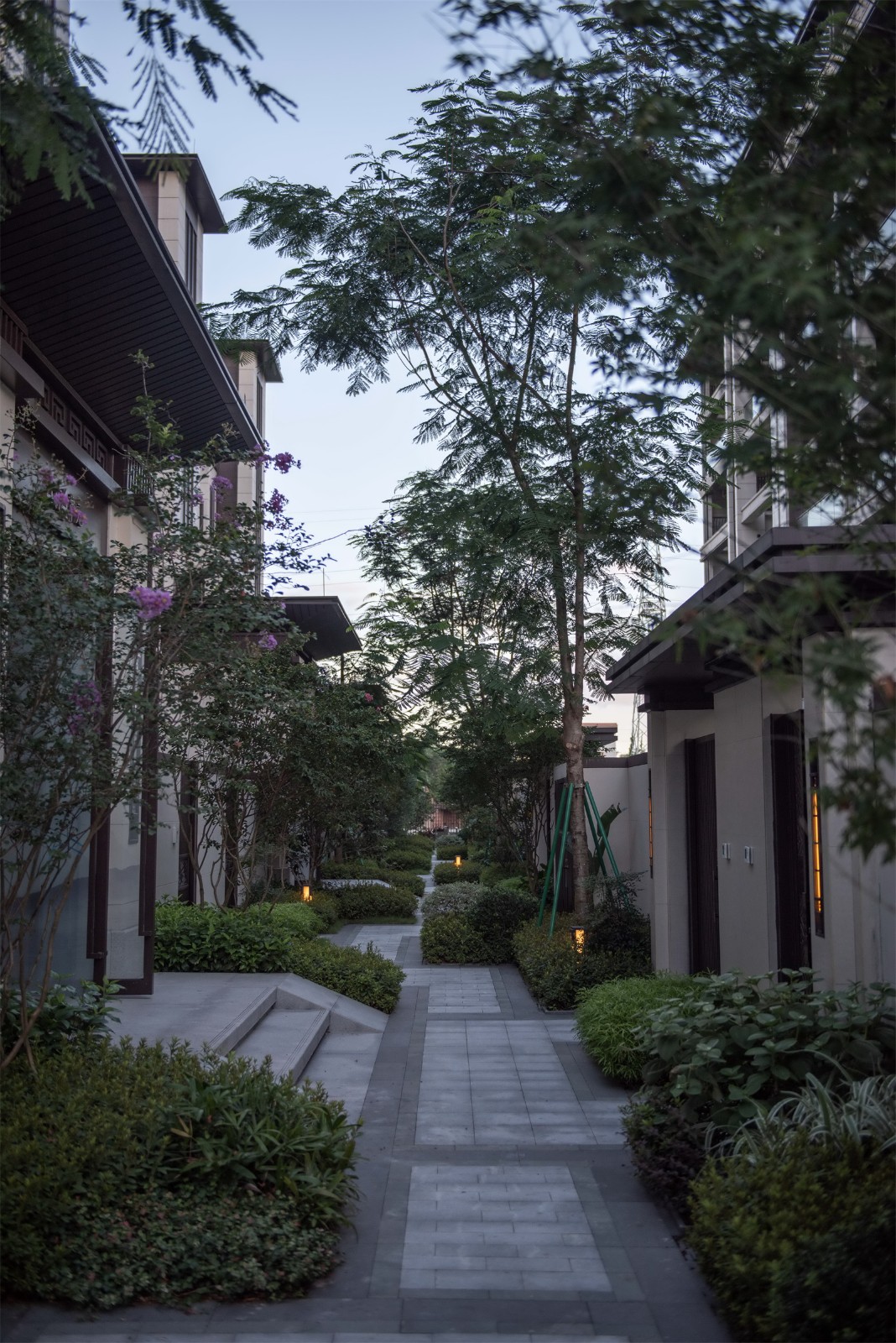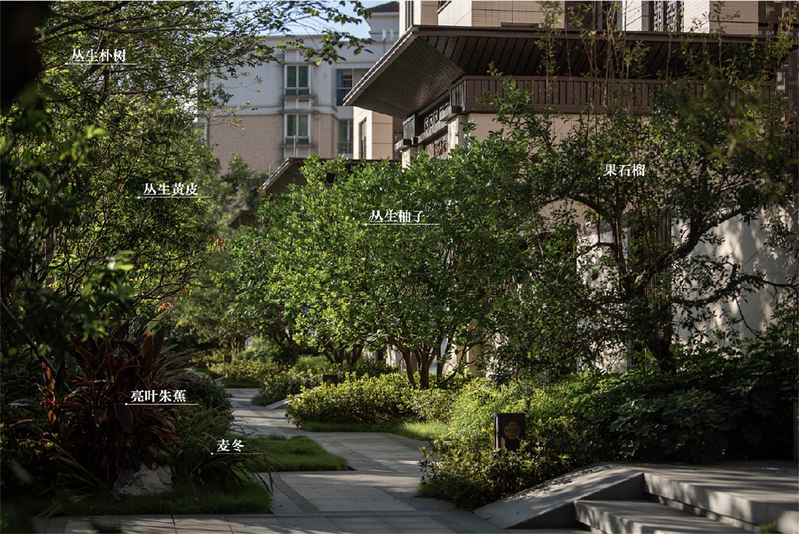 設(shè)計(jì)力爭在每個巷子通過柔性的植物去營造歸家的舒適感,避免過度的硬質(zhì)景觀。每個巷子點(diǎn)綴以基調(diào)植物品種,并以其他植物豐富之。例如:叢生樸樹、叢生柚子、鳳凰木、烏桕、洋紅風(fēng)鈴木、黃花風(fēng)鈴木、香樟等。觀葉觀花觀形、四季有季相,讓進(jìn)出家門的氛圍更舒適宜人。