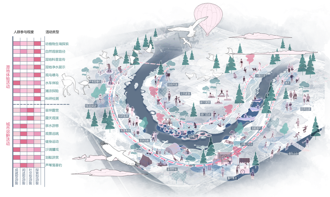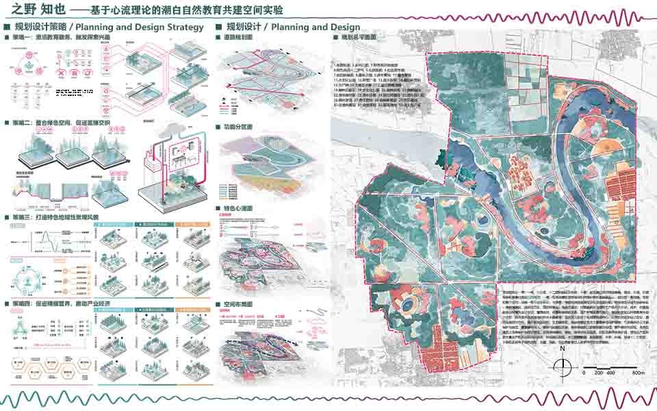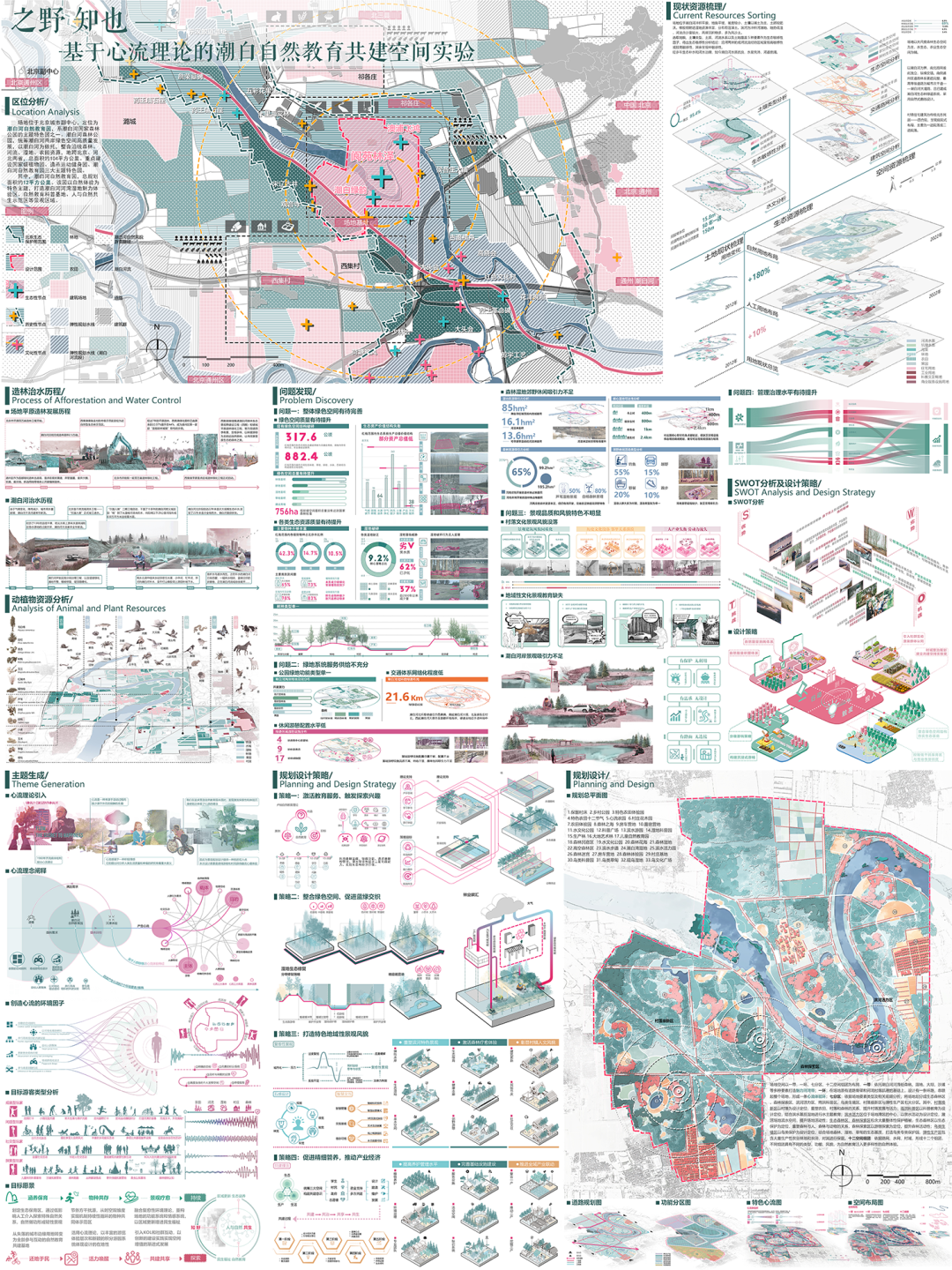 設(shè)計(jì)特色如下:(1)對(duì)1200公頃的場(chǎng)地前期分析,以潮白河為依托,整合沿線森林、河流、濕地、農(nóng)田資源,打造以自然教育體驗(yàn)為特色的主題園。(2)提出心流理論,嘗試將該理論與景觀規(guī)劃相結(jié)合,以游客需求出發(fā),提出適宜的人群畫(huà)像和創(chuàng)造產(chǎn)生心流的環(huán)境要素,作為場(chǎng)地規(guī)劃的行動(dòng)指南。(3)規(guī)劃場(chǎng)地分成多個(gè)區(qū)塊,詳細(xì)闡釋分區(qū)設(shè)計(jì)的具體策略和場(chǎng)景效果。并深化專項(xiàng)設(shè)計(jì)。
