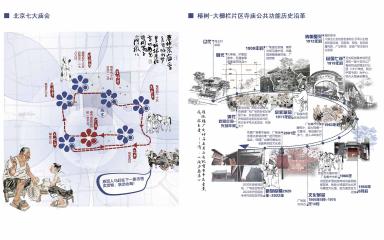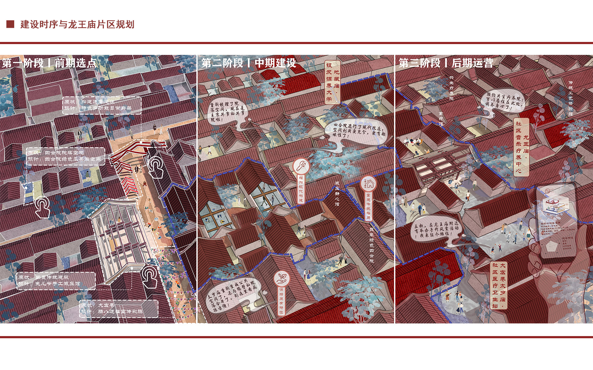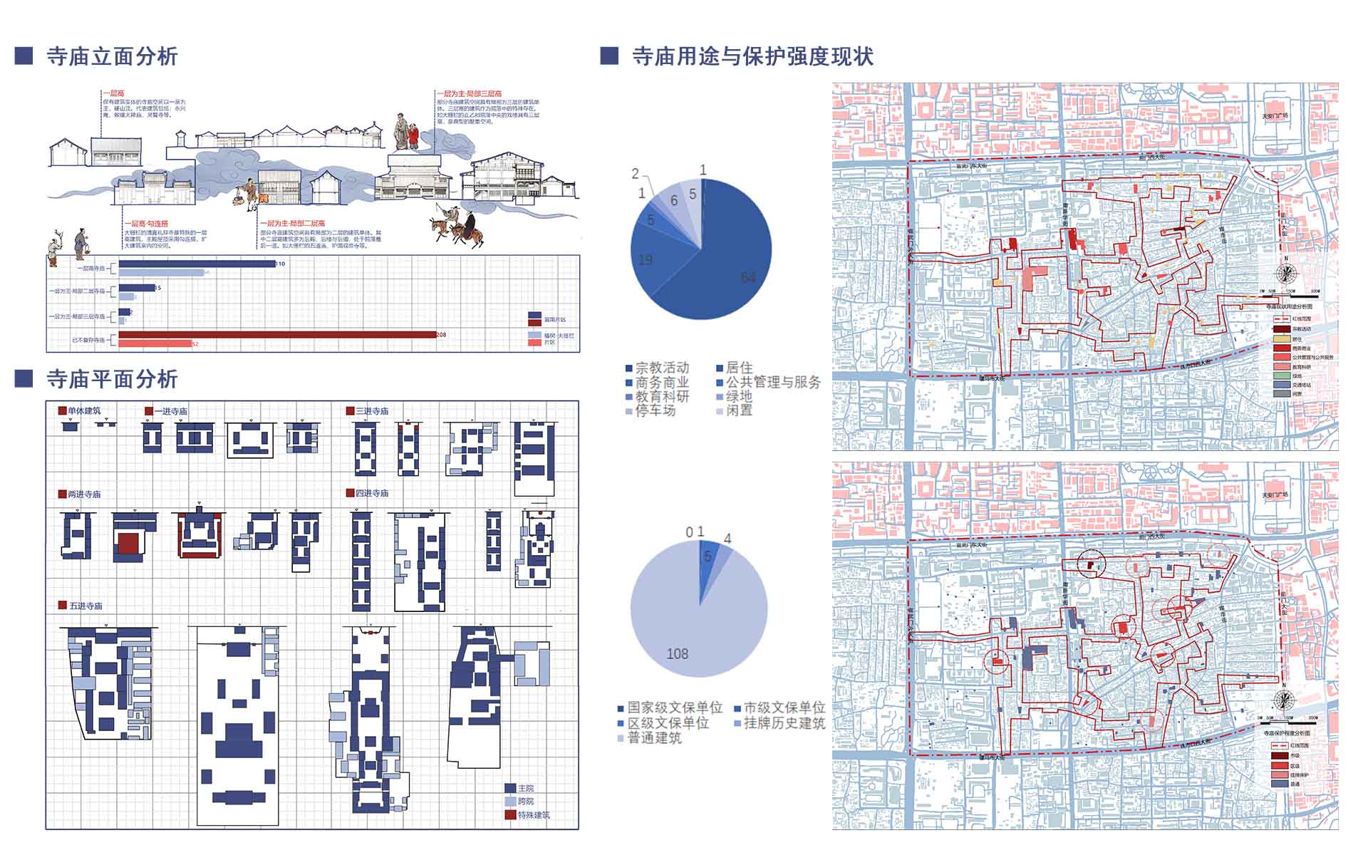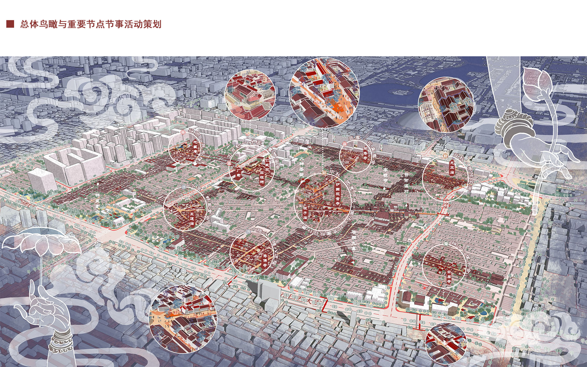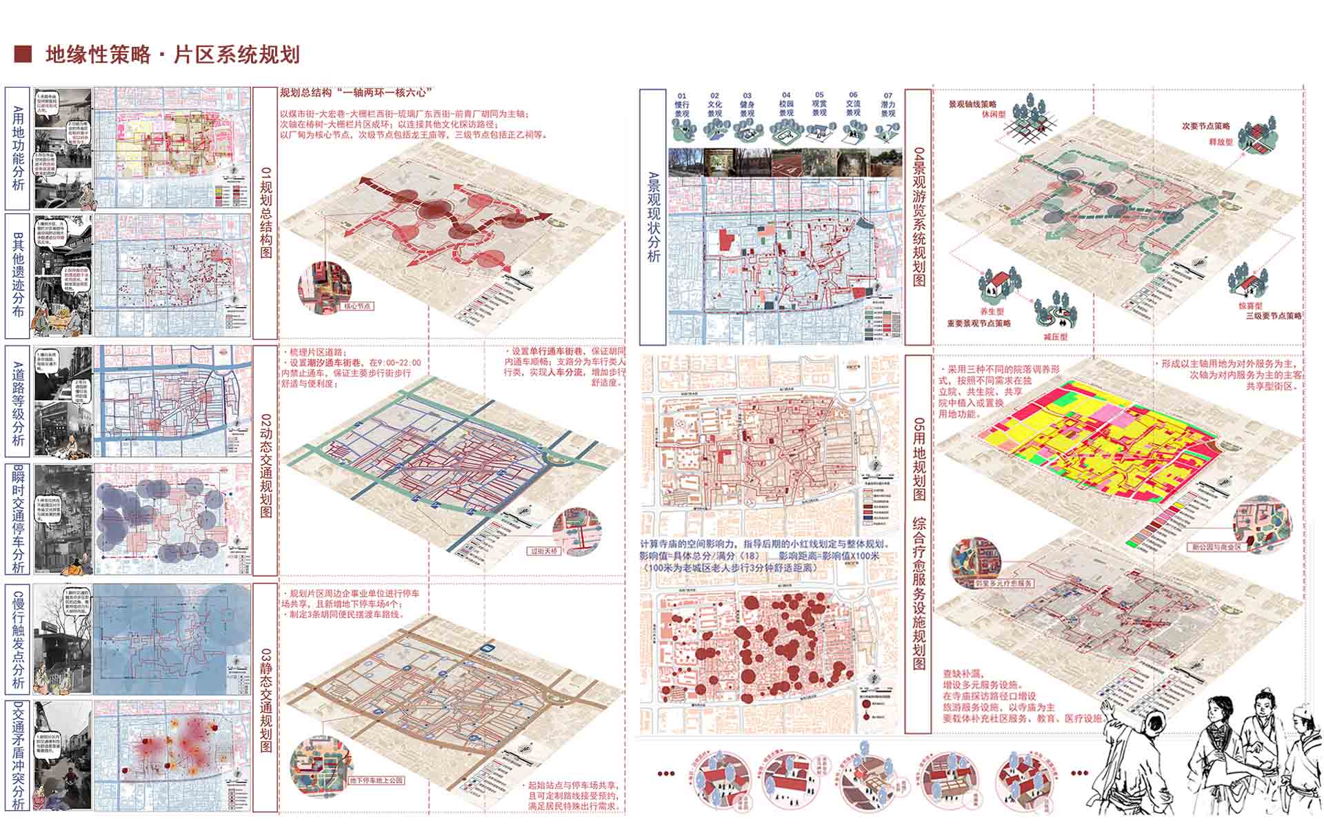 綜合以上專項(xiàng)規(guī)劃,形成了新增服務(wù)設(shè)施規(guī)劃與綜合用地功能規(guī)劃,構(gòu)造了主客共享的新格局。, 而在交通更新中,對(duì)于不同的現(xiàn)狀交通要素進(jìn)行分析,形成了動(dòng)態(tài)交通規(guī)劃、靜態(tài)交通規(guī)劃,比如規(guī)劃了共享停車場(chǎng)與3條胡同便民擺渡車路線;在景觀規(guī)劃中,對(duì)于現(xiàn)狀中的景觀與寺廟的關(guān)系進(jìn)行分析,得出一軸三環(huán)的景觀游覽規(guī)劃,并以不同的景觀策略指導(dǎo)軸線與節(jié)點(diǎn)的設(shè)計(jì)。