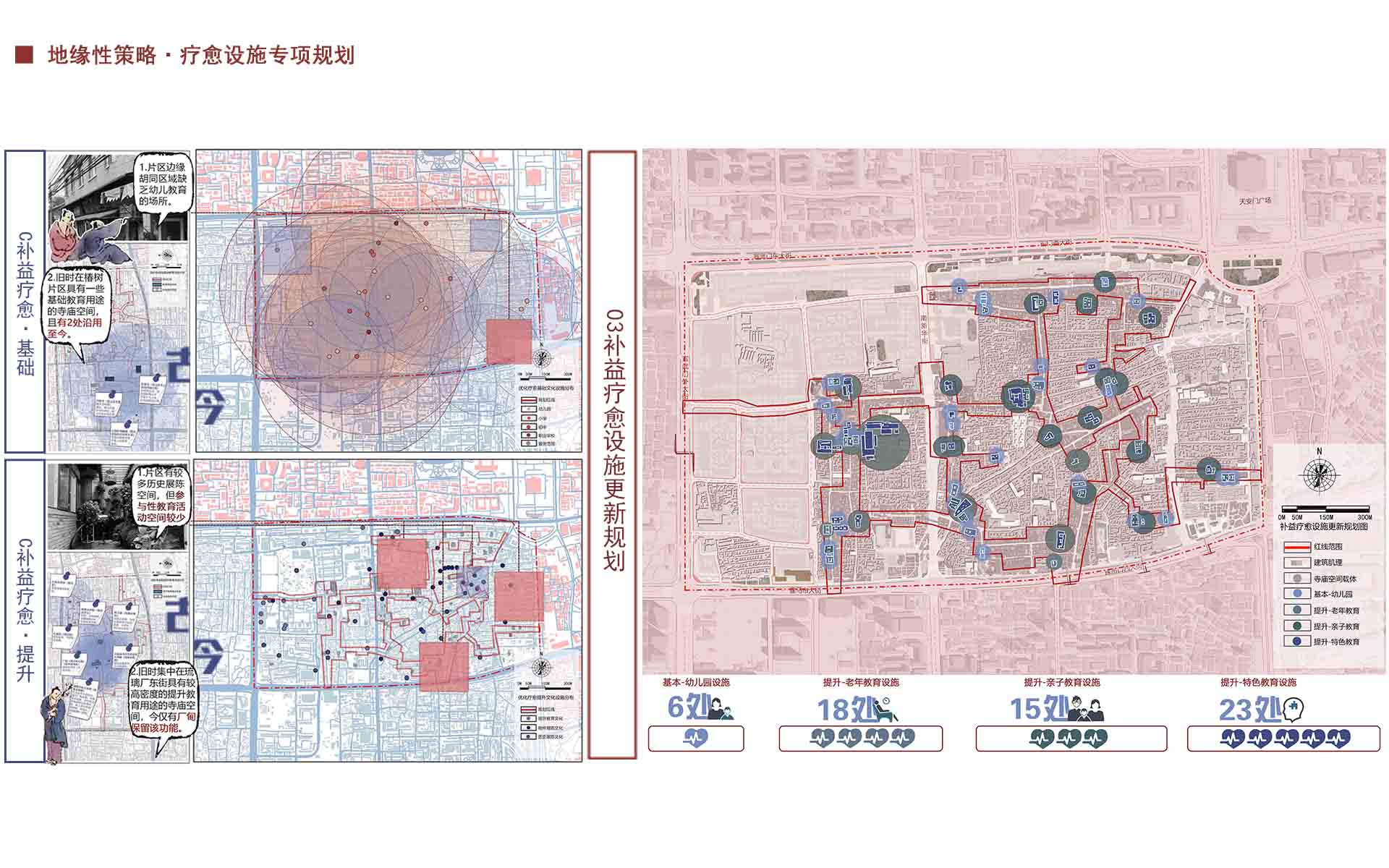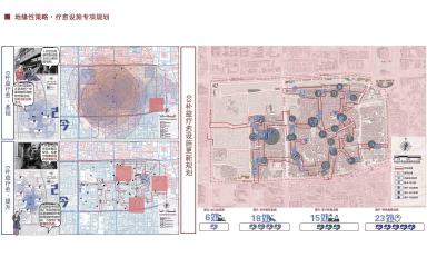 第二部分是對(duì)于服務(wù)設(shè)施進(jìn)行的三項(xiàng)專項(xiàng)規(guī)劃,以保障療愈設(shè)施規(guī)劃為例,其分析了在歷史時(shí)期與現(xiàn)狀中寺廟與片區(qū)的醫(yī)療衛(wèi)生設(shè)施情況,在紅線范圍內(nèi)規(guī)劃5類保障療愈設(shè)施共26處;其中在寺廟中植入的保障療愈業(yè)態(tài)有5處,其中1處寺廟恢復(fù)為原來(lái)用途。