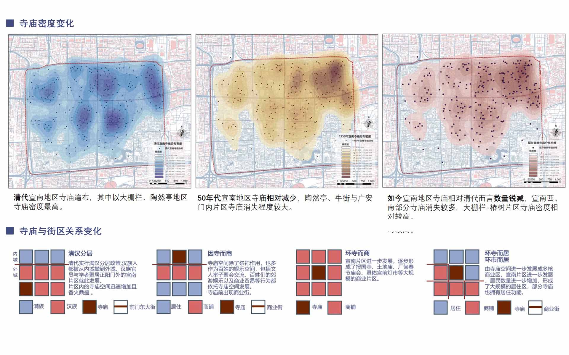 鳥瞰整個(gè)片區(qū),總結(jié)寺廟與街區(qū)模式的變化、寺廟的密度變化與現(xiàn)存寺廟的空間分布情況。值得關(guān)注的是本次研究所涉宣南片區(qū)321處有記載的寺廟空間中,現(xiàn)存的127處寺廟也大多集中分布在椿樹-大柵欄街區(qū)。