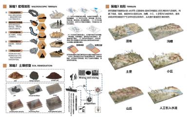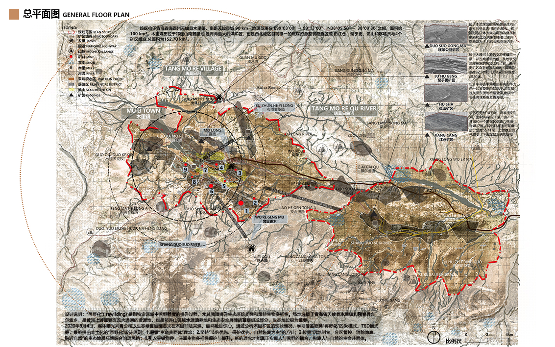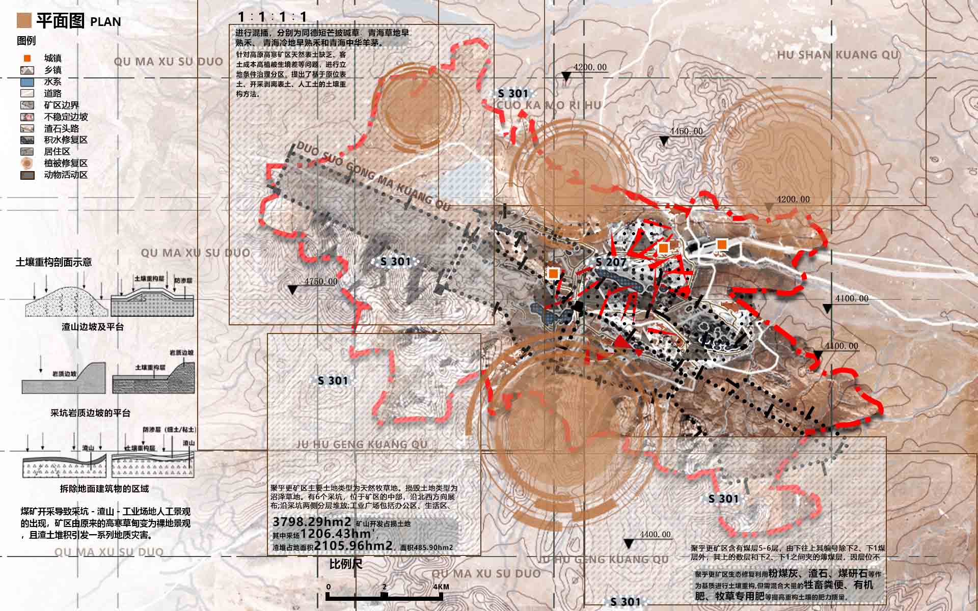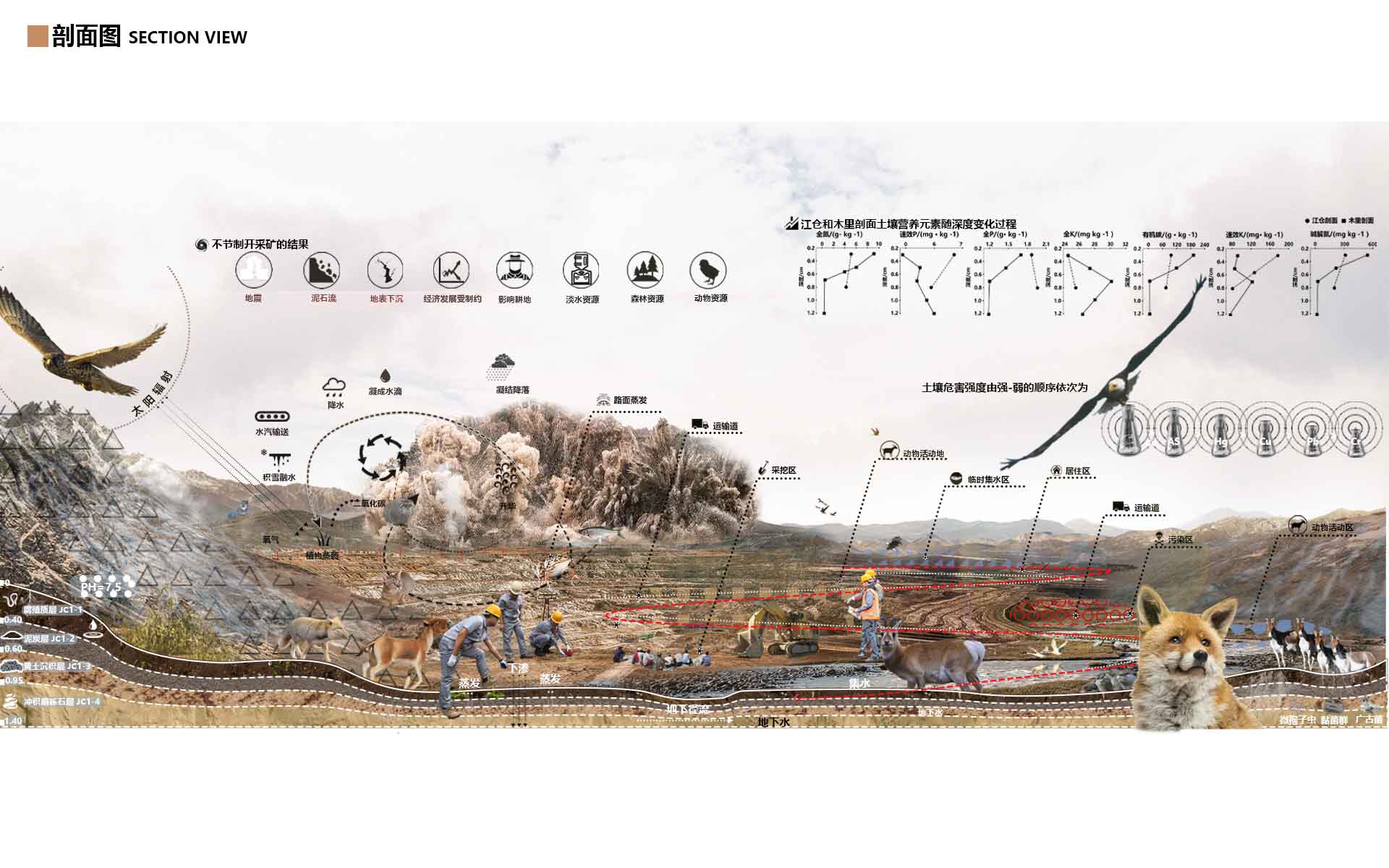 ▲場地信息通過前期相關(guān)分析,將礦區(qū)問題歸納為自然景觀破壞、生態(tài)服務(wù)功能降低、生態(tài)系統(tǒng)退化、地表水源破壞、地質(zhì)環(huán)境風(fēng)險(xiǎn)及環(huán)境污染六大類,并進(jìn)一步細(xì)化為“露天開采挖損草場、表土資源缺乏、水源涵養(yǎng)功能受損、地山沉陷、邊坡失穩(wěn)、井巷安全隱患、生物棲息地范圍縮小......”等12項(xiàng)具體問題。同時(shí)參照前人相關(guān)研究結(jié)果,比對非法采礦前后木里地區(qū)水源涵養(yǎng)、土壤保持、土壤有機(jī)質(zhì)含量等相關(guān)數(shù)據(jù),厘清問題源頭,思考修復(fù)之道。木里礦區(qū)的現(xiàn)實(shí)境況使我們深刻意識到當(dāng)前階段對其進(jìn)行生態(tài)修復(fù)的急迫性與必要性。