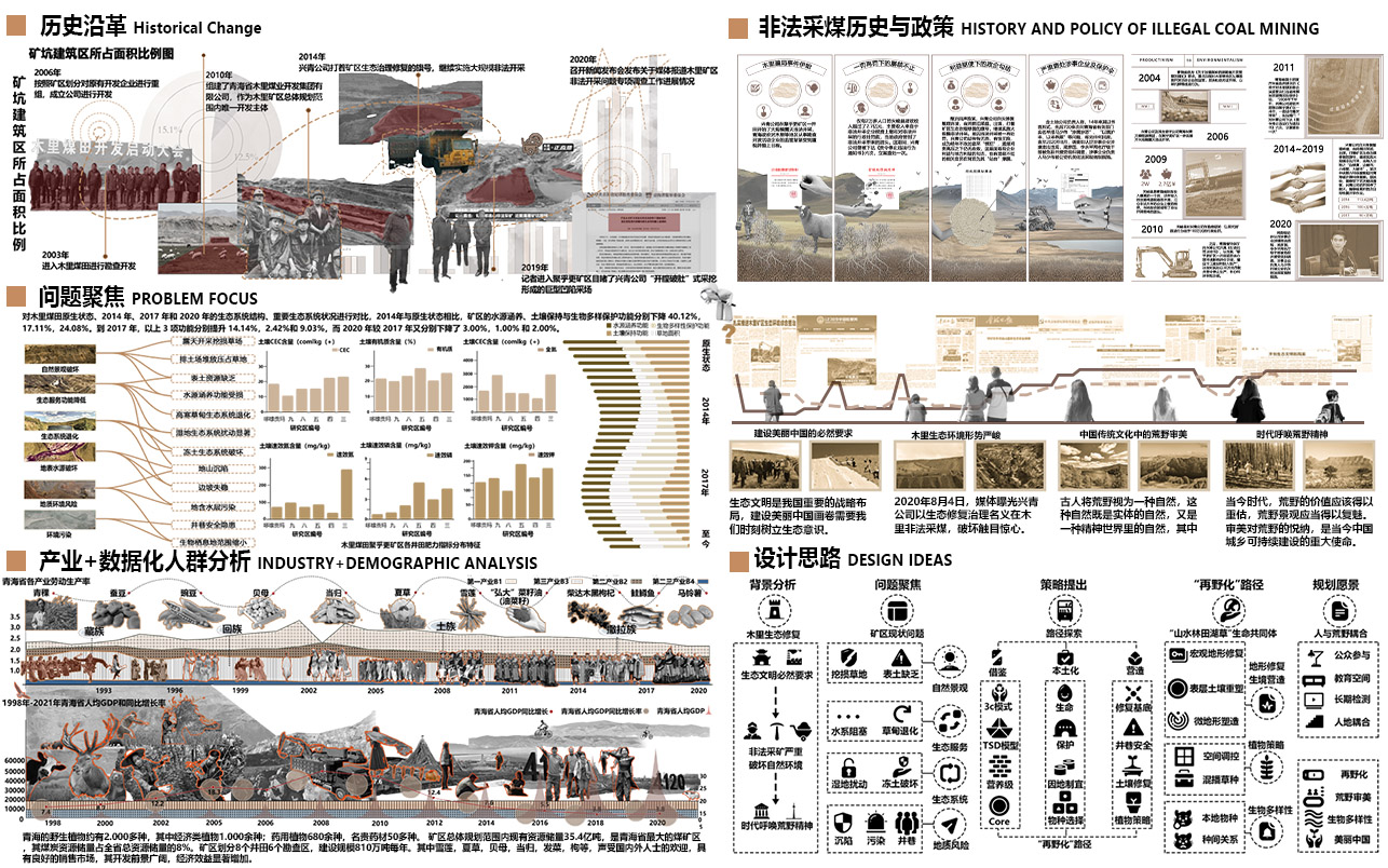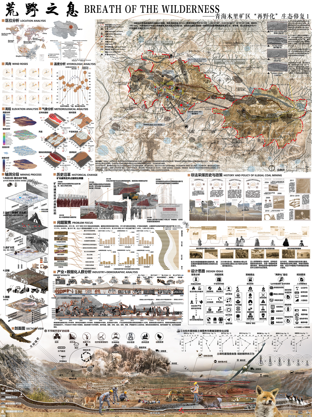 本次項(xiàng)目聚焦于青海木里礦區(qū)非法采礦這一社會熱點(diǎn)事件。以再野化為核心設(shè)計(jì)策略,團(tuán)隊(duì)聚集不同學(xué)科、不同專業(yè)、不同院校背景的成員,從多角度、多領(lǐng)域、多學(xué)科交叉融合等不同視角出發(fā),小組通過文獻(xiàn)閱讀、會議討論,探索高原高寒地區(qū)再野化生態(tài)修復(fù)策略,并嘗試在實(shí)踐中進(jìn)一步落實(shí)再野化的中國方案。