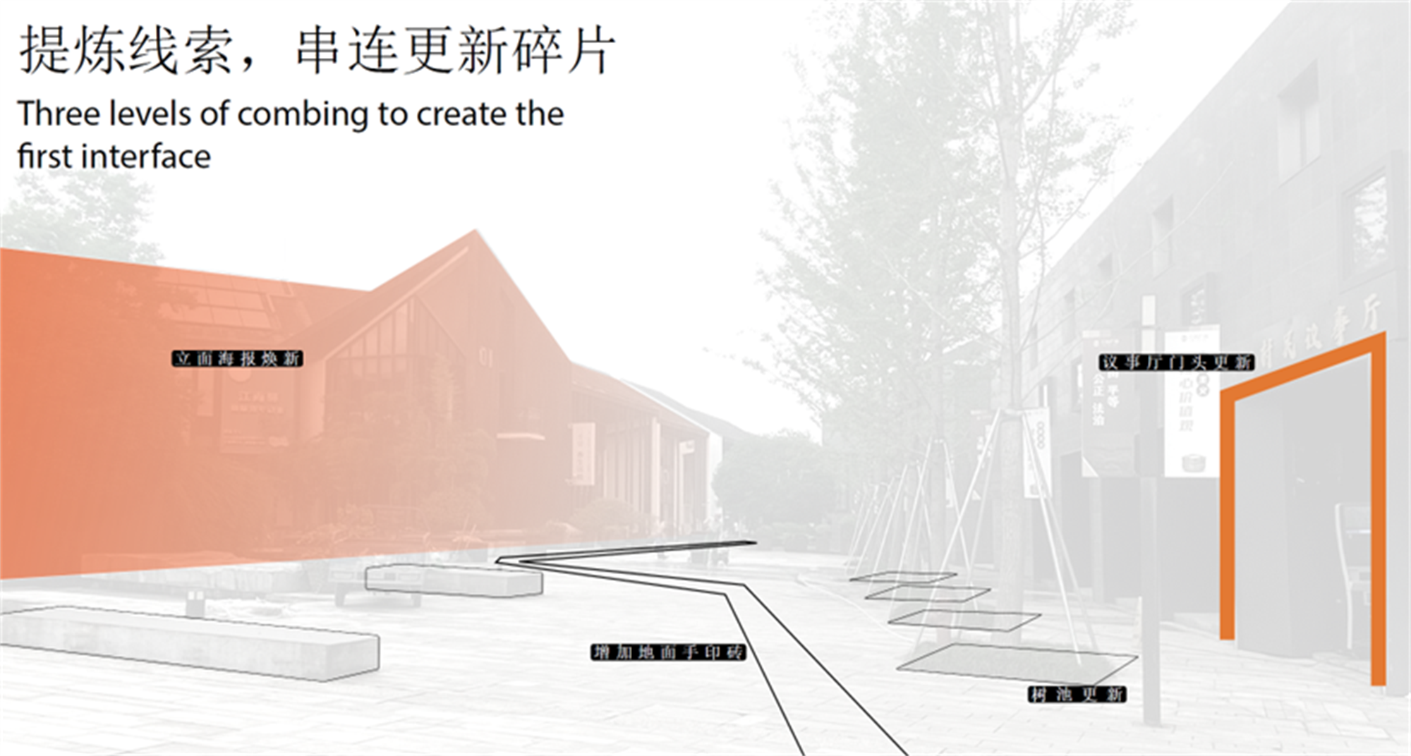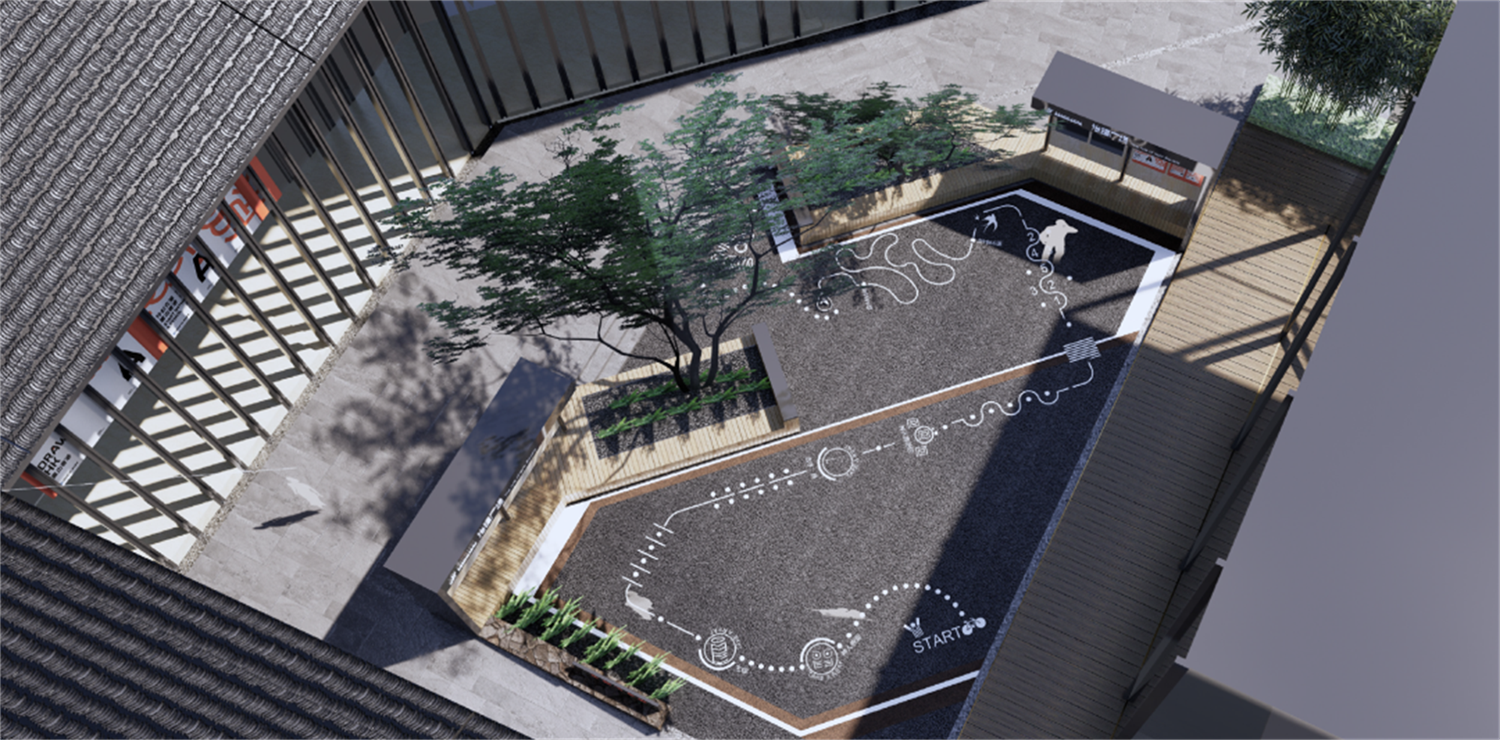 將原本置于法治小廣場正中央的小樹林移走,我們重新設(shè)計(jì)了小廣場的布局,營造出更開放的空間形態(tài),為到達(dá)此處的村民獲得更多的功能性——帶小孩的家長去社區(qū)服務(wù)中心辦事,小孩可以在開闊的小廣場上自己玩耍;散步到此的村民會被煥新后的公告欄吸引,了解村里發(fā)生的大小事。
