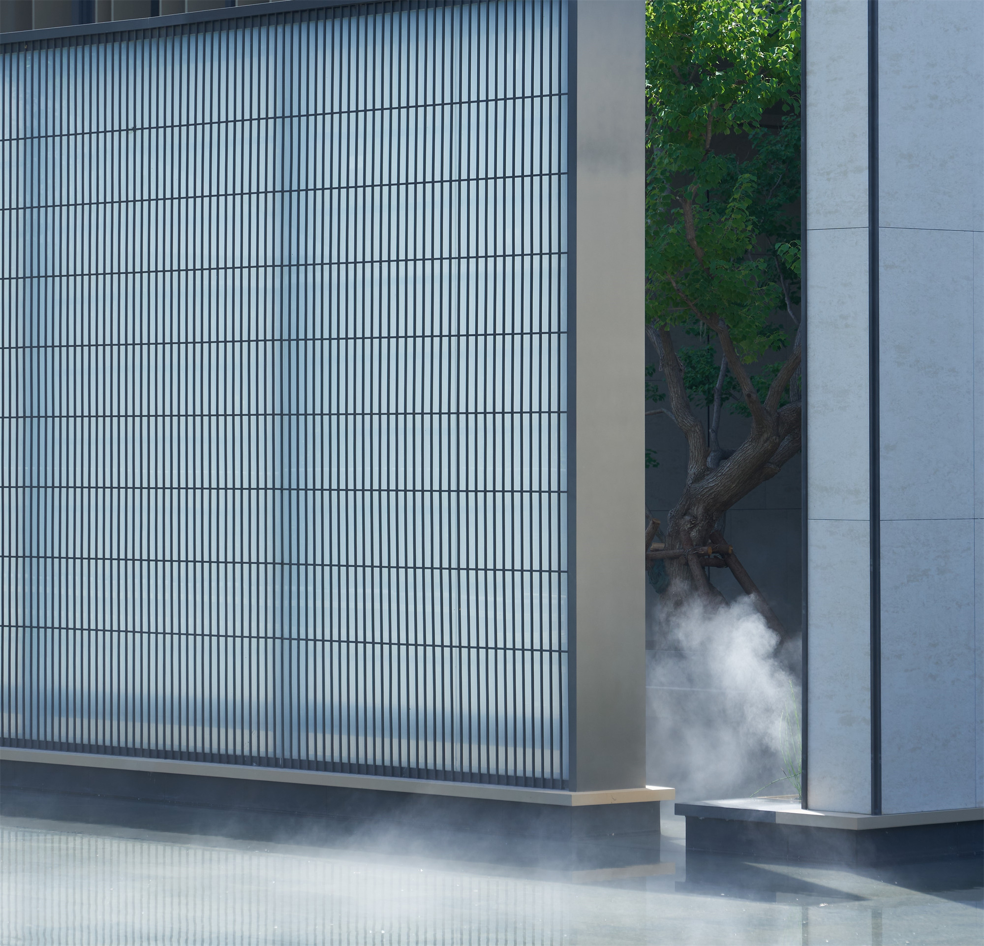 松·生活館:幾個(gè)建筑體圍合成中心水院與一個(gè)不同形態(tài)的庭院,以人的行進(jìn)動(dòng)線把幾個(gè)空間進(jìn)行串聯(lián),在轉(zhuǎn)換中感受行游的驚喜,傳遞格調(diào)品質(zhì)。