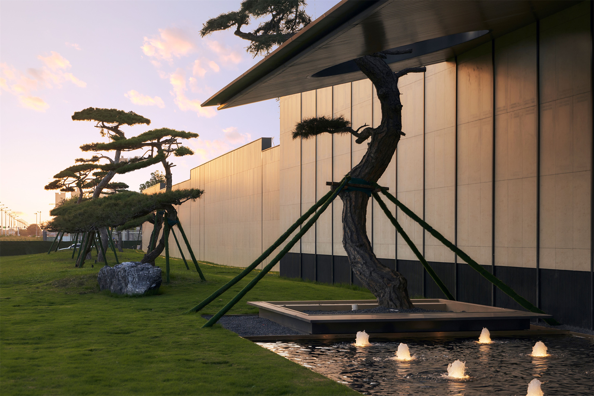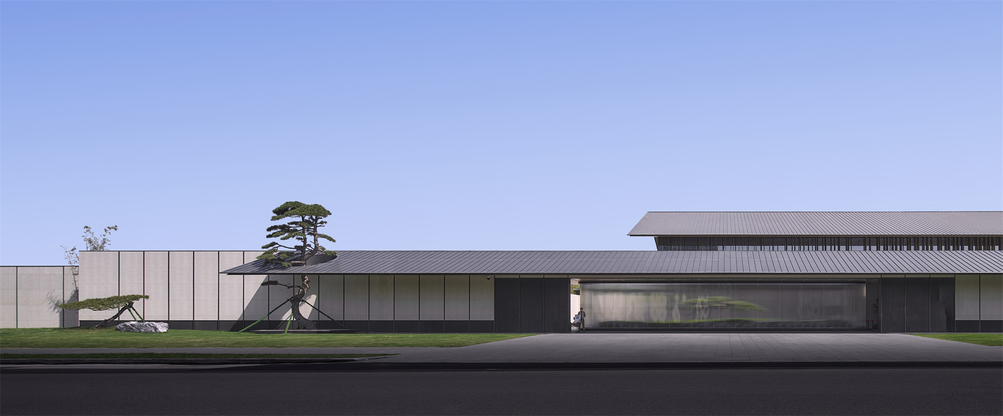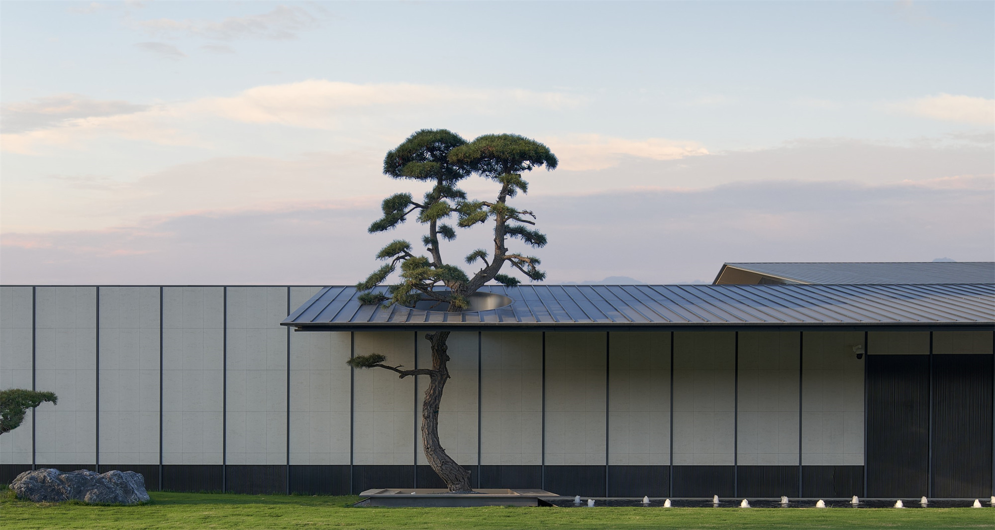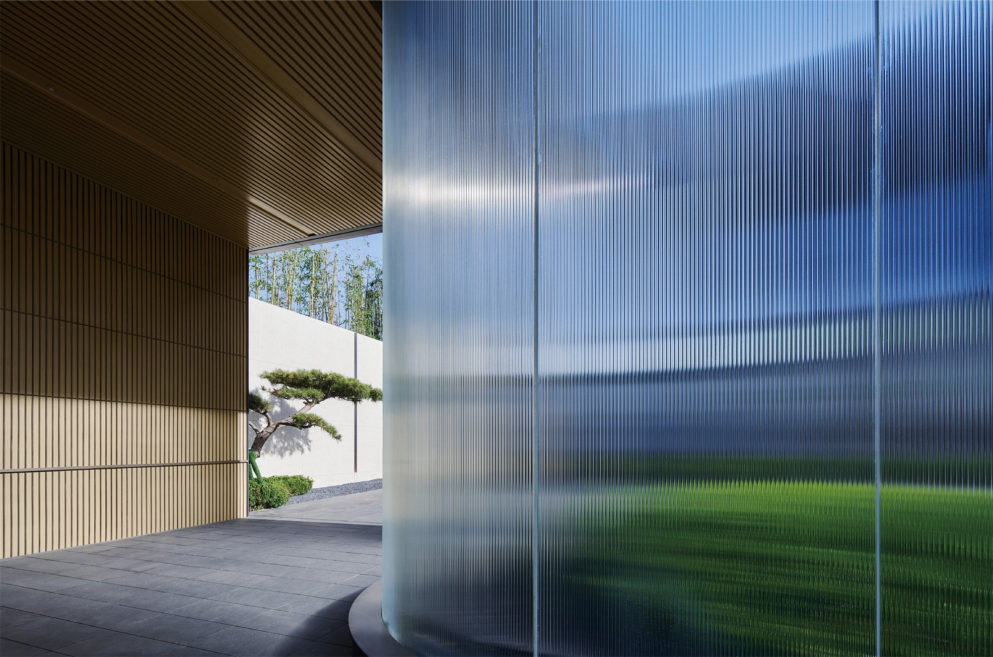 視線在入口處聚焦,松王的乍見(jiàn)之歡帶來(lái)尺度下的力量感。而在長(zhǎng)虹玻璃的隱約下,背后斜飄松的形態(tài)同樣幻化出寫意的美感。