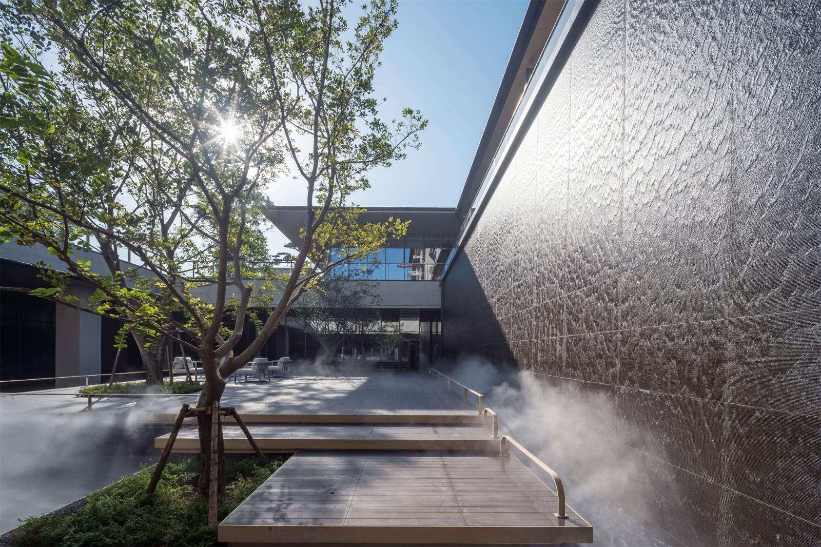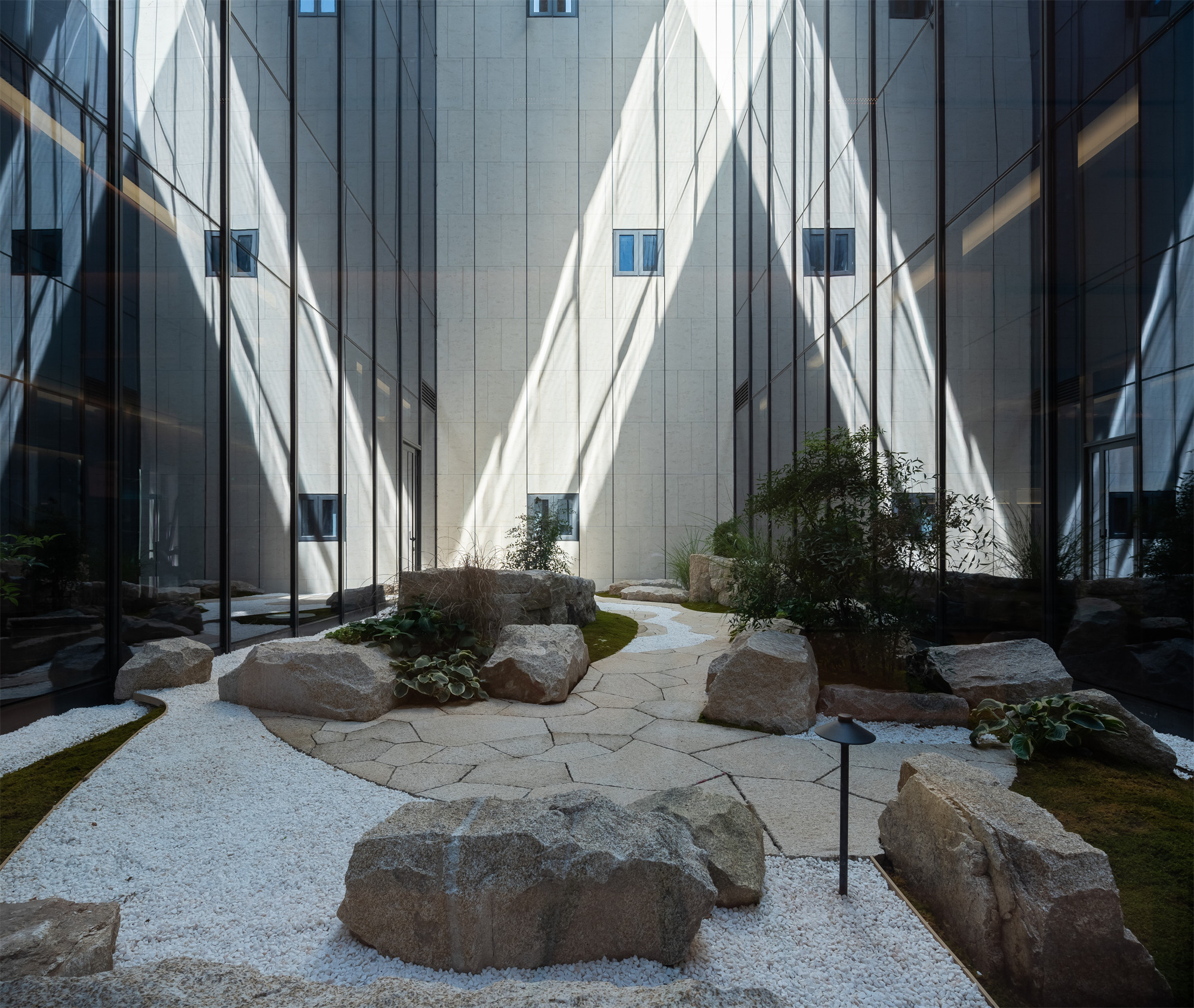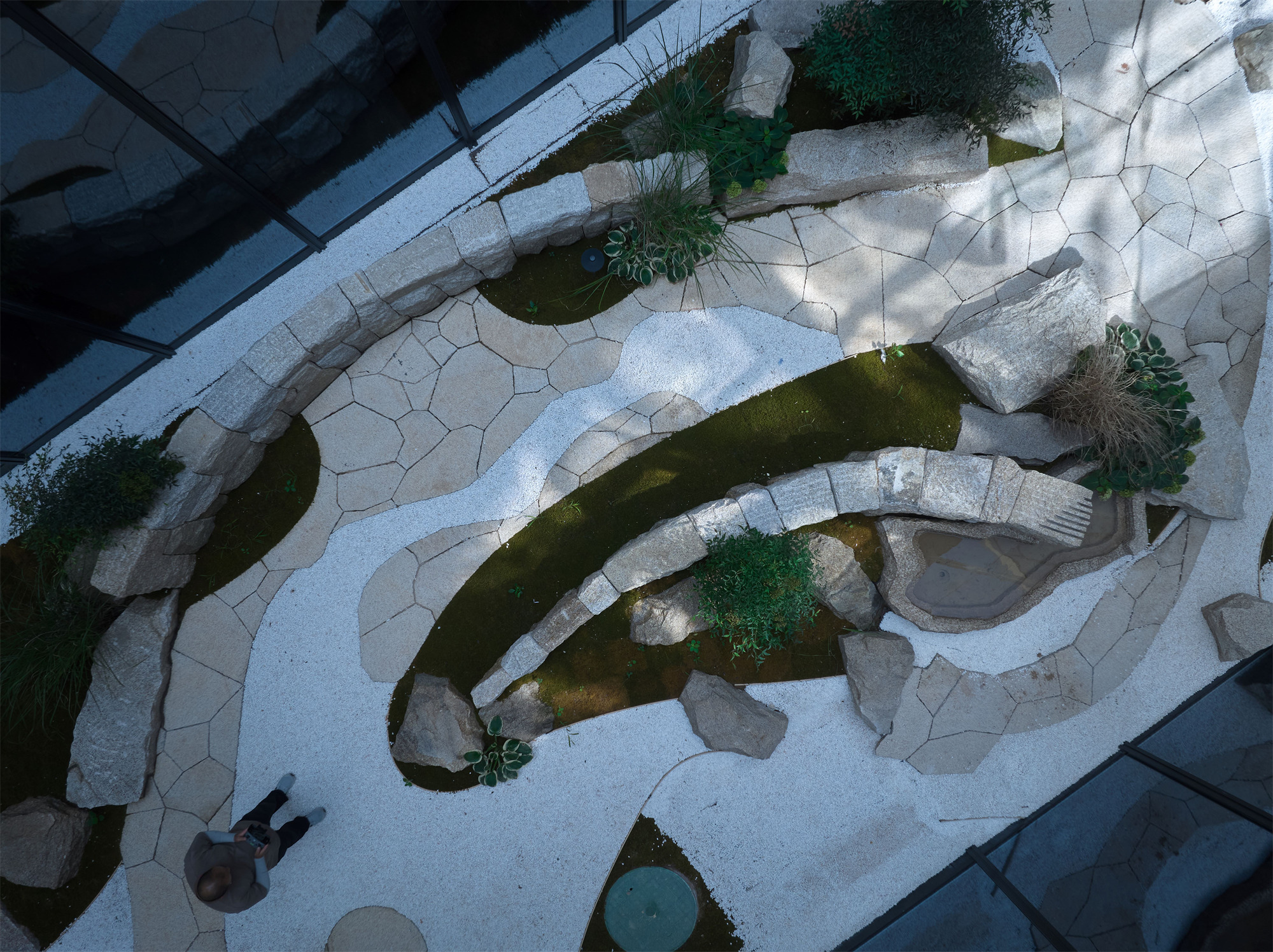 除了核心的下沉庭院外,生活館內(nèi)還有幾處禪意小院,以賞為主,將置石與微地形相結(jié)合,并進(jìn)行飽含工匠精神的打鑿,在光的導(dǎo)入下直擊內(nèi)心深處的冥思。