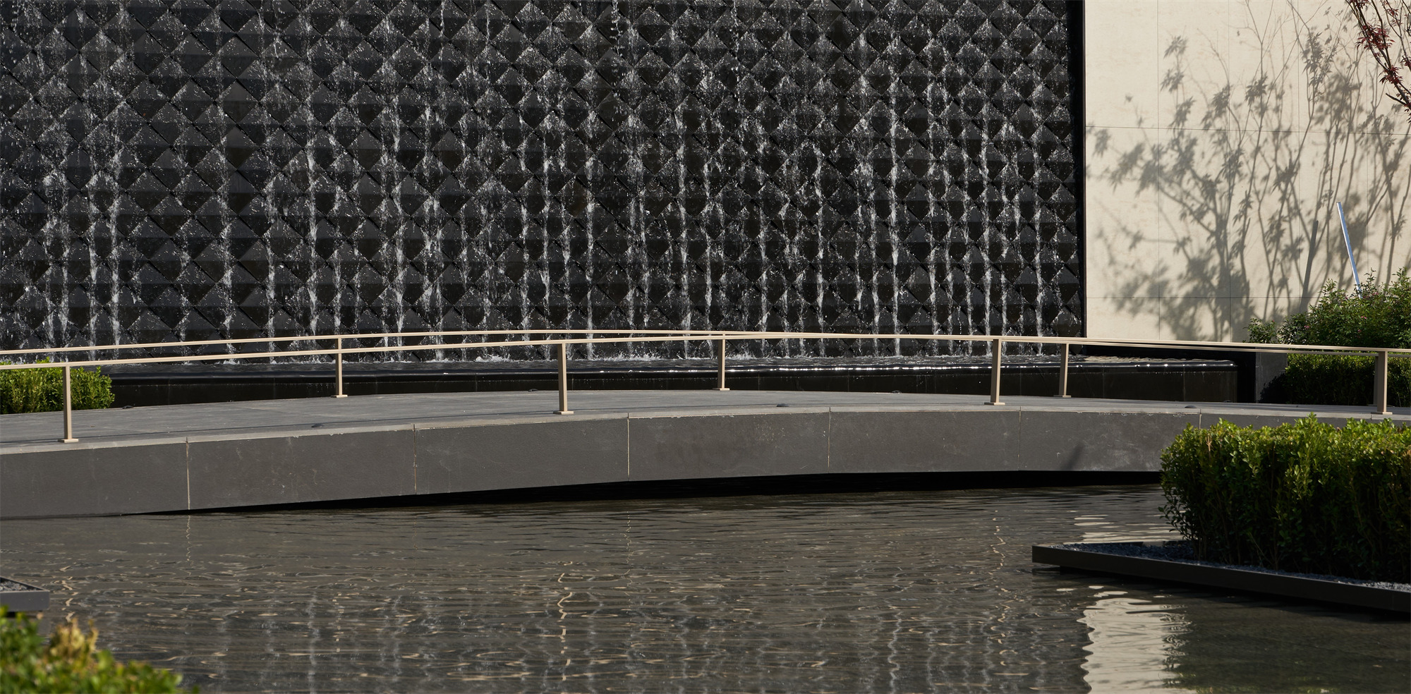 虛實(shí)墻體間的對(duì)立,讓空間多了些許透亮。跌瀑是整個(gè)水院的核心,動(dòng)態(tài)的聲音激發(fā)了空間的想象力。臨水而坐方能感受寧?kù)o表象之外的愜意。