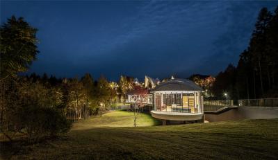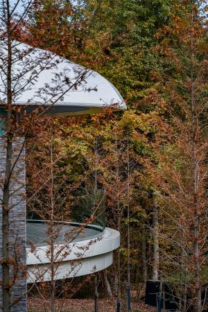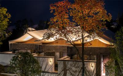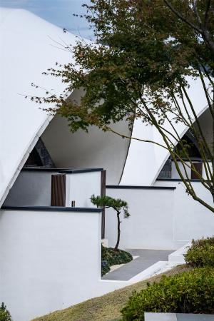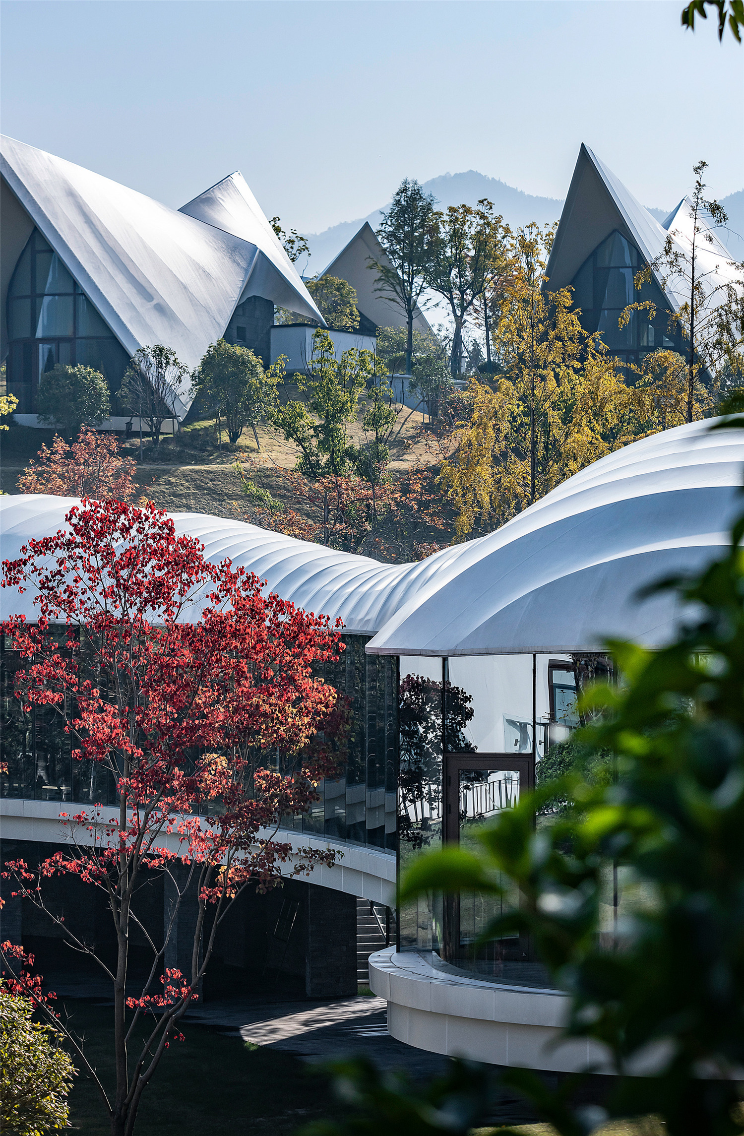 造型獨(dú)特的建筑如同長在山林里,被繁盛的草木包裹、遮掩,若隱若現(xiàn)?!蔼q抱琵琶半遮面”的即視感不知自然從何處終,也不知建筑從哪里始。