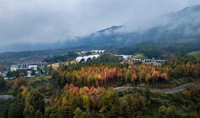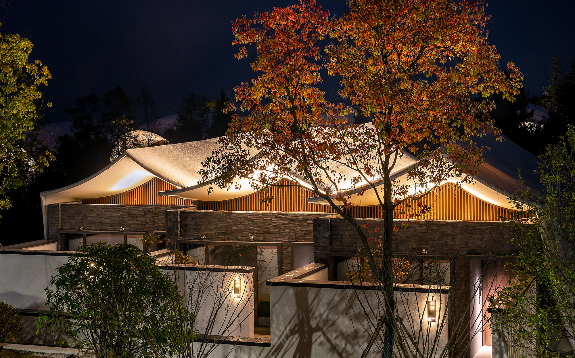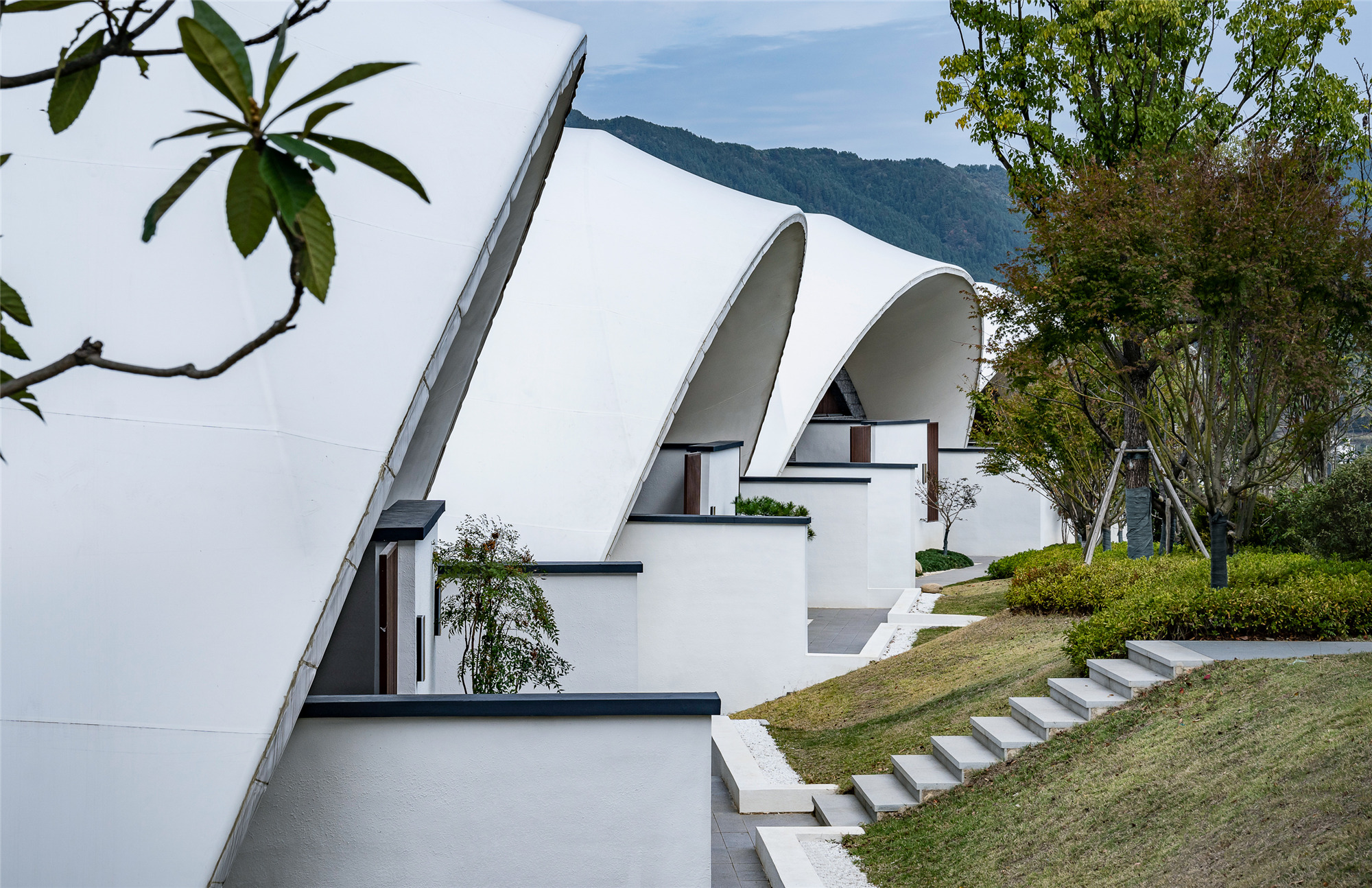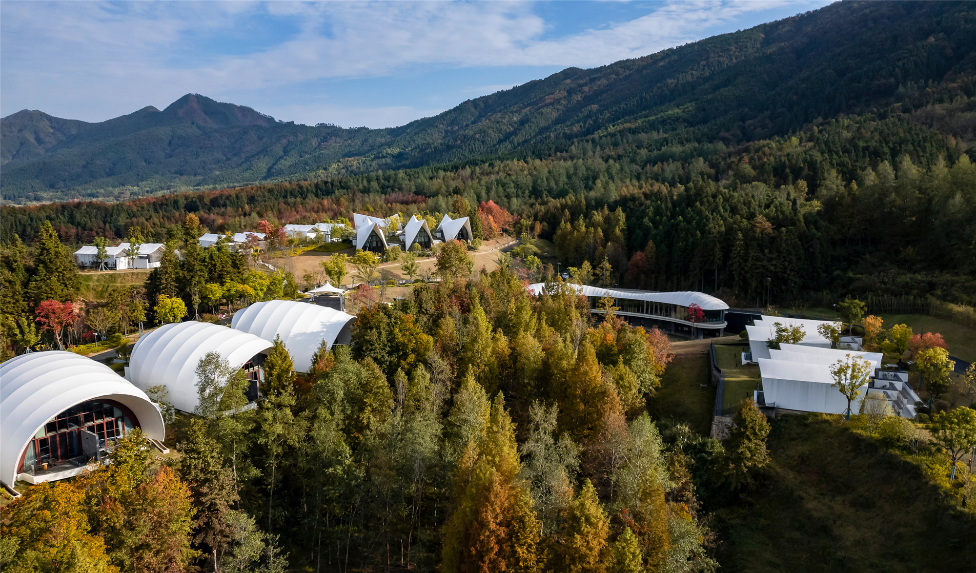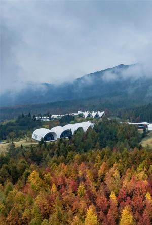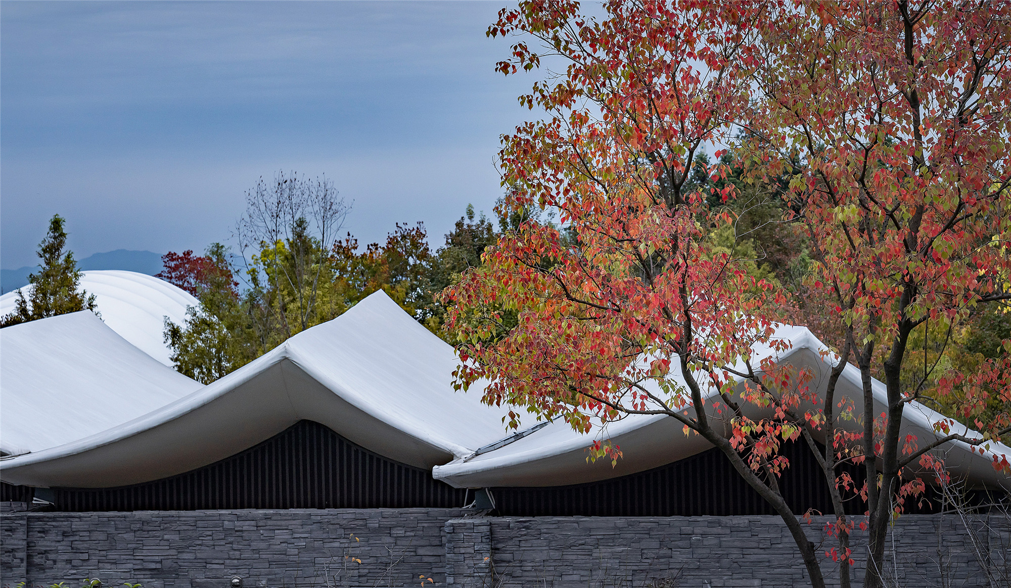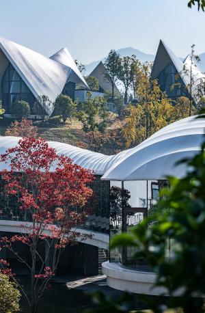 層林掩映下白色帳篷式的建筑依山而建、接山連地,融于群山漫野中,給濃郁的山色增添了一抹清新之氣。