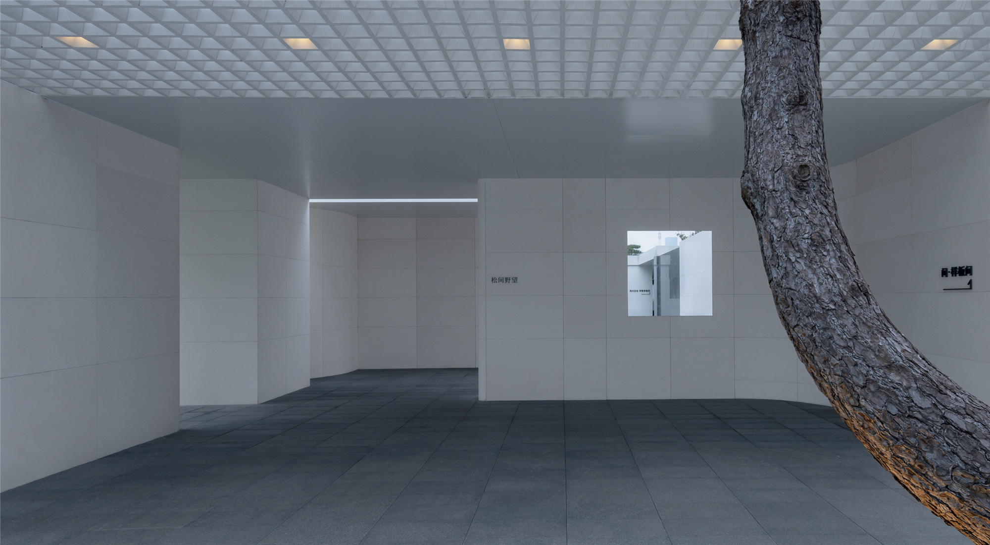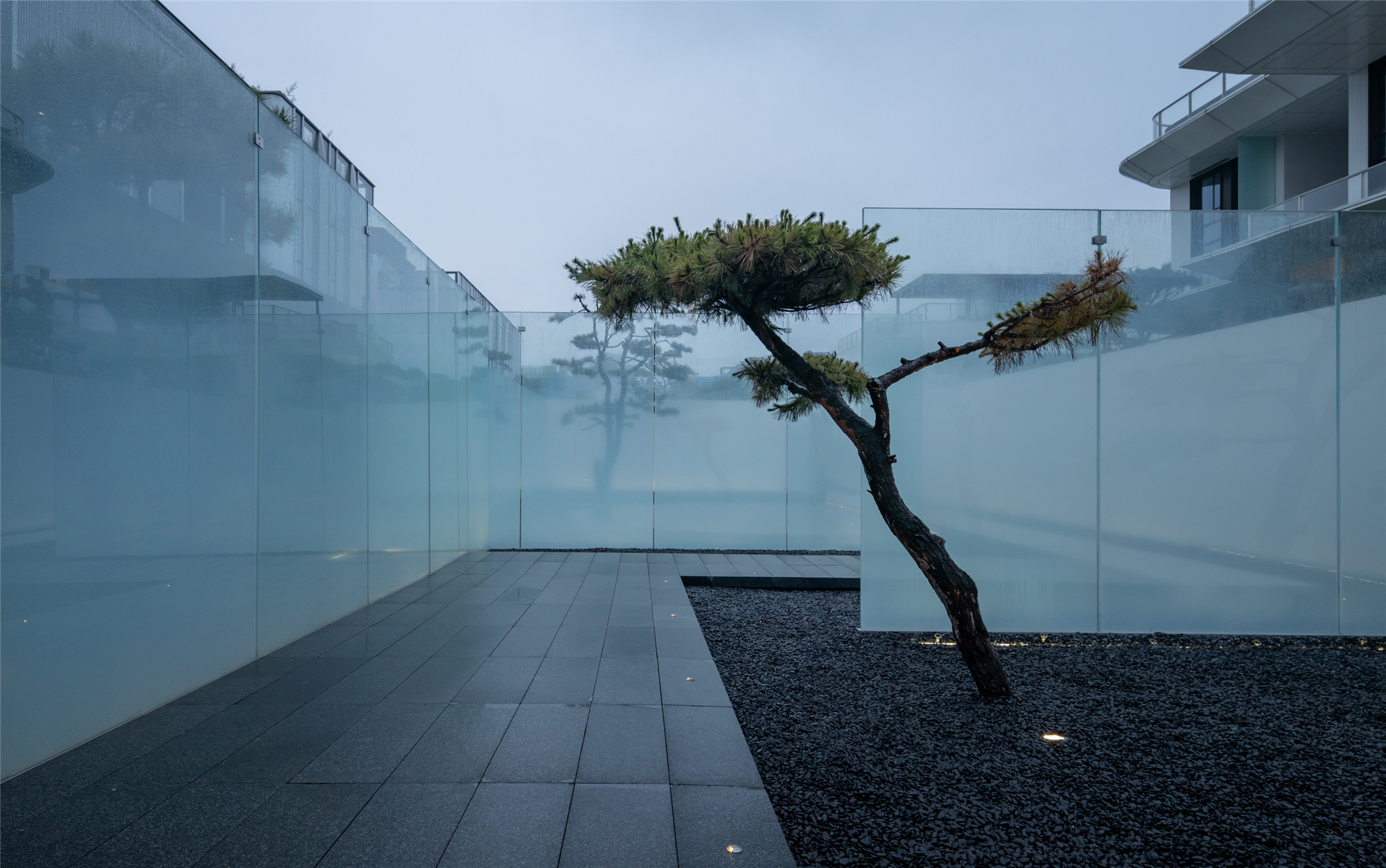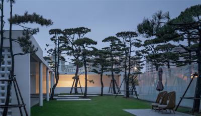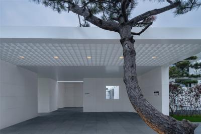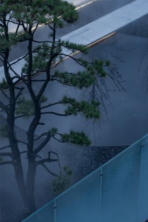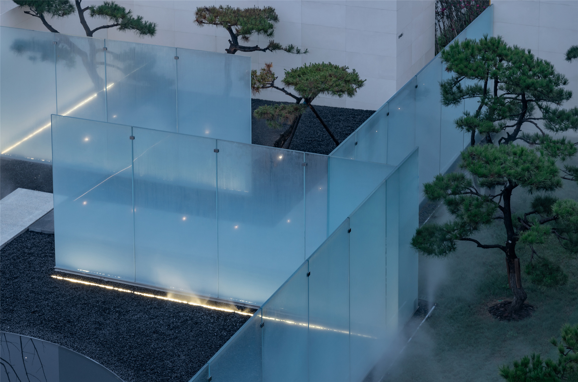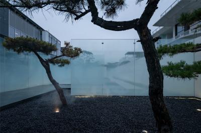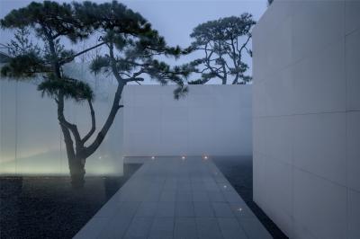 當圍合介質(zhì)從白墻變成玻璃,油松錯落分布于朦朧的玻璃后,光被遮擋與柔化,組織成云端浪漫的空間情節(jié),給予人們一種可感知的場所意象。
