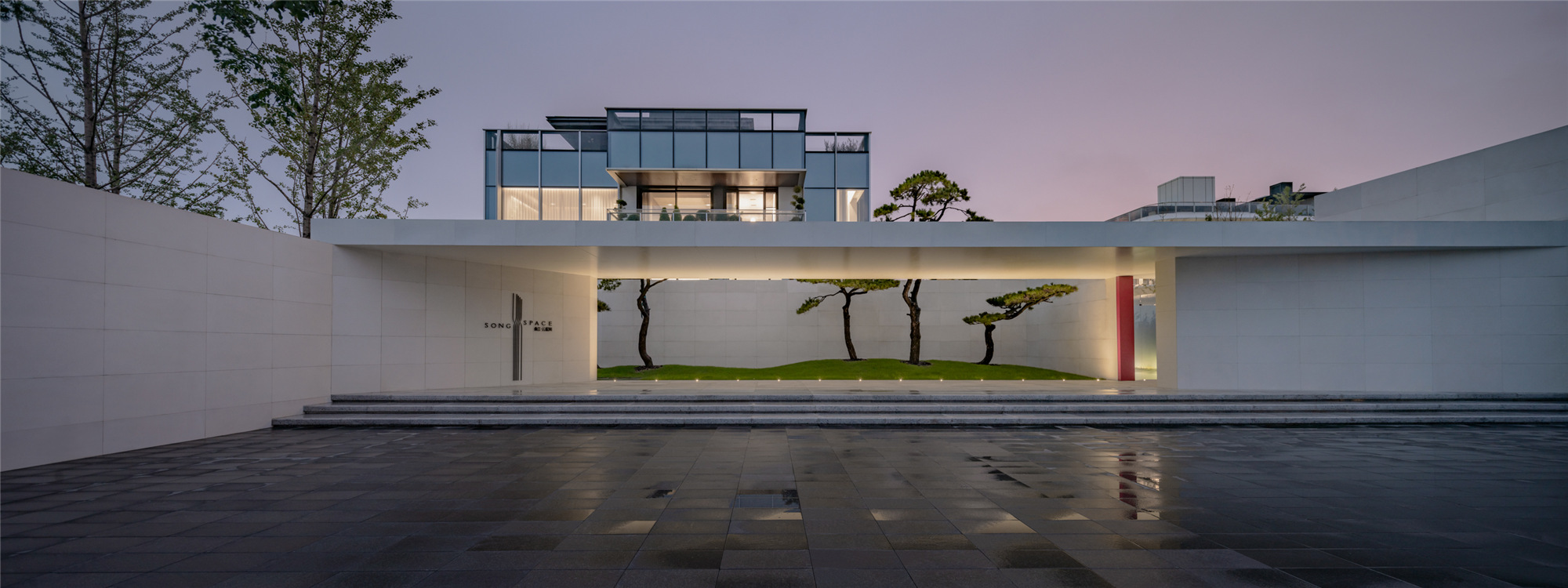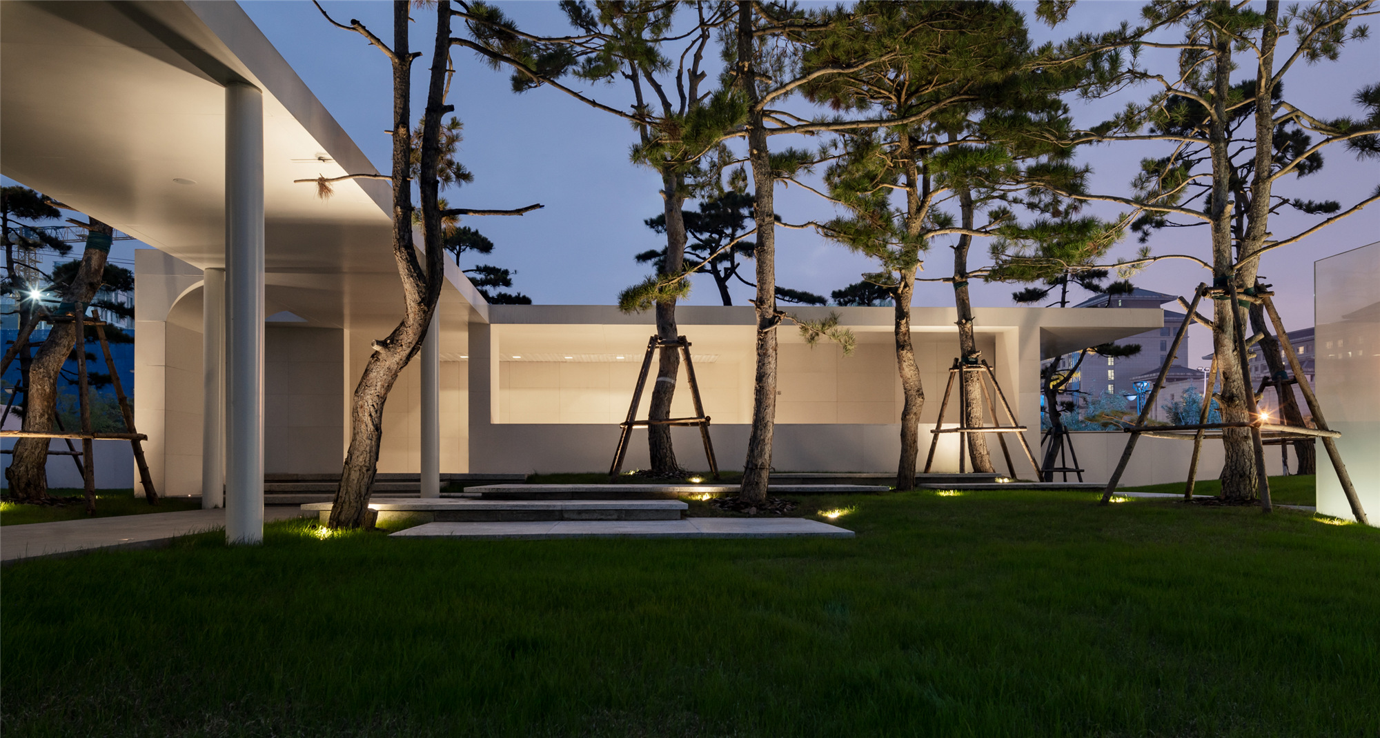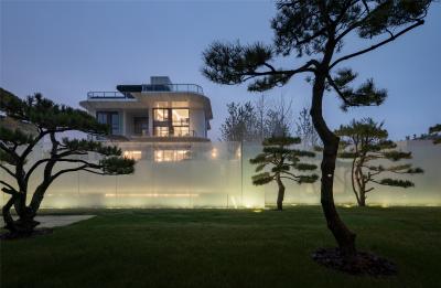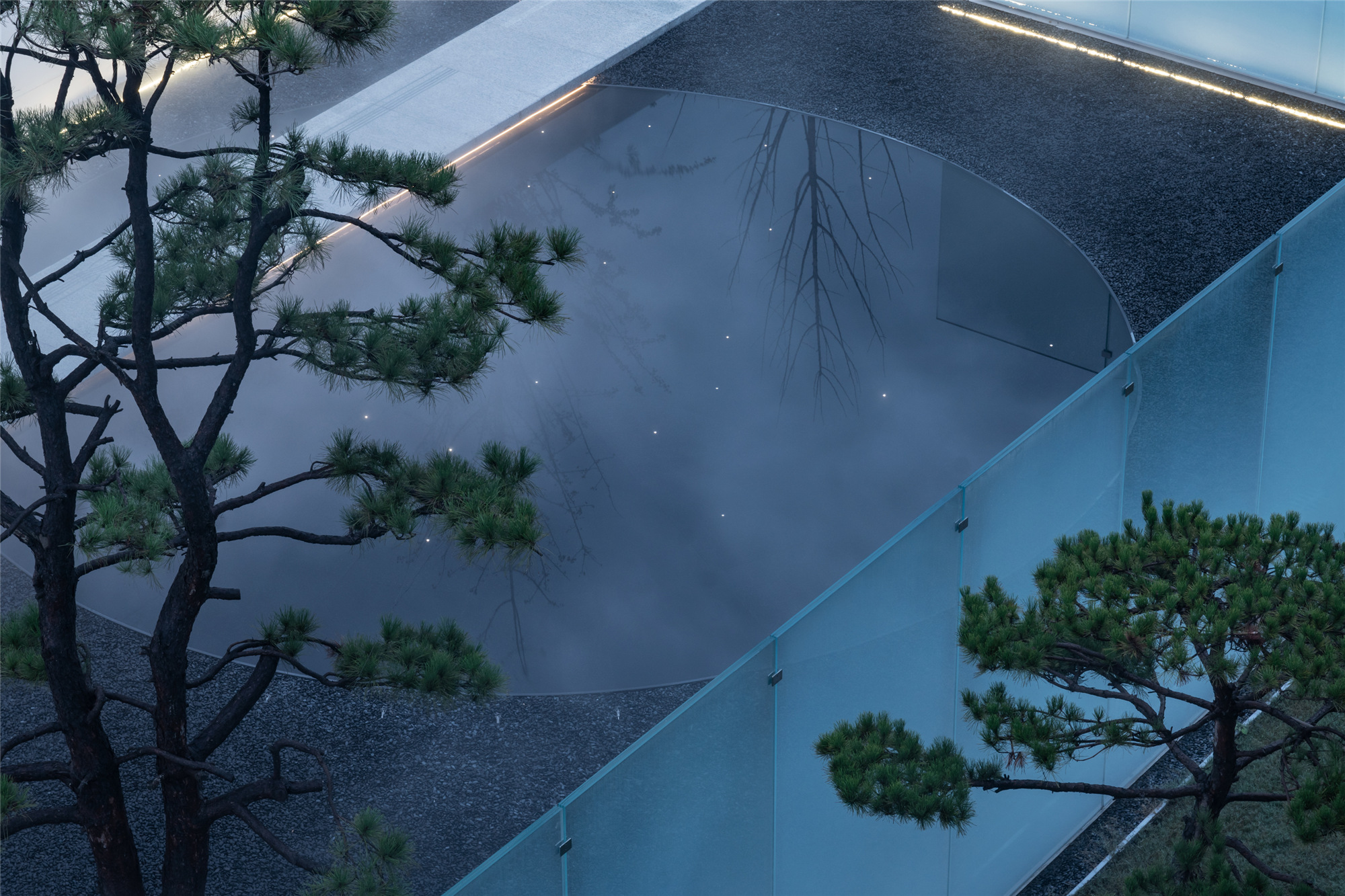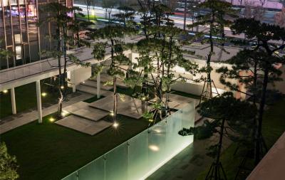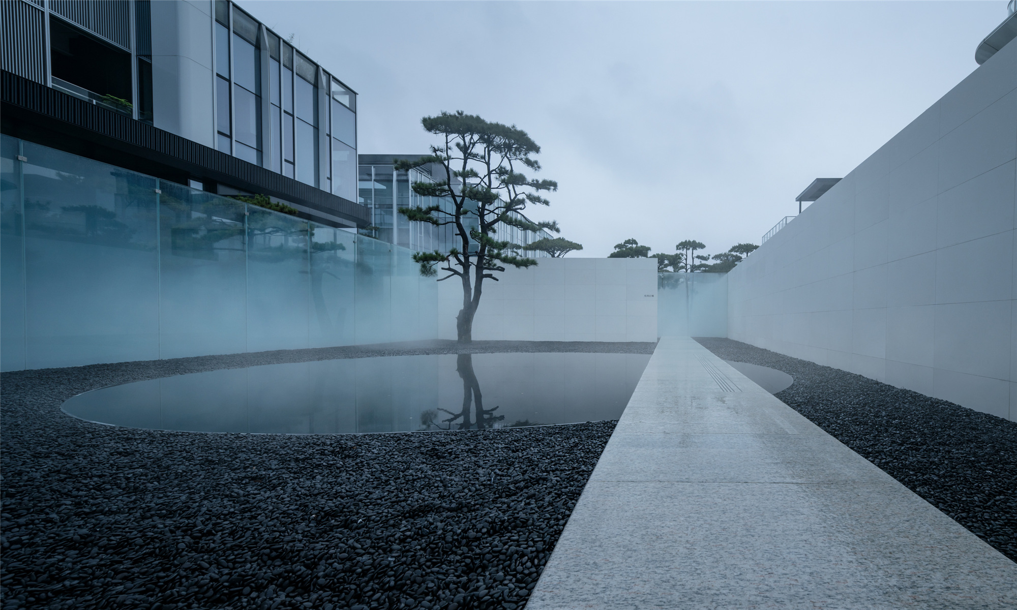 當圍合介質(zhì)從白墻變成玻璃,油松錯落分布于朦朧的玻璃后,光被遮擋與柔化,組織成云端浪漫的空間情節(jié),給予人們一種可感知的場所意象。