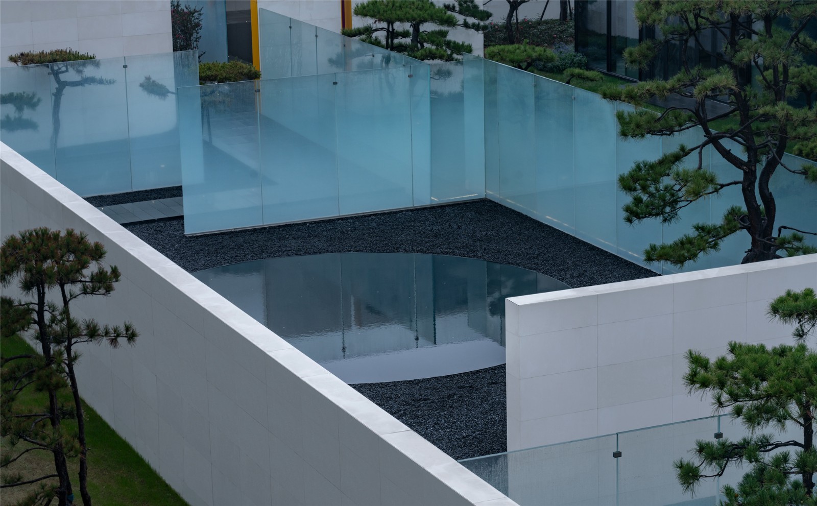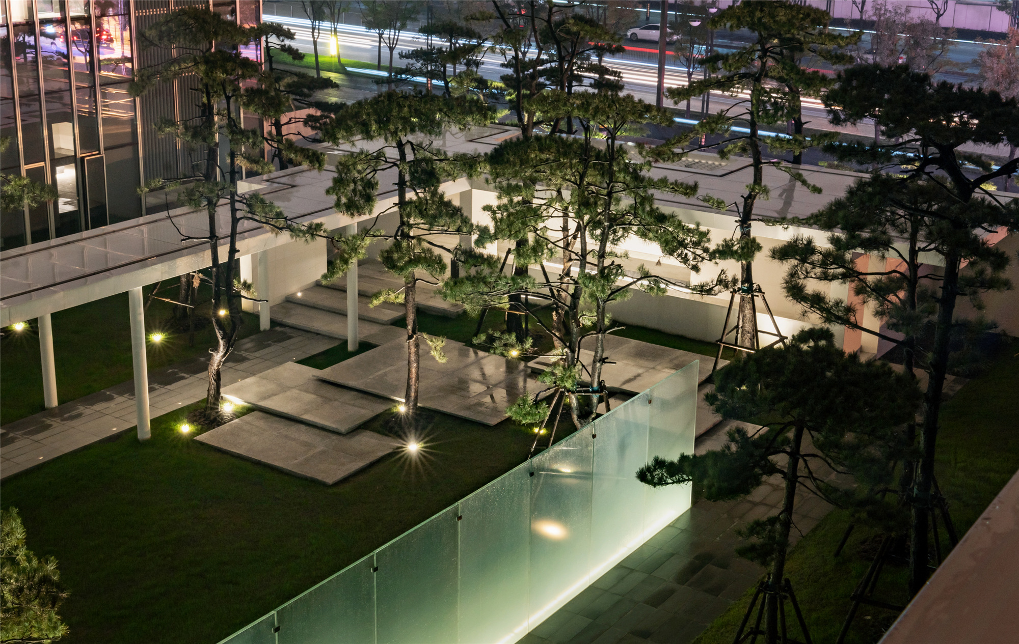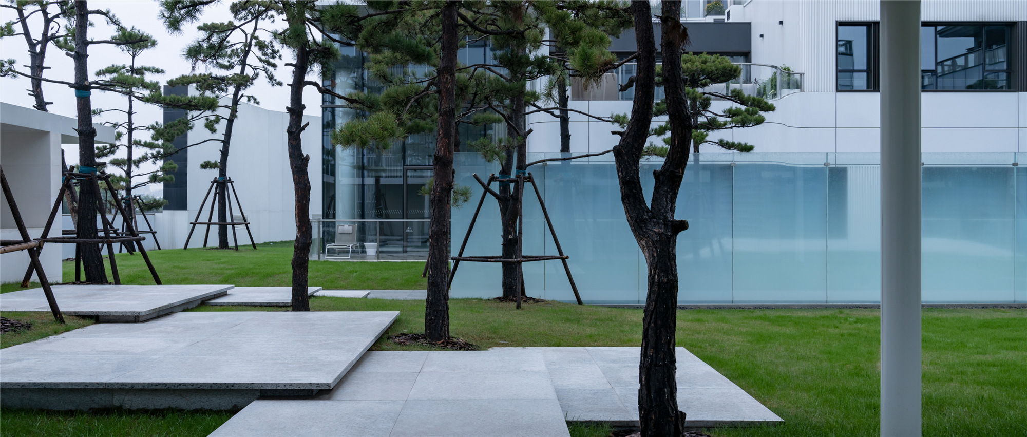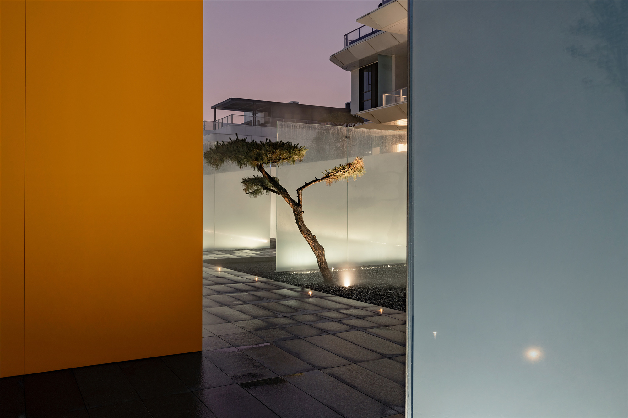 當圍合介質(zhì)從白墻變成玻璃,油松錯落分布于朦朧的玻璃后,光被遮擋與柔化,組織成云端浪漫的空間情節(jié),給予人們一種可感知的場所意象。