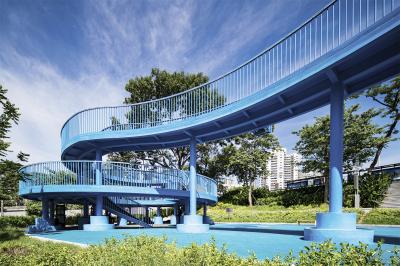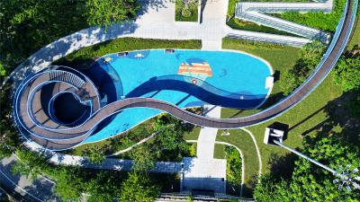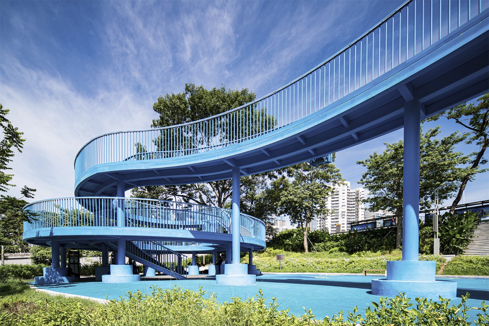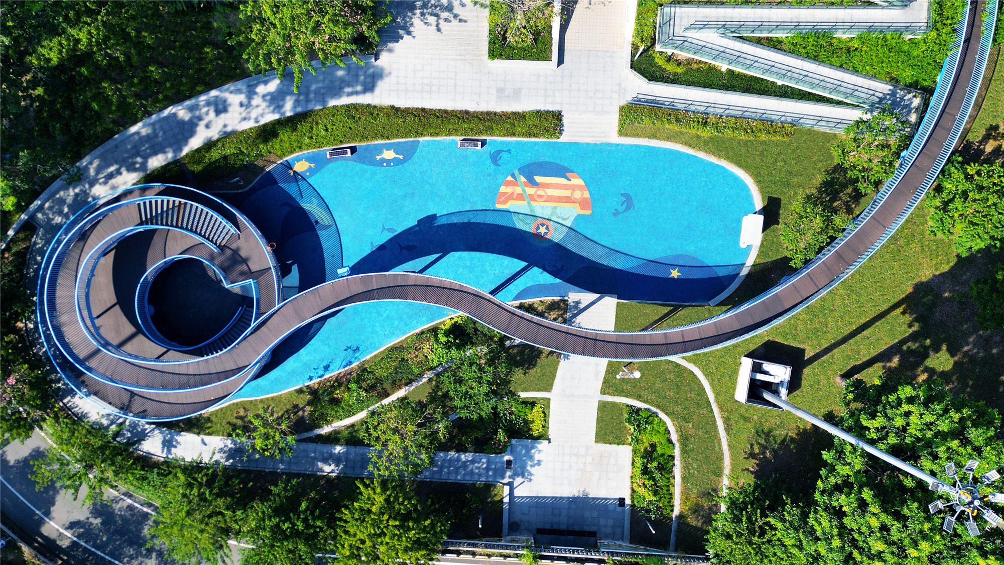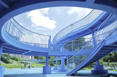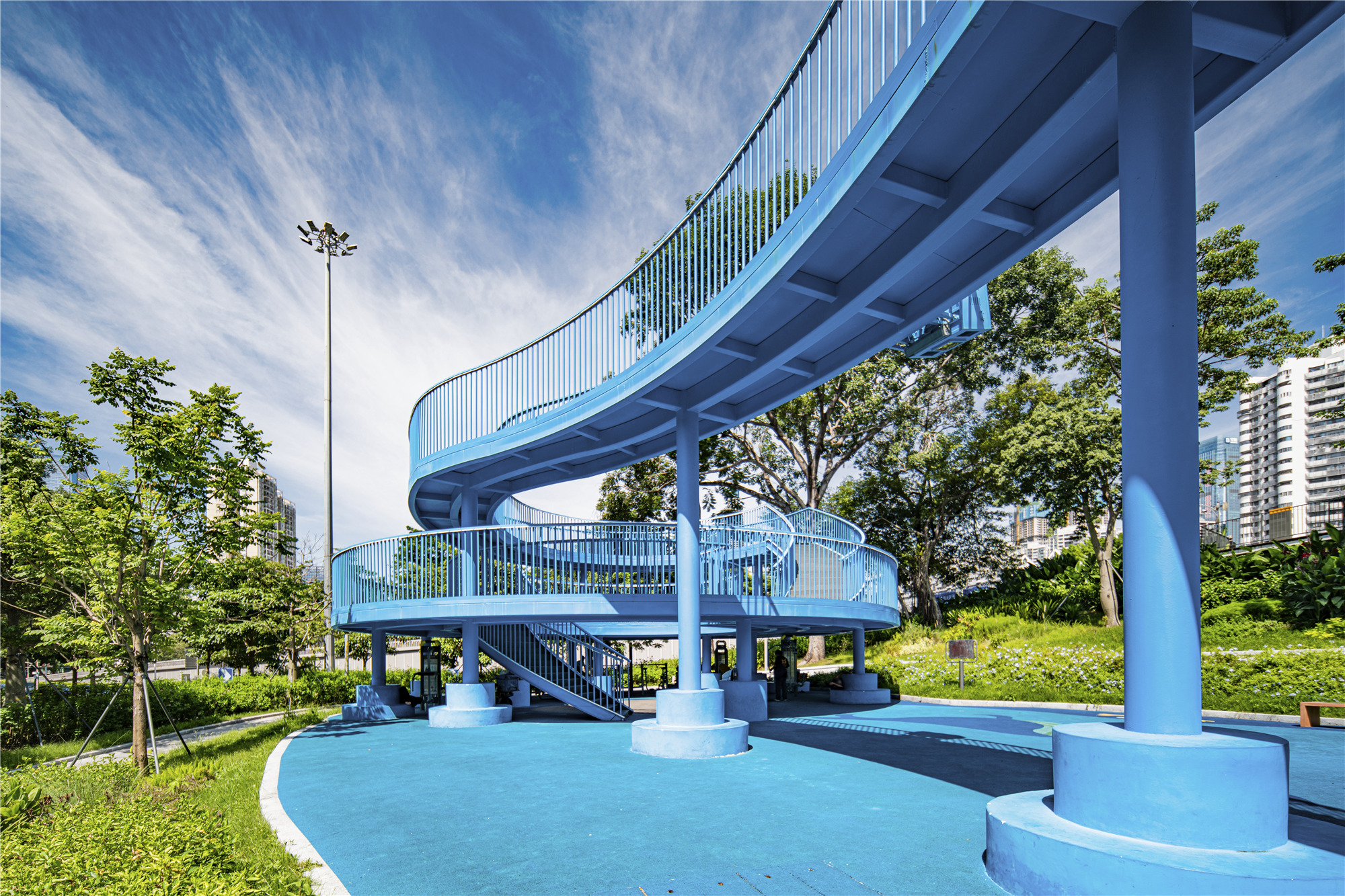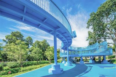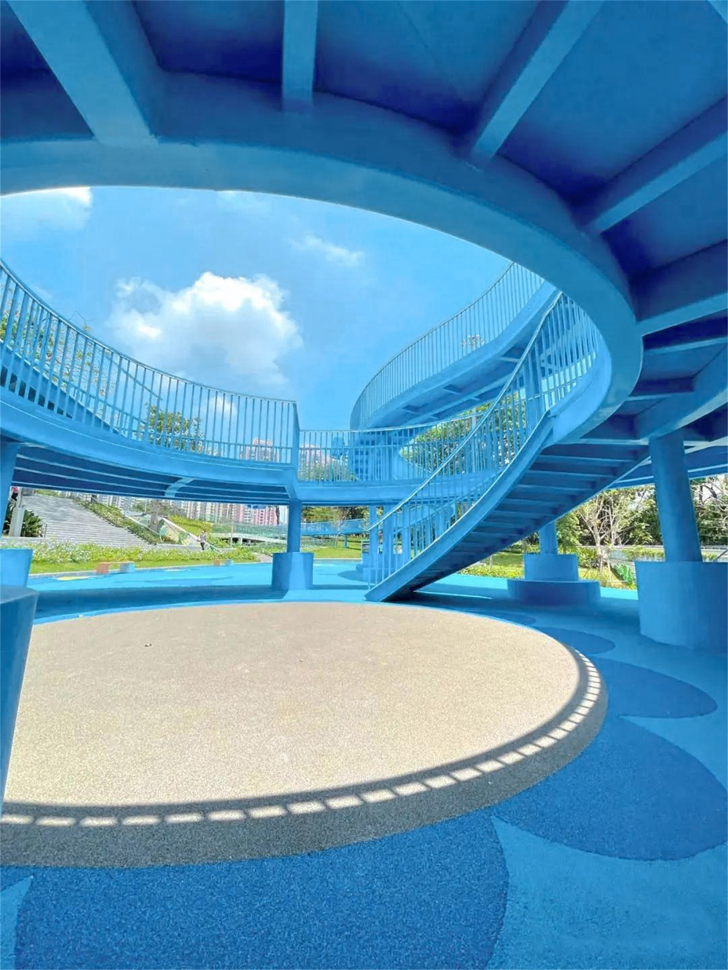設計巧妙利用場地高差優(yōu)勢,因地制宜,打造一個層次豐富的多功能旋轉(zhuǎn)式“萬花筒”觀景橋,有效銜接高差,演化為一個具有濃郁藝術(shù)氣息的標志性景觀。景觀結(jié)合5G智能燈光、藍色創(chuàng)意鋪裝打造一個供兒童游樂的“海底世界”,當兒童游玩其中,仿佛在廣闊的海洋里穿梭,寄托了孩子們對于多彩世界的暢想。