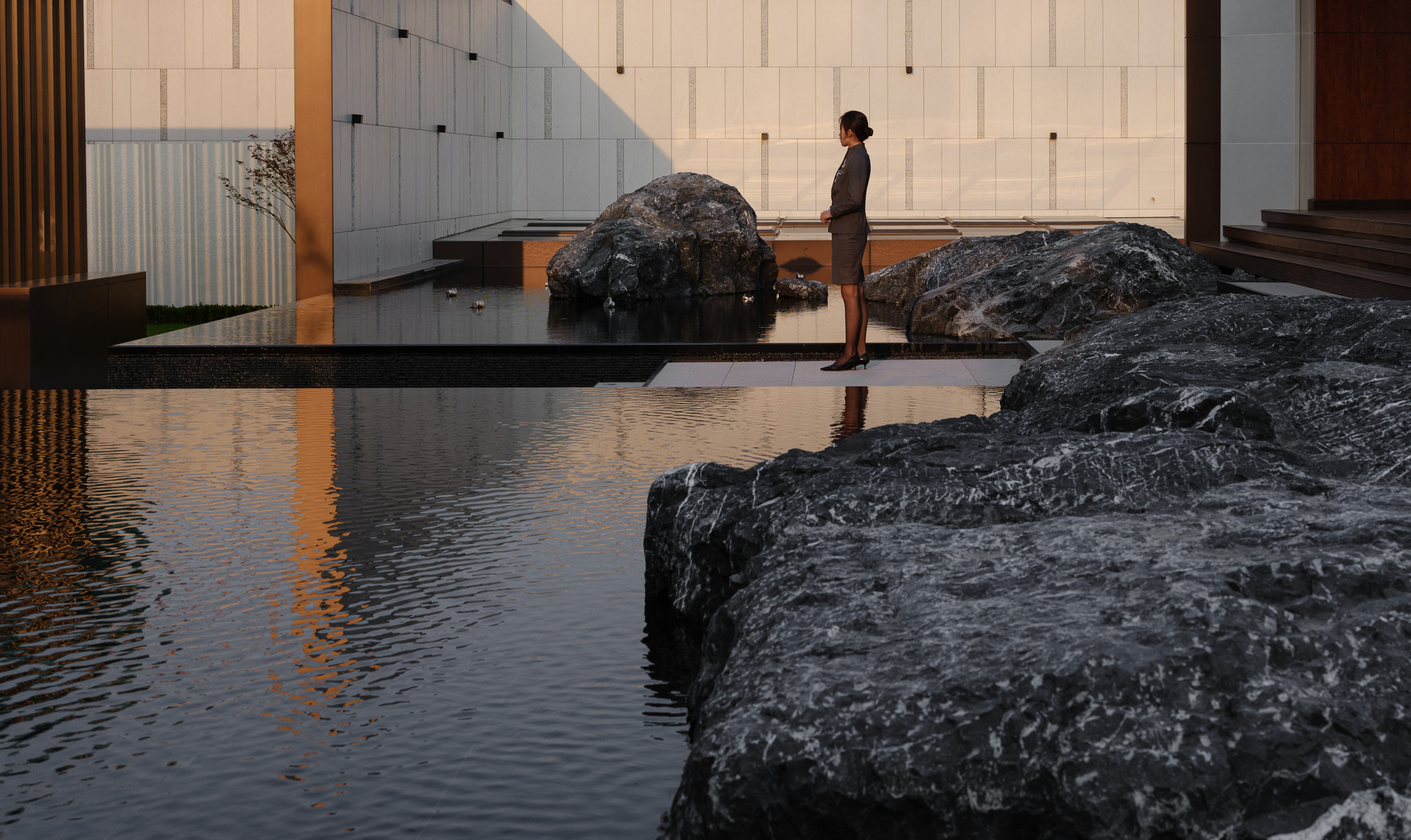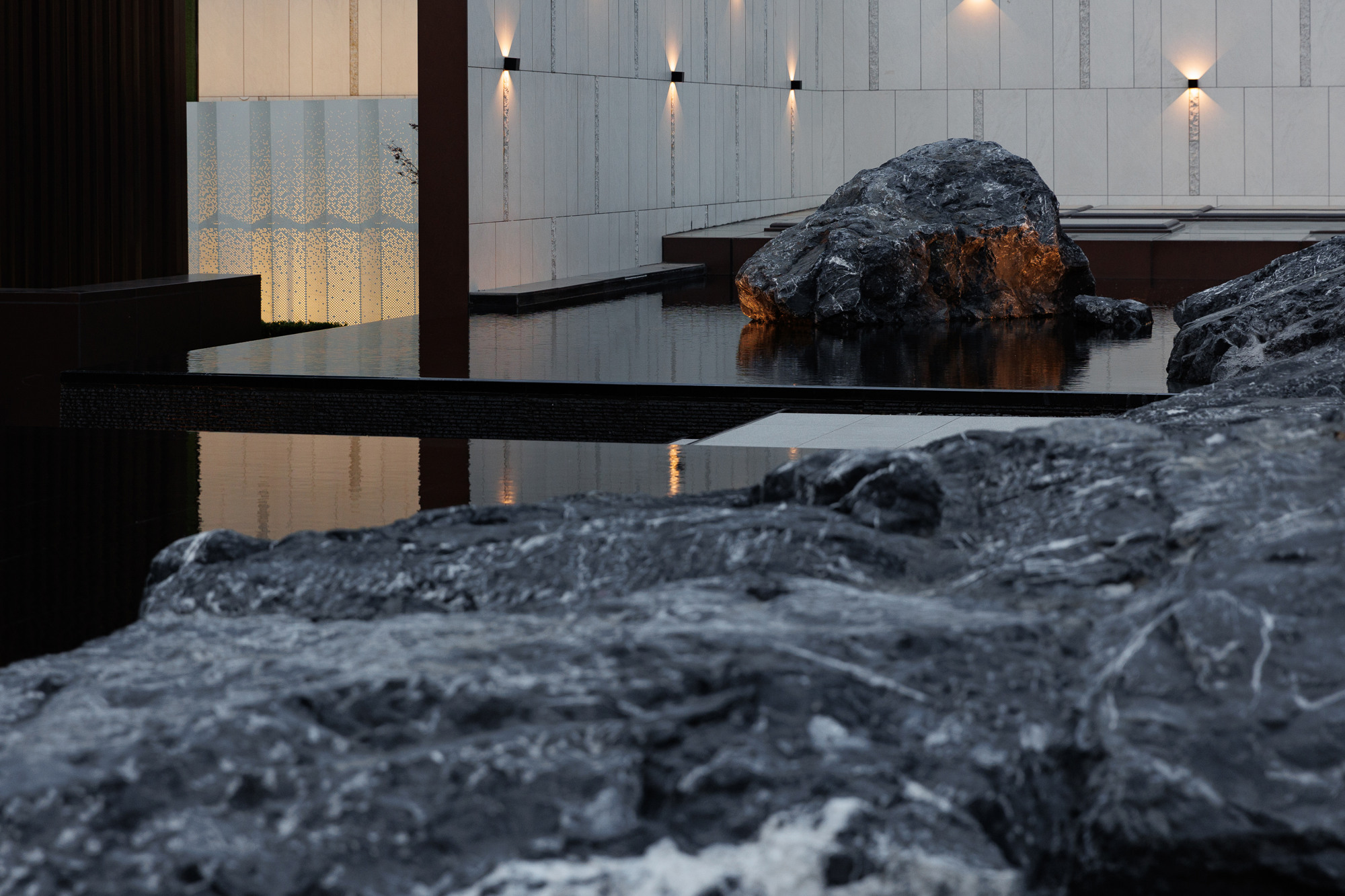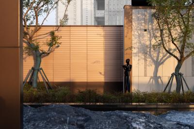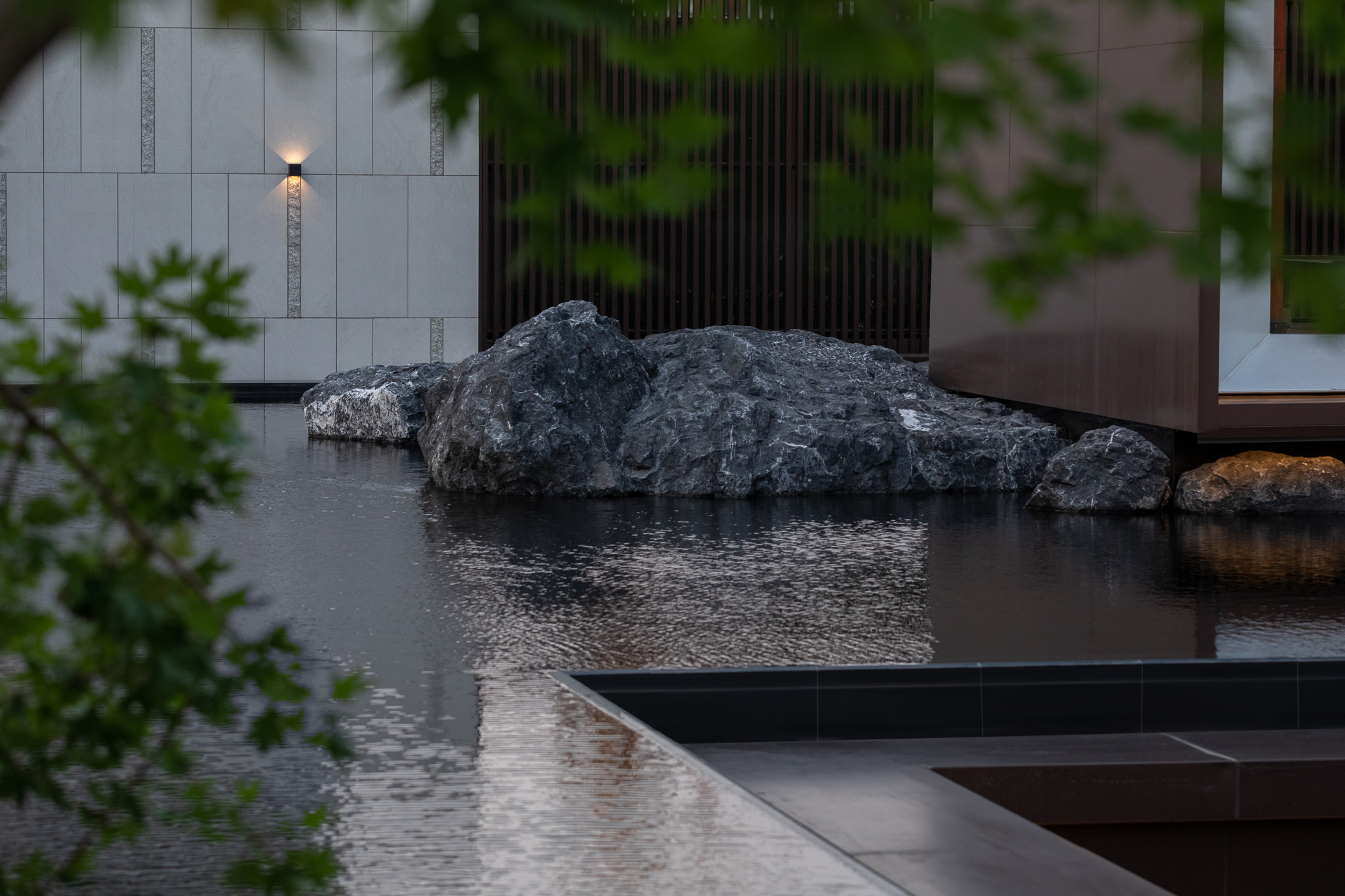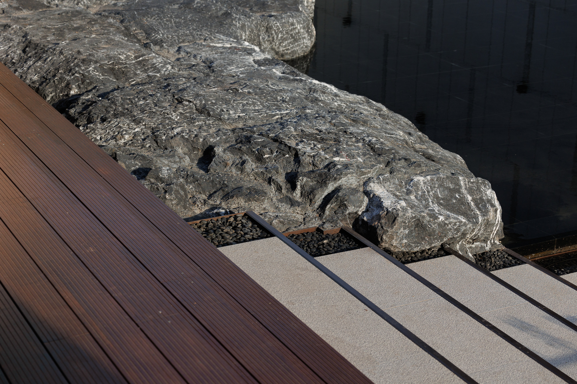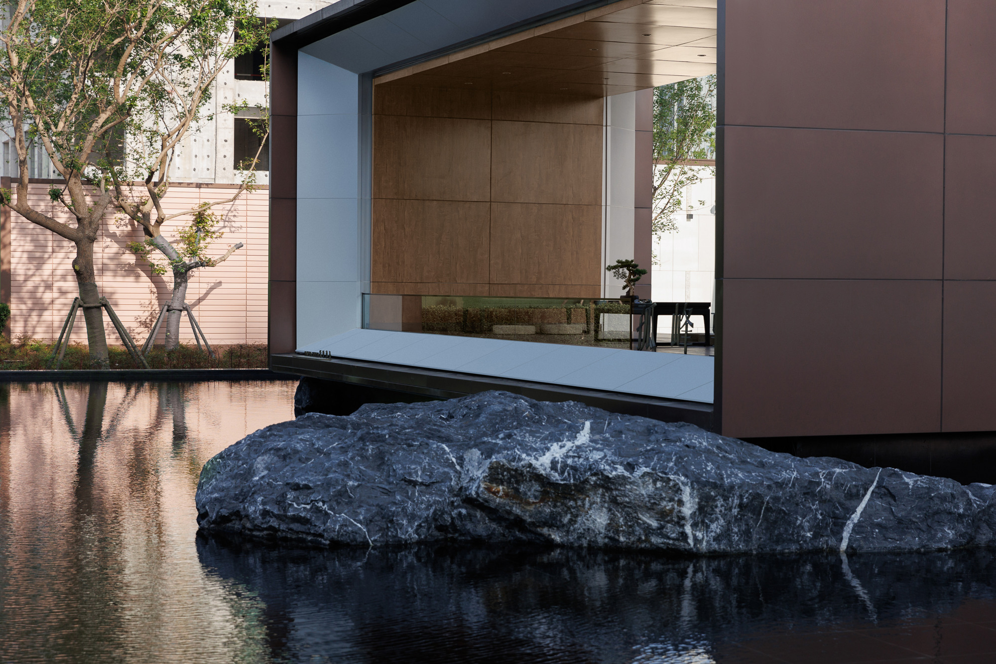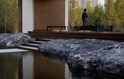 自然置石模擬山的冷冽,懸浮于鏡面水景之上,呈現(xiàn)出一種孤峰望潭之勢(shì),左右逢源,一覽眾山四海,真實(shí)、純凈、闊達(dá),空間設(shè)計(jì)當(dāng)有磐石內(nèi)核,景觀并不主觀實(shí)現(xiàn)哲學(xué),而是以客觀理性主義將現(xiàn)實(shí)哲學(xué)化。
