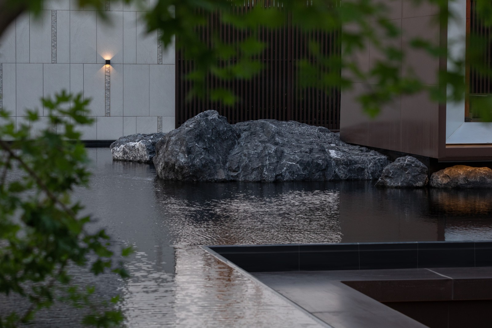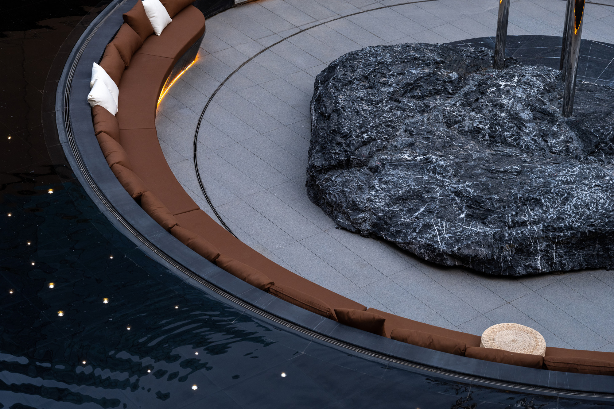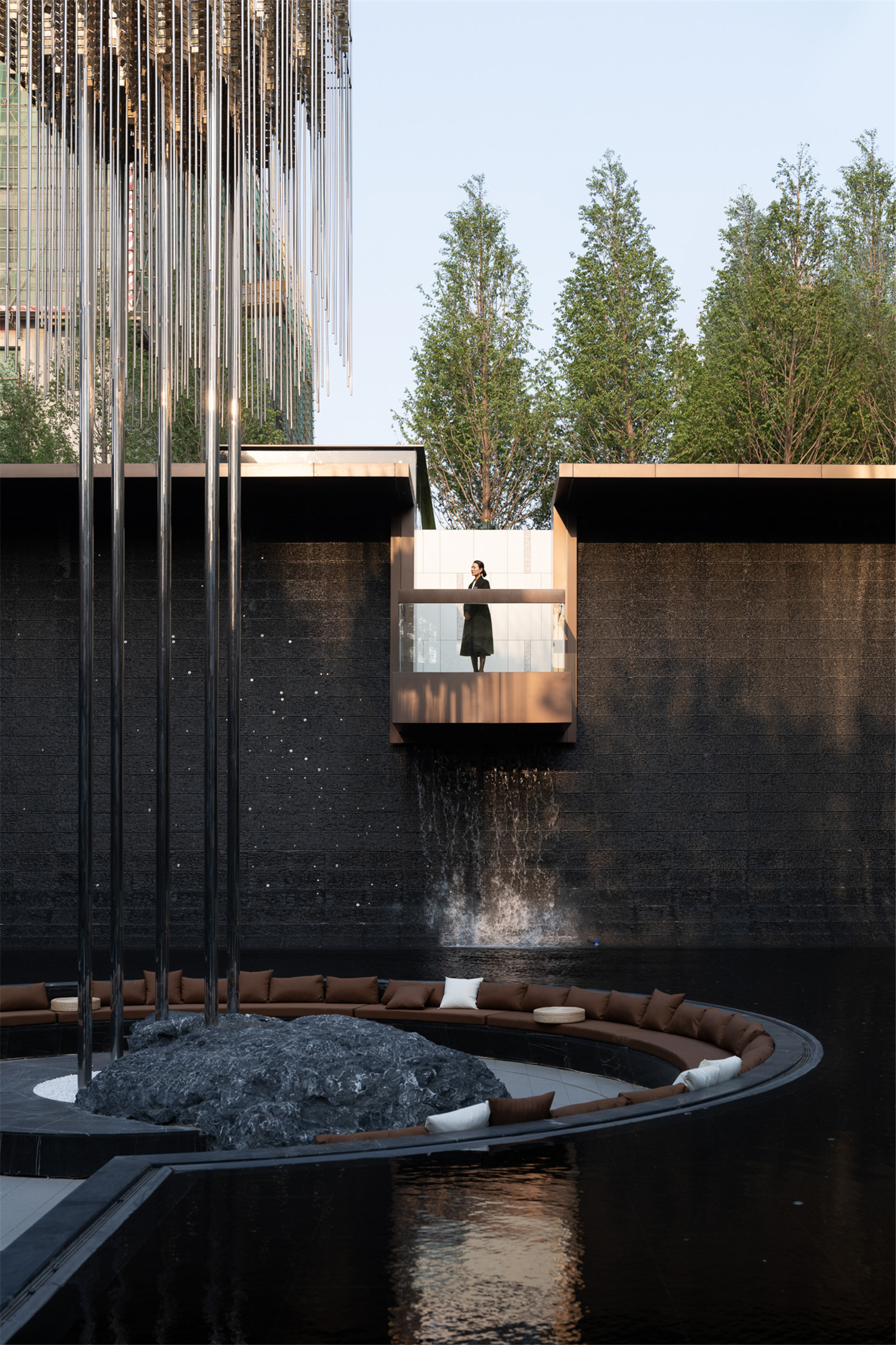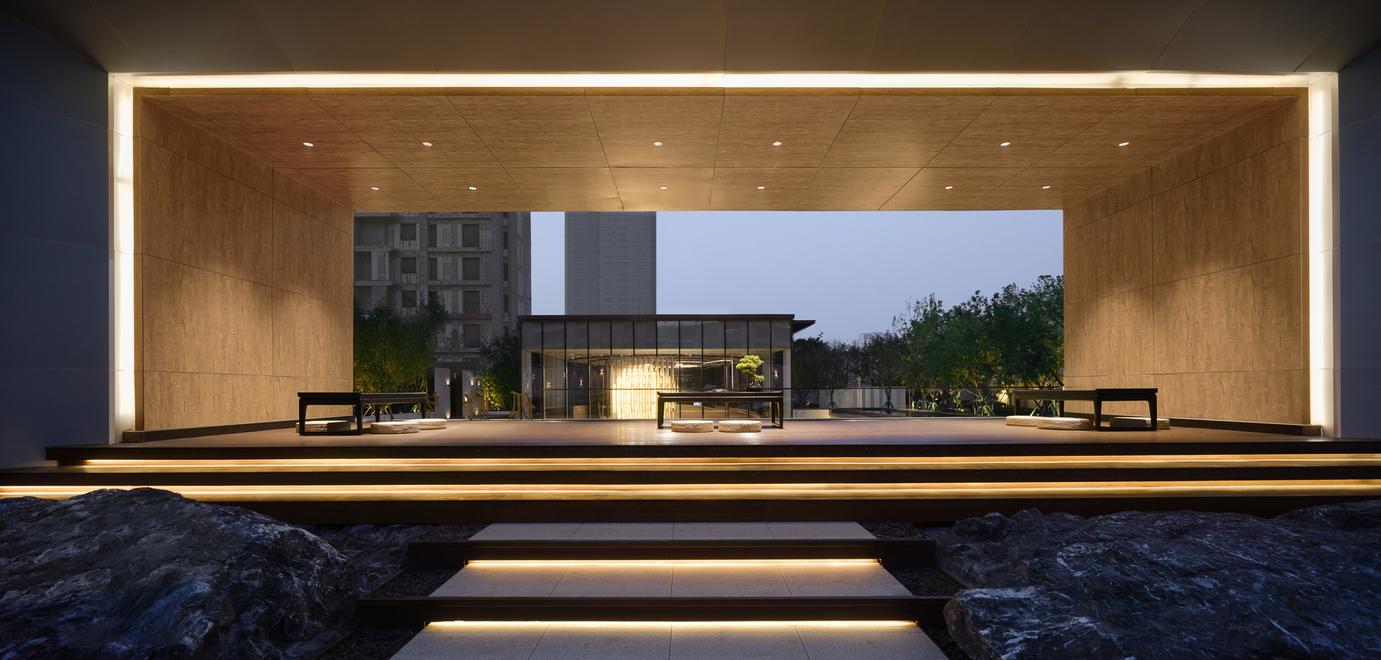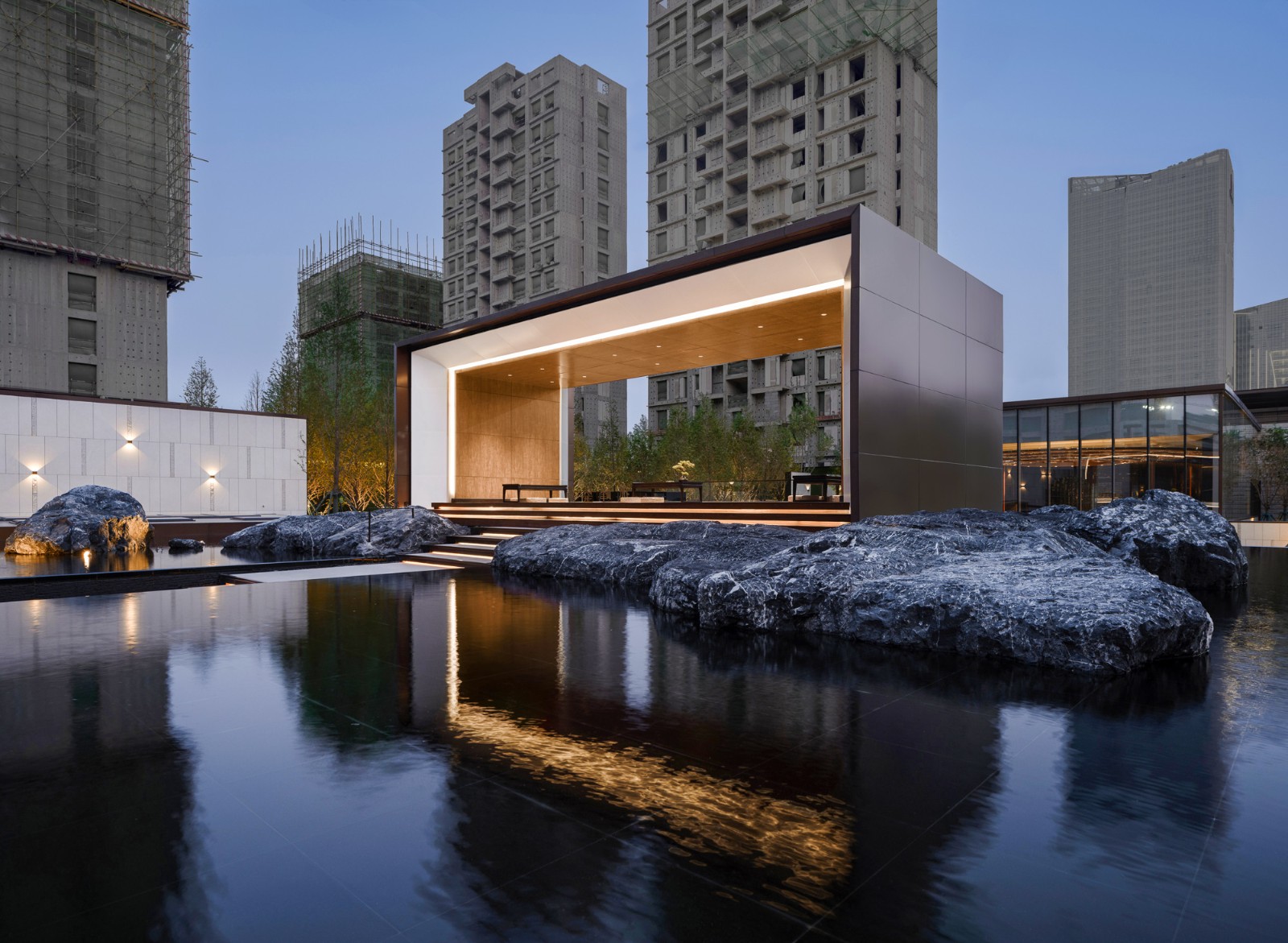 自然置石模擬山的冷冽,懸浮于鏡面水景之上,呈現(xiàn)出一種孤峰望潭之勢(shì),左右逢源,一覽眾山四海,真實(shí)、純凈、闊達(dá),空間設(shè)計(jì)當(dāng)有磐石內(nèi)核,景觀并不主觀實(shí)現(xiàn)哲學(xué),而是以客觀理性主義將現(xiàn)實(shí)哲學(xué)化。