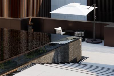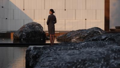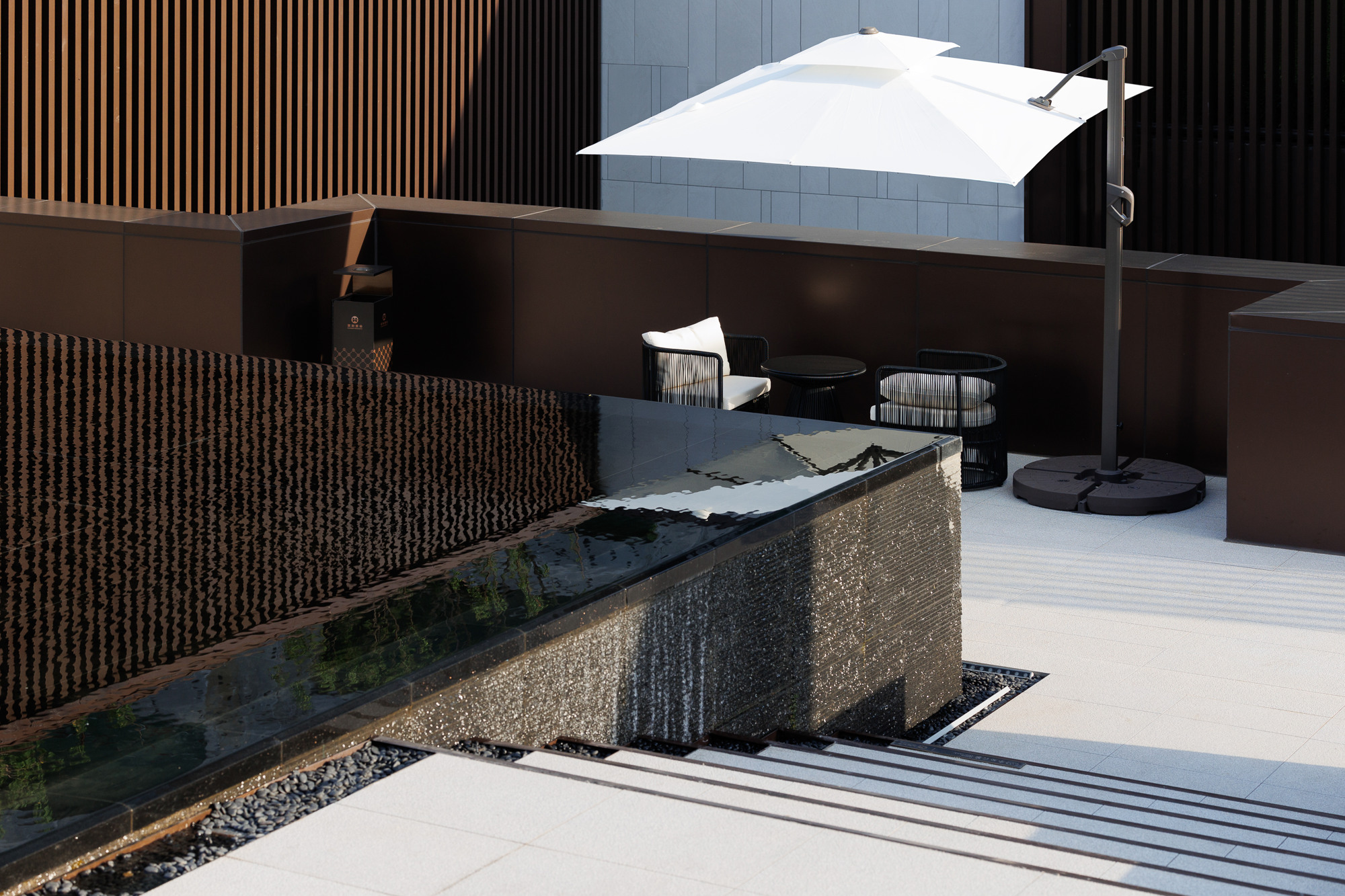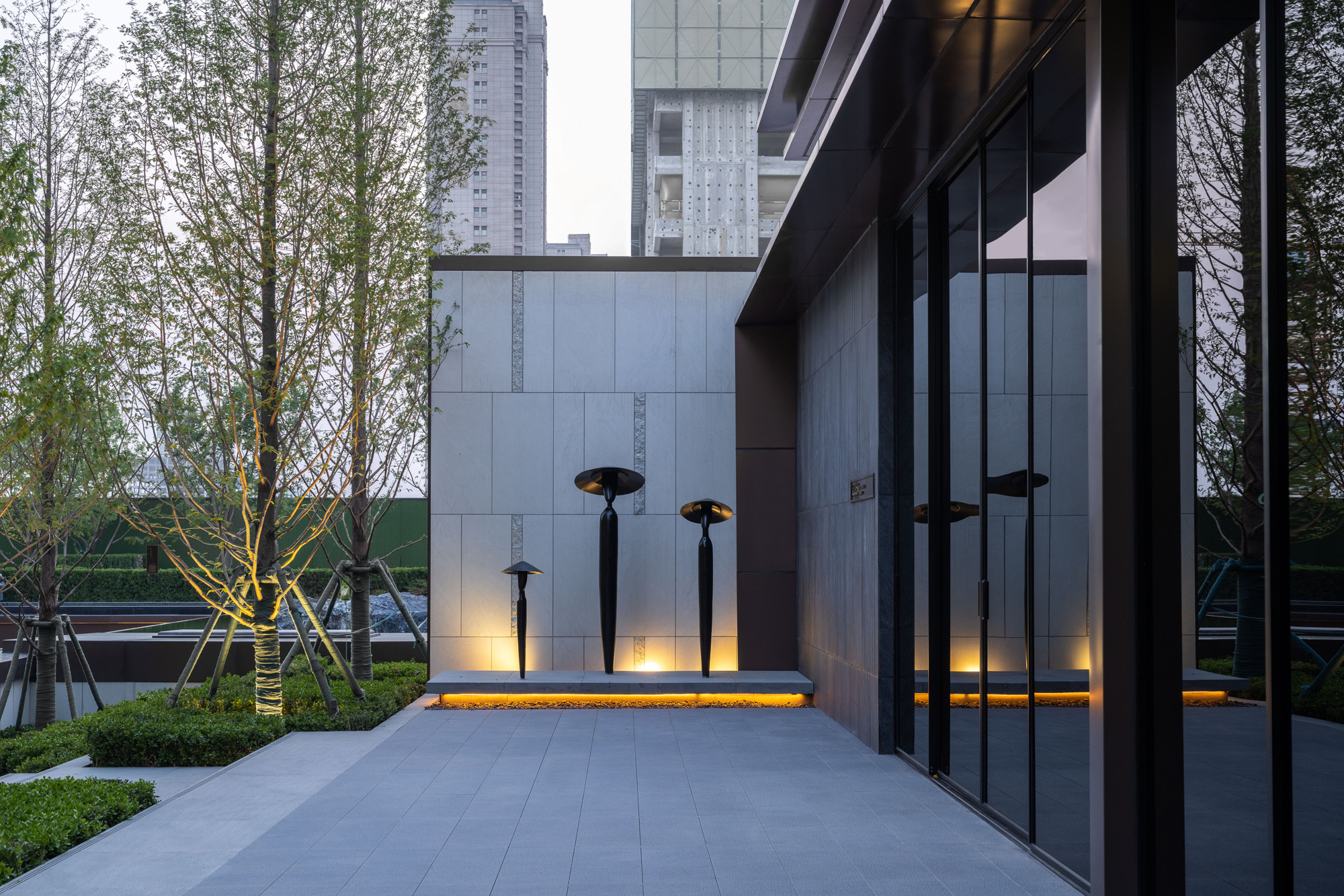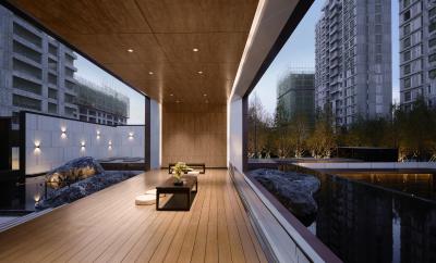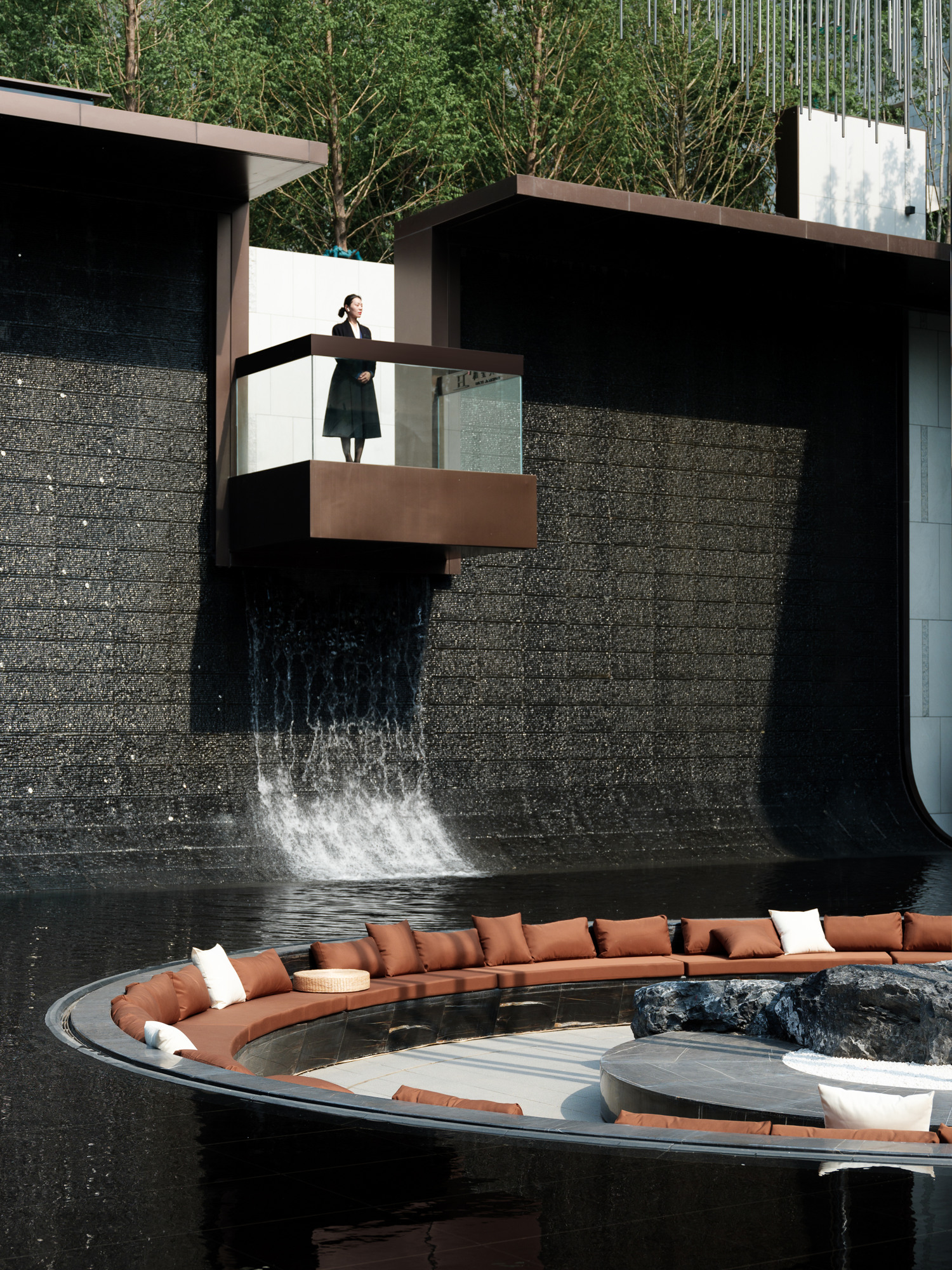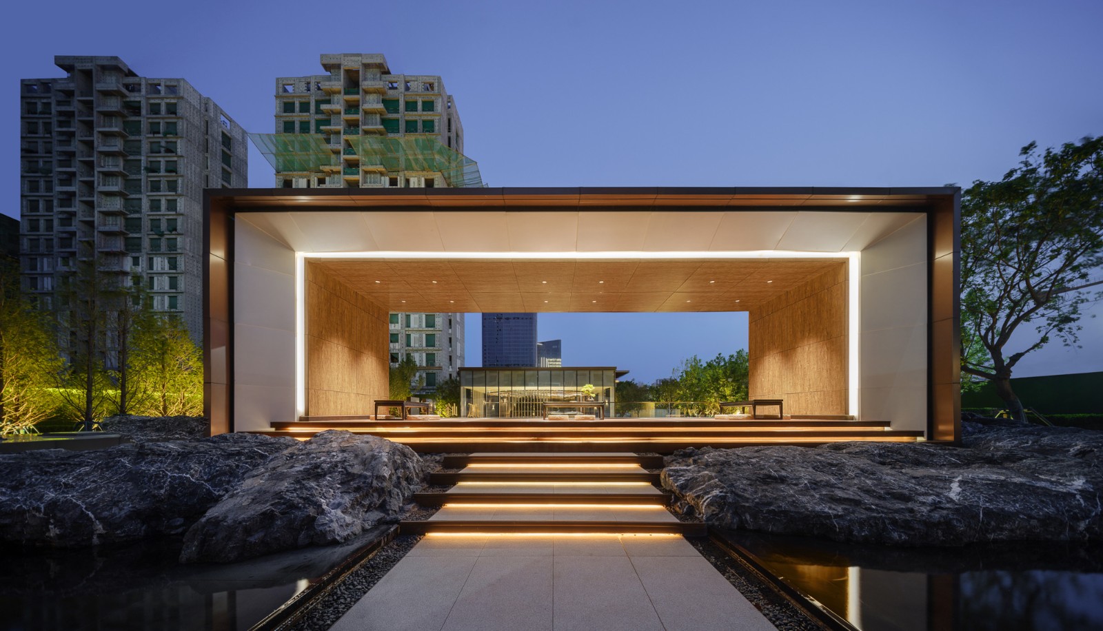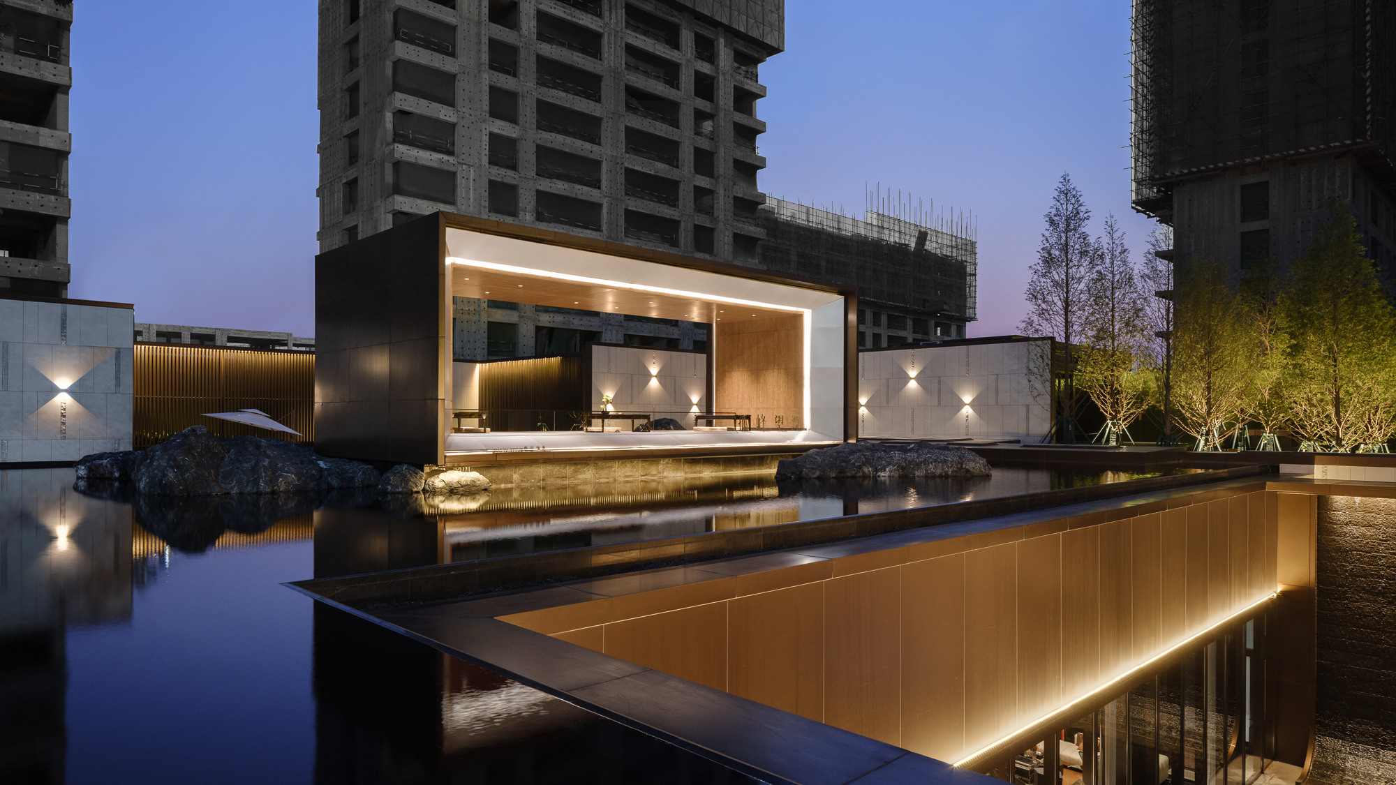 自然置石模擬山的冷冽,懸浮于鏡面水景之上,呈現(xiàn)出一種孤峰望潭之勢(shì),左右逢源,一覽眾山四海,真實(shí)、純凈、闊達(dá),空間設(shè)計(jì)當(dāng)有磐石內(nèi)核,景觀并不主觀實(shí)現(xiàn)哲學(xué),而是以客觀理性主義將現(xiàn)實(shí)哲學(xué)化。