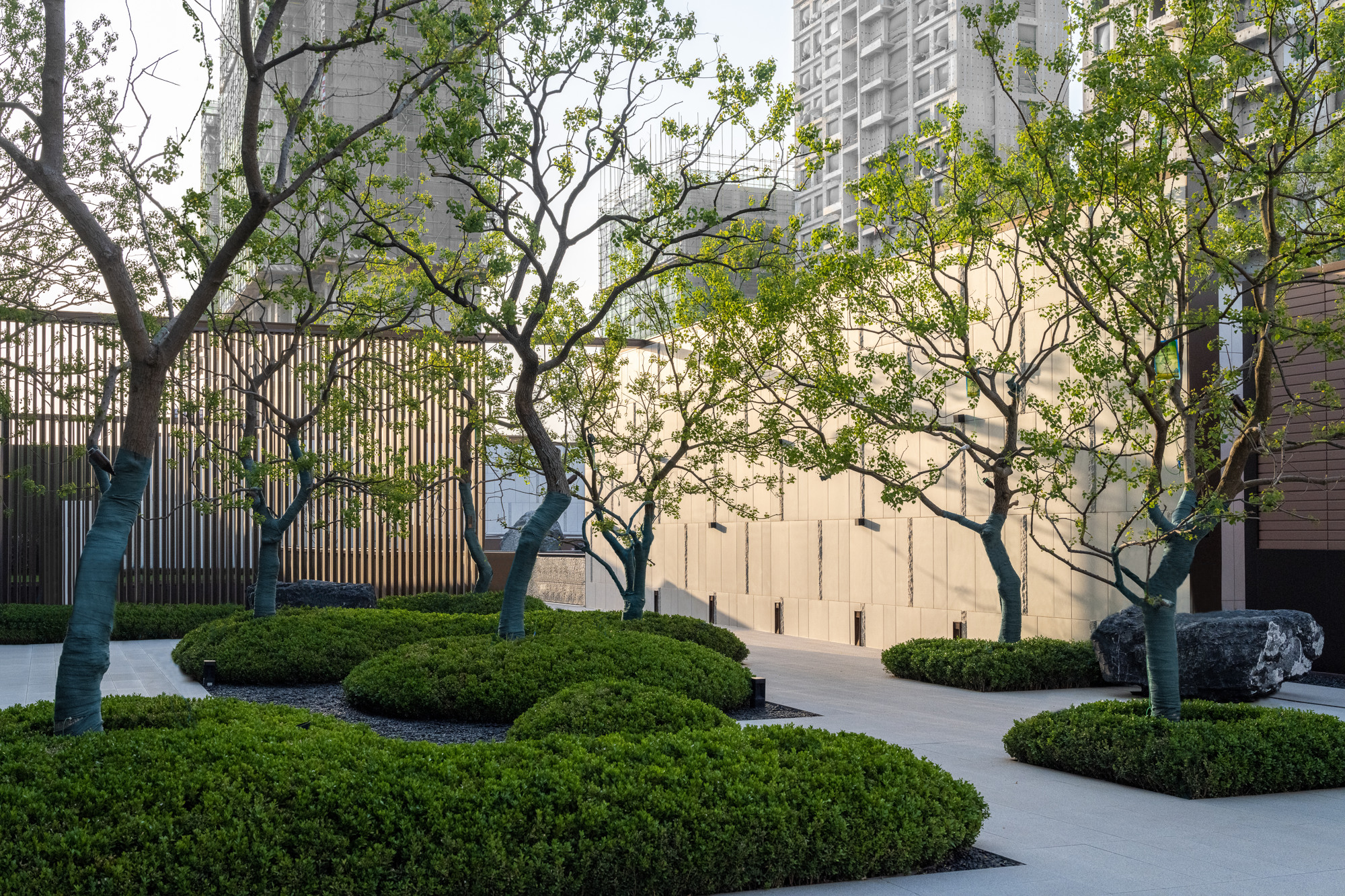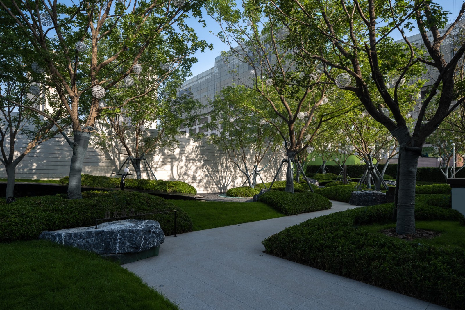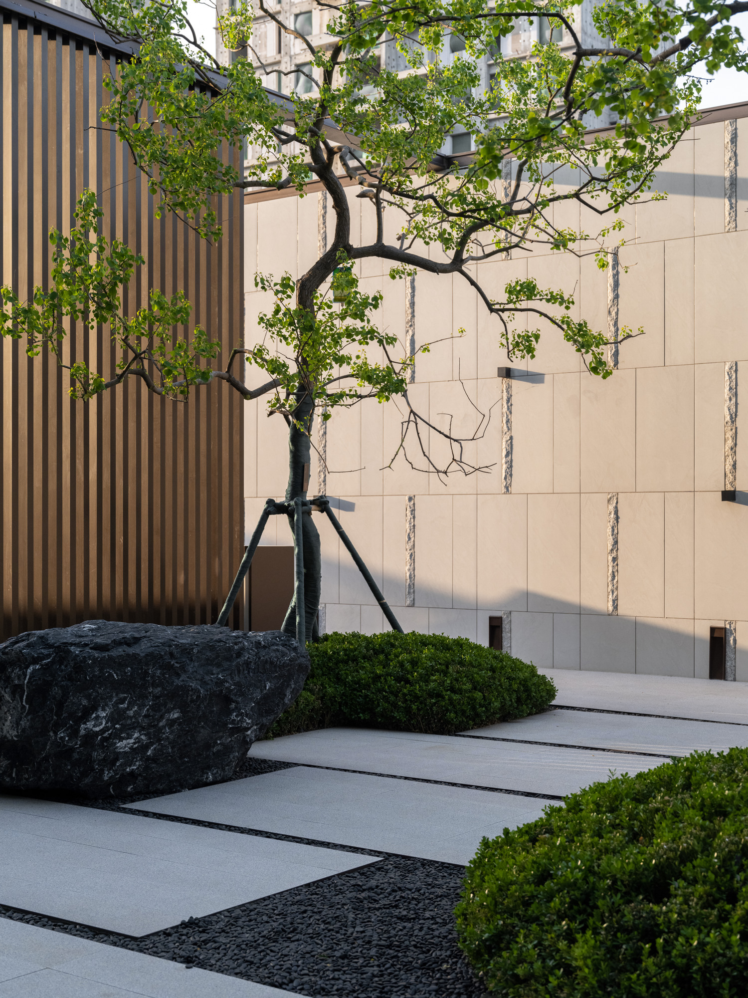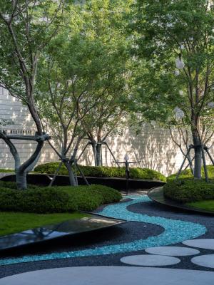 植林成院,覓歲月安然。點(diǎn)植的喬木,礫石、地被、平臺(tái)的分割,使整個(gè)空間充滿節(jié)奏感,置石點(diǎn)綴意境,豐富細(xì)節(jié)。自然永遠(yuǎn)是人類最本真的渴望,在城市中造一片林,歸于自然,在自然里共生。